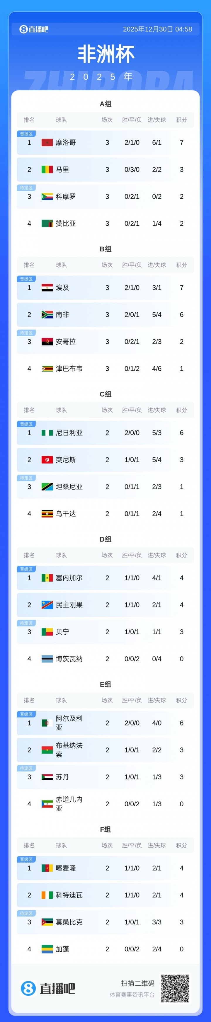 直播吧12月30日讯非洲杯小组赛A组比赛全部结束,摩洛哥2胜1平积7分锁定第一,马里3连平积3分排第二,两队晋级淘汰赛。赞比亚2平1负积2分排第三落入待定区。