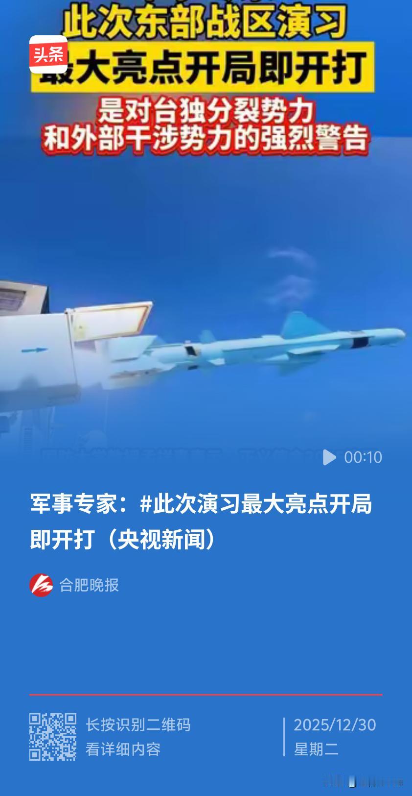 在12月29日开始的“正义使命 - 2025”演习中,多位专家指出“开局即开打”是其最大亮点。相关情况及释放信号解读如下: 与过往演习对比 以往解放军在台海的演习,特别是2022 - 2025年上半年系列演习通常是“渐次升级”,先展开兵力布势,之后逐渐升级到实弹射击。而本次演习开始不久就组织了实弹射击,东部战区的相关主战舰艇进行了舰炮射击。 专家观点含义 ● 国防大学教授张弛:“开局即打”一方面体现参演部队将实战要求贯穿演习始终,秉持“仗怎么打,兵就怎么练”原则;另一方面释放强烈警示信号,表明解放军坚决惩戒“台独”分裂势力,反对外部干涉势力。 ● 国防大学教授孟祥青:此特征展示了我军全时待战、全时能战及随时由训转战的强大能力,同时也是对“台独”分裂势力和外部干涉势力的强烈警告。 演习行动举例 当天早上7:30,东部战区发布开展“正义使命 - 2025”演习的消息;8点海空兵力实施环台岛战备警巡;9点,东部战区位台湾海峡中部海空域开展对陆机动目标打击演练,组织歼击机、轰炸机、无人机等兵力,协同远程火力进行相关演练。