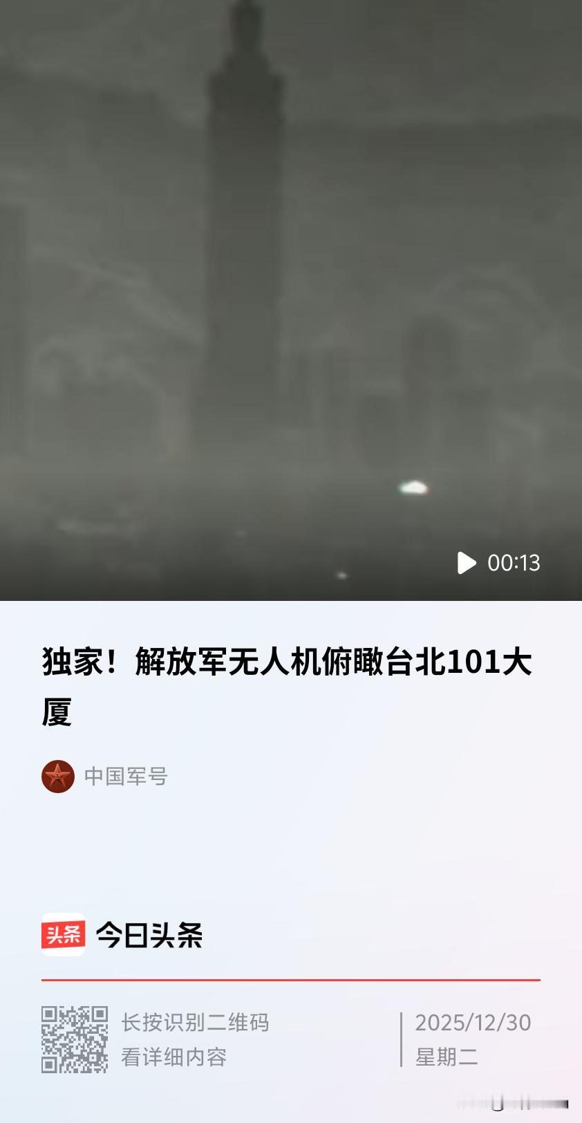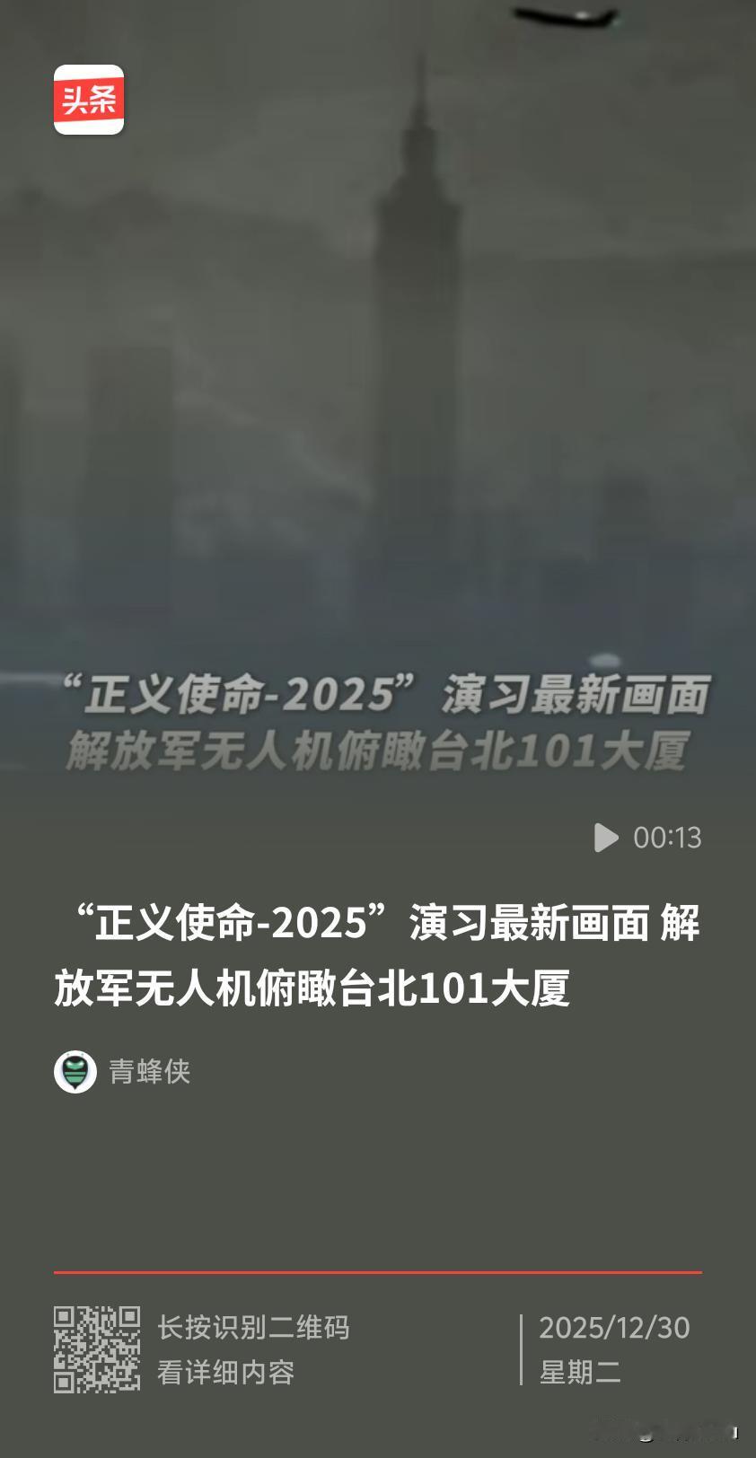 2025年12月29日,东部战区“正义使命 - 2025”环台岛战备警巡演习中,解放军无人机清晰俯瞰台北101大厦全貌,窗格细节与建筑轮廓一览无余,经官方媒体发布后,成为彰显国家主权的标志性场景。 技术层面突破 ● 超低空突防能力:画面显示无人机与台北101同框时,背景有民航客机起飞,表明其能在复杂空域隐蔽穿行,可能采用掠海或贴地飞行,利用地球曲率和地形匹配技术规避雷达探测。 ● 长焦稳定成像技术:台北101高508米,无人机在数公里外仍能清晰拍摄窗格细节,需搭载高分辨率光电吊舱和先进图像稳定系统,标志中国侦察监控体系实现“从太空到街景”无缝衔接。 ● 实时数据链传输:无人机需将高清影像实时回传指挥中心,要求具备抗干扰、高带宽通信能力,可能采用量子加密通信技术确保信息传输安全。 战略层面意义 ● 主权宣示:台北101被“台独”势力包装为“台湾象征”,但本质是中国台湾省地标。无人机画面宣告台湾是中国领土不可分割的一部分,彰显主权,任何分裂行径无法阻挡统一。 ● 威慑“台独”及外部势力:赖清德当局上台后破坏台海和平,外部干涉势力对台军售。此次行动表明解放军有能力挫败“台独”分裂图谋,捍卫国家主权和领土完整。 ● 实战化预演:无人机与台北101同框暗示其可能具备目标指示、电子压制、集群攻击等作战能力,体现解放军现代化作战能力和“侦察 - 引导 - 打击”完整作战链条。