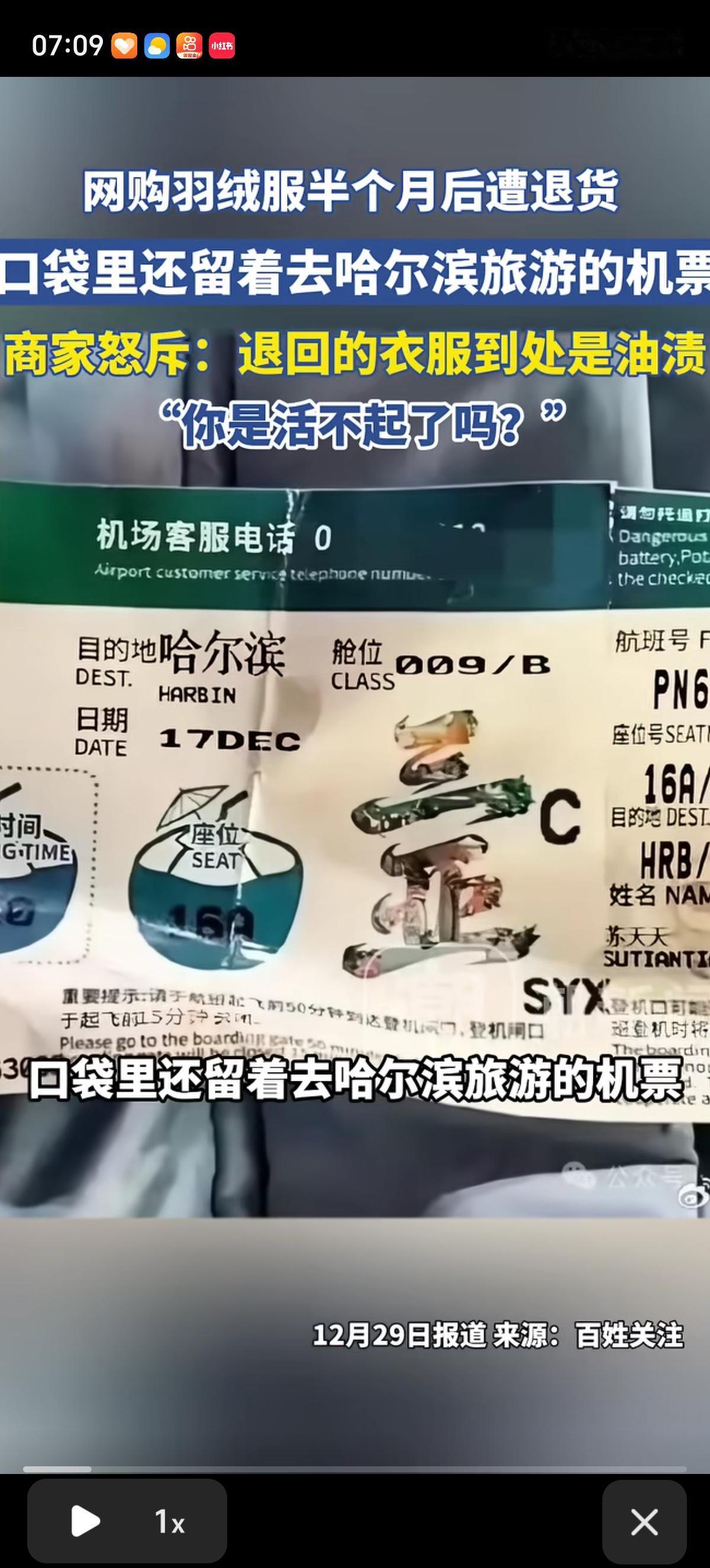 海南一女子网购羽绒服后半个月就以质量问题退货了,羽绒服口袋里还放着去哈尔滨旅游的机票,吊牌也没摘。白嫖的明明白白,羽绒服胸口还有油,领子口都发黑了。 出门去玩带着那么大的吊牌也是没谁了,生怕别人看不见啊,哈尔滨的网友不少发现带着羽绒服或者帽子吊牌不摘的人,合着都去哈尔滨玩了吧,哈尔滨的松花江冰雪嘉年华正好开业了,哈尔滨的中央大街创意灯饰“冰雪之冠”也挺好看的。 这回被退羽绒服的商家挺生气的,直接说买家是活不起了吗。 海南的苏女士退的这款羽绒服才633元,还没有去哈尔滨玩一趟花的钱多呢。苏女士主张羽绒服是二次销售产品,她称收到的羽绒服有明显的穿过的迹象,比如衣服上有污渍、毛发,且口袋里还有疑似他人遗留的物品。 不过从商家角度,这些痕迹也被质疑是苏女士使用后造成的,真是公说公有理、婆说婆有理啊。家人们觉得应该是咋回事呢?