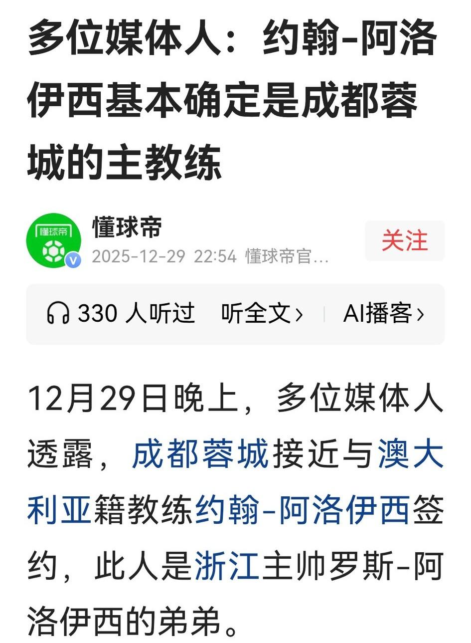 蓉城要聘澳大利亚人约翰·阿洛伊西为主帅,在蓉城乃至全国球迷中炸响一颗惊雷。 毕