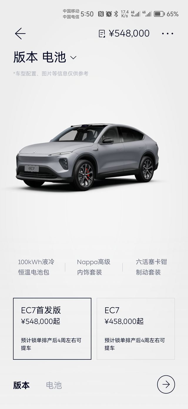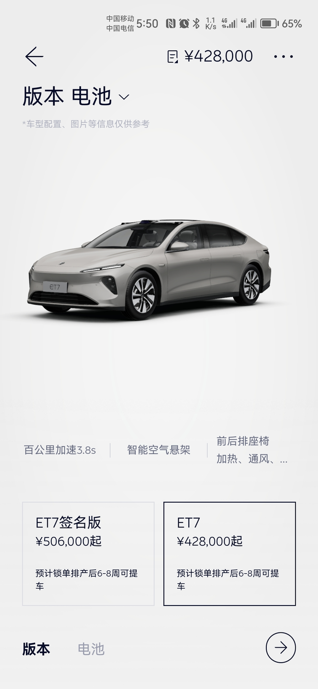 APP的变化不知大家注意到没有 我没记错的话若干天前ES6预订界面显示的提车预计时间还是5周,现在则是3-4周,EC7从4-5周(还是5-6周)变成4周,ES7和ET7则从3周变成了6-8周。 侧面反应产能确实在很努力地爬升,不太走量的7系车为5566让步,极大可能ES7会因为量太少慢慢停掉准备大改款,ET7在5566全面完成爬坡后再恢复正常的交付周期。