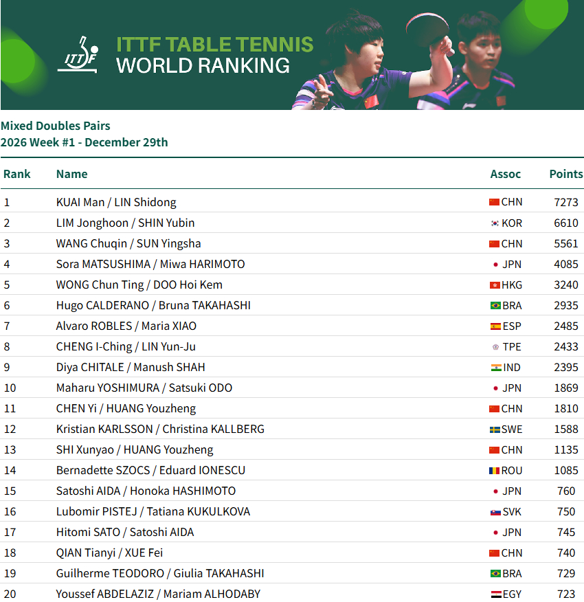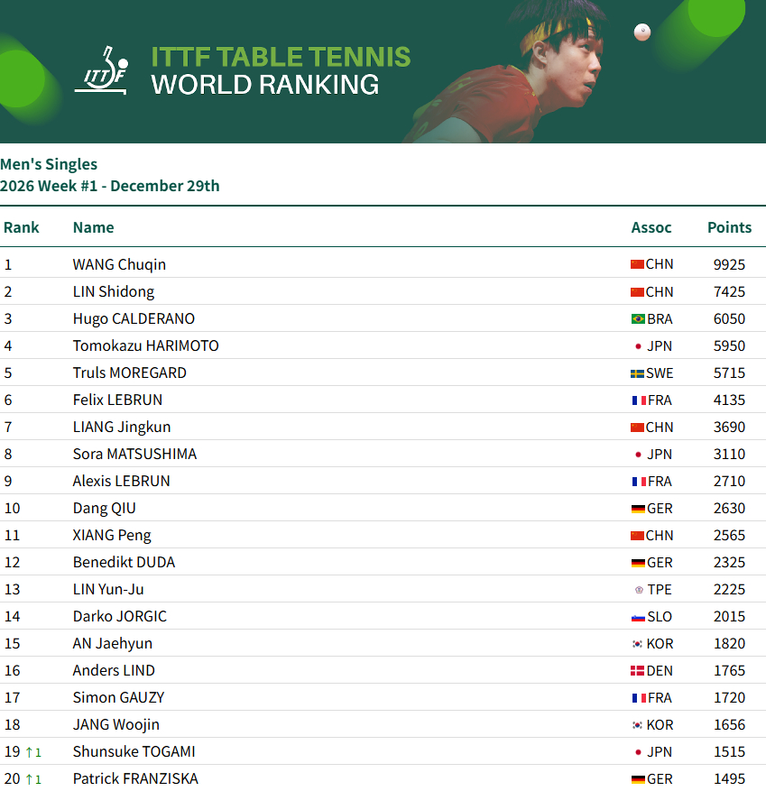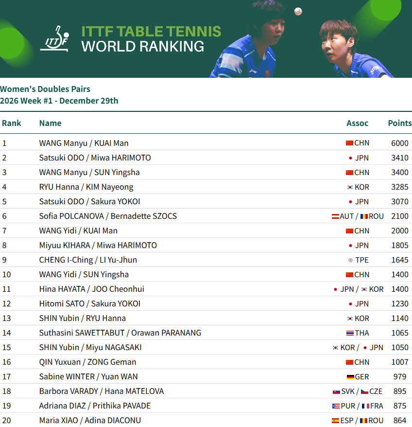 #2026国际乒联第1周排名#男单:王楚钦9925分、林诗栋位列前二,梁靖崑位列第7,向鹏第11女单:孙颖莎11600分、王曼昱、蒯曼、陈幸同、王艺迪位列前五,陈熠第8男双:王楚钦/林诗栋第3、林诗栋/黄友政第9女双:王曼昱/蒯曼第一、孙颖莎/王曼昱第3、蒯曼/王艺迪第7、孙颖莎/王艺迪第10混双:林诗栋/蒯曼第1、王楚钦/孙颖莎第3、黄友政/陈熠第11#孙颖莎连续181周女单第一##看WTT上咪咕#