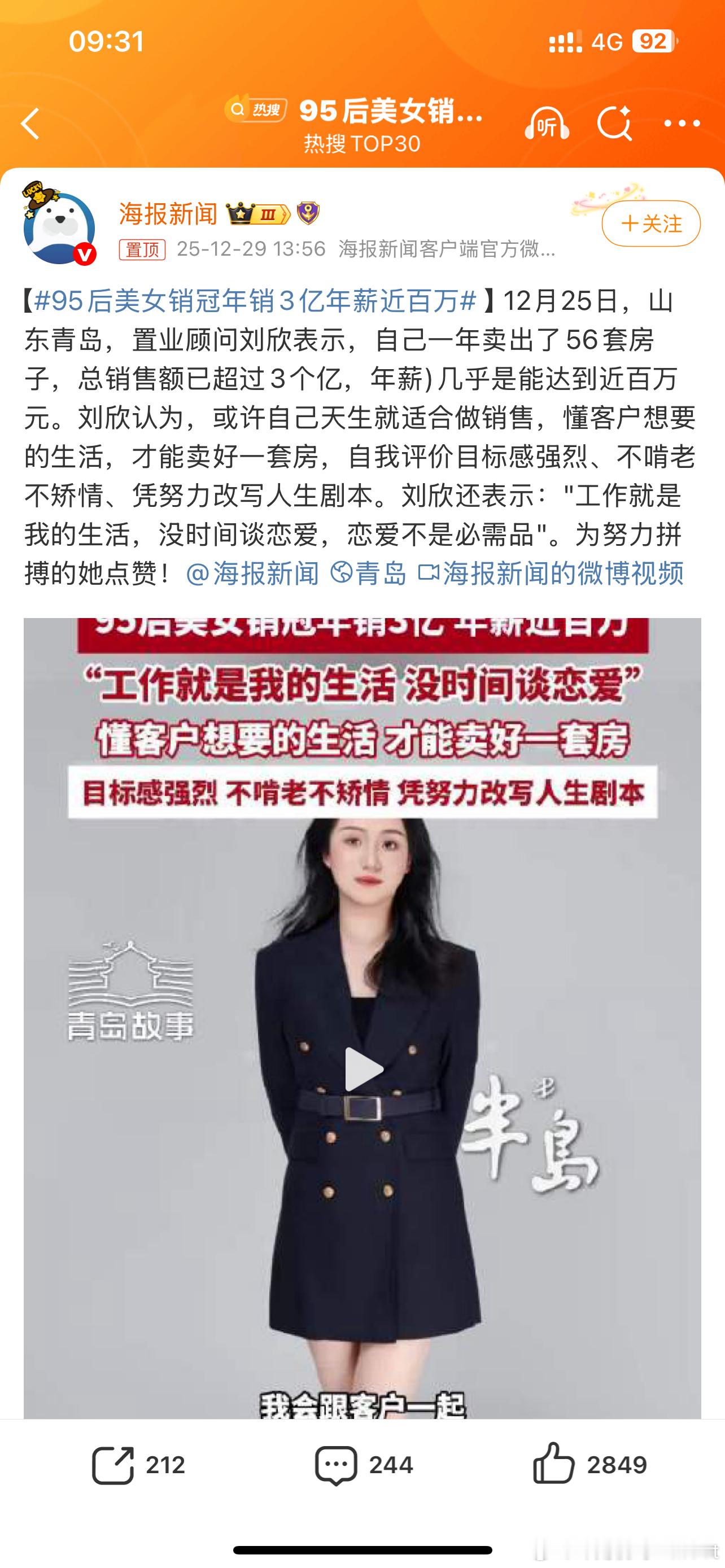 95后美女销冠年销3亿年薪近百万前有青岛保时捷美女销冠后有房地产美女销冠一年卖出56套房这个成绩年薪百万了也相当于平均每周都卖出一套房