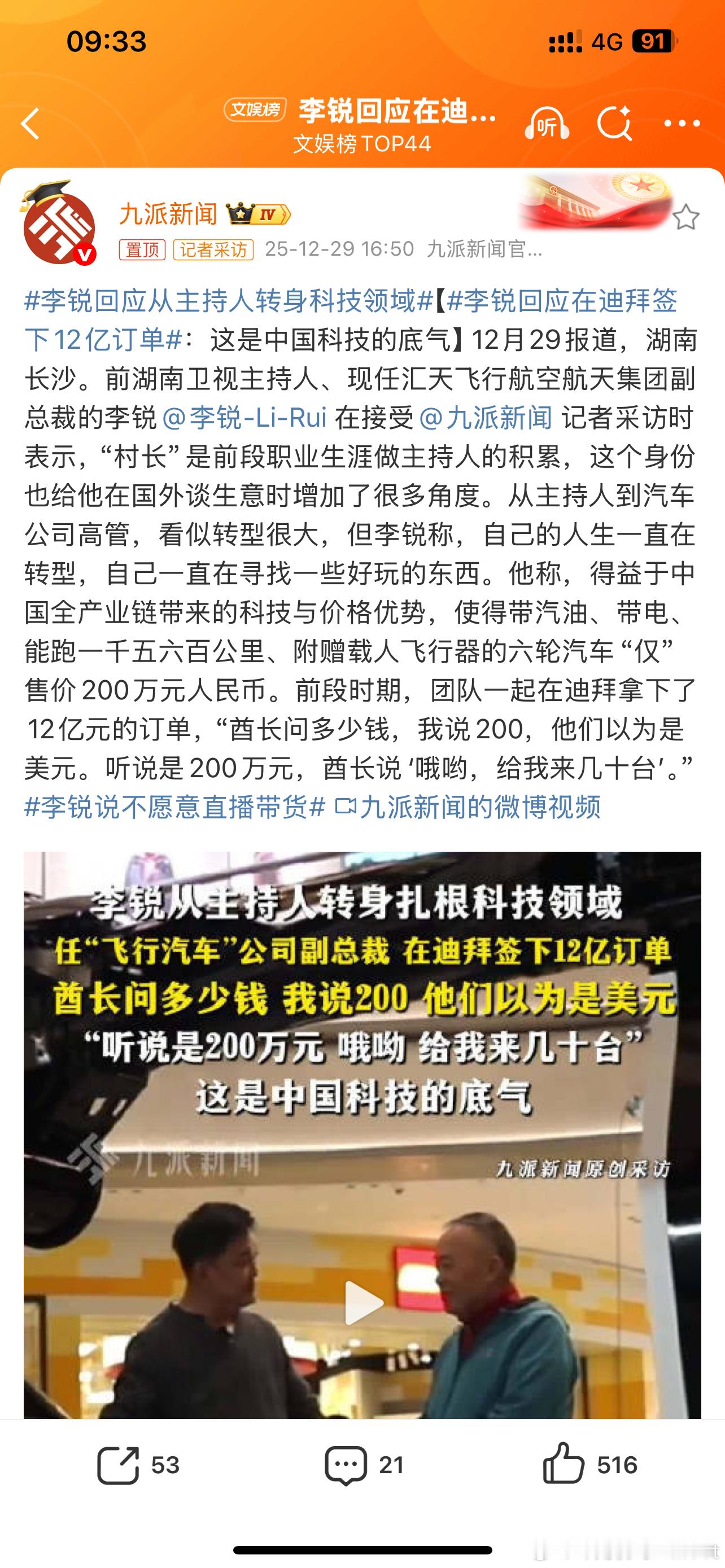 李锐回应在迪拜签下12亿订单之前在小鹏的发布会上见过“村长”没想到现在加入了小鹏汇天“村长”好牛呀能做到这种成绩肯定是离不开之前明星主持人的身份的当然飞行汽车在迪拜是一个新鲜物种而且迪拜确实富得流油