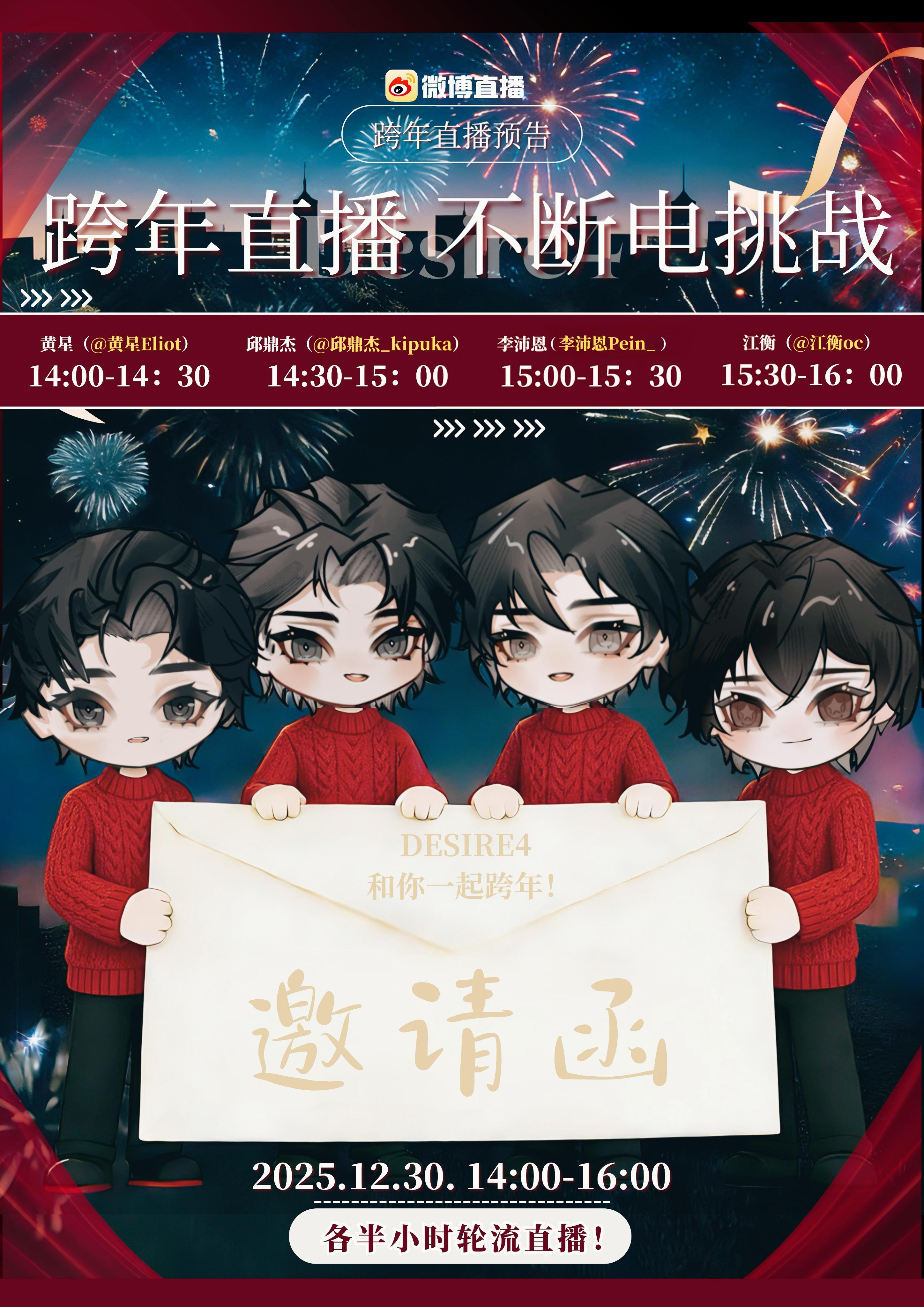 跨年直播不断电挑战跨年D计时您有一封来自的直播邀请函请查收今天14:00起,四位成员将进行接力直播 邀你一起直播跨年啦,倒计时预备备,不见不散~