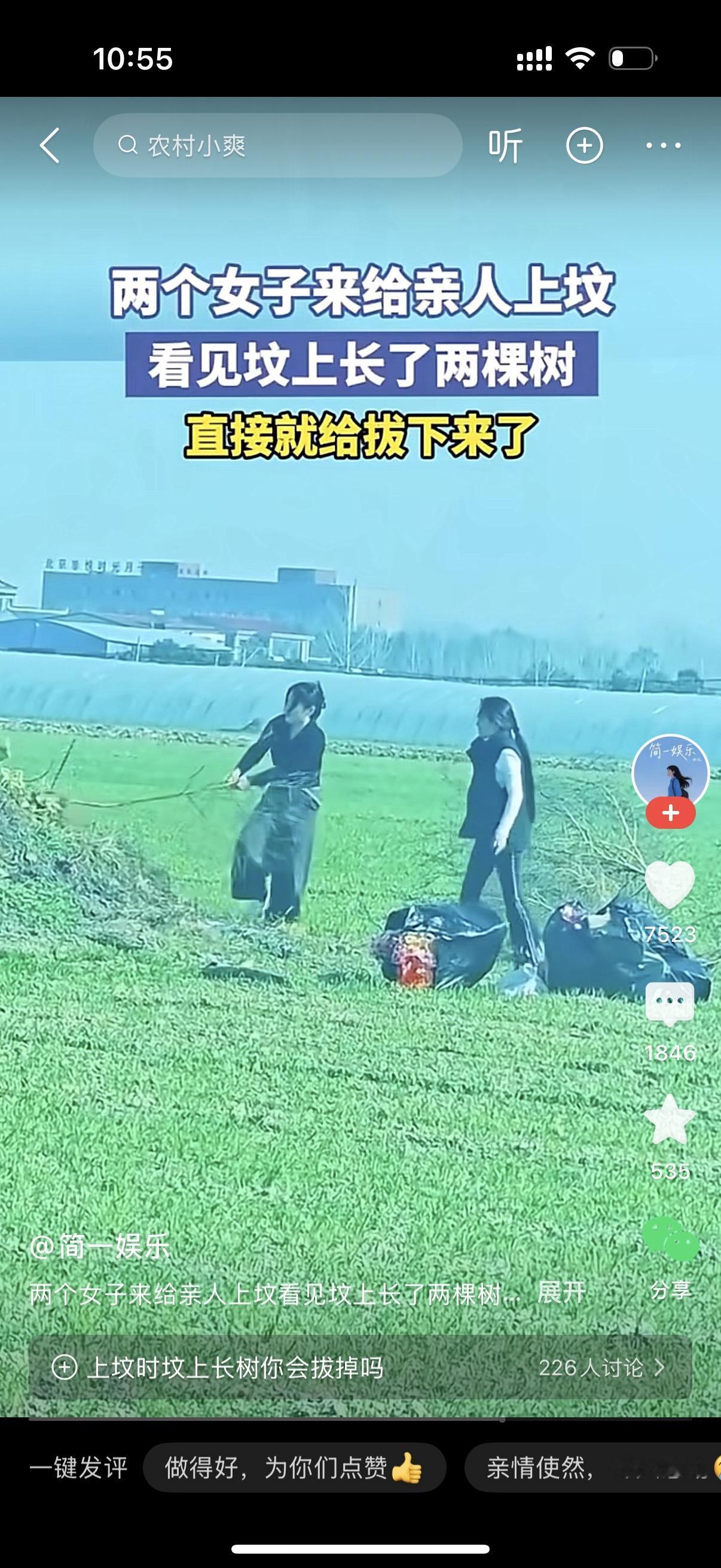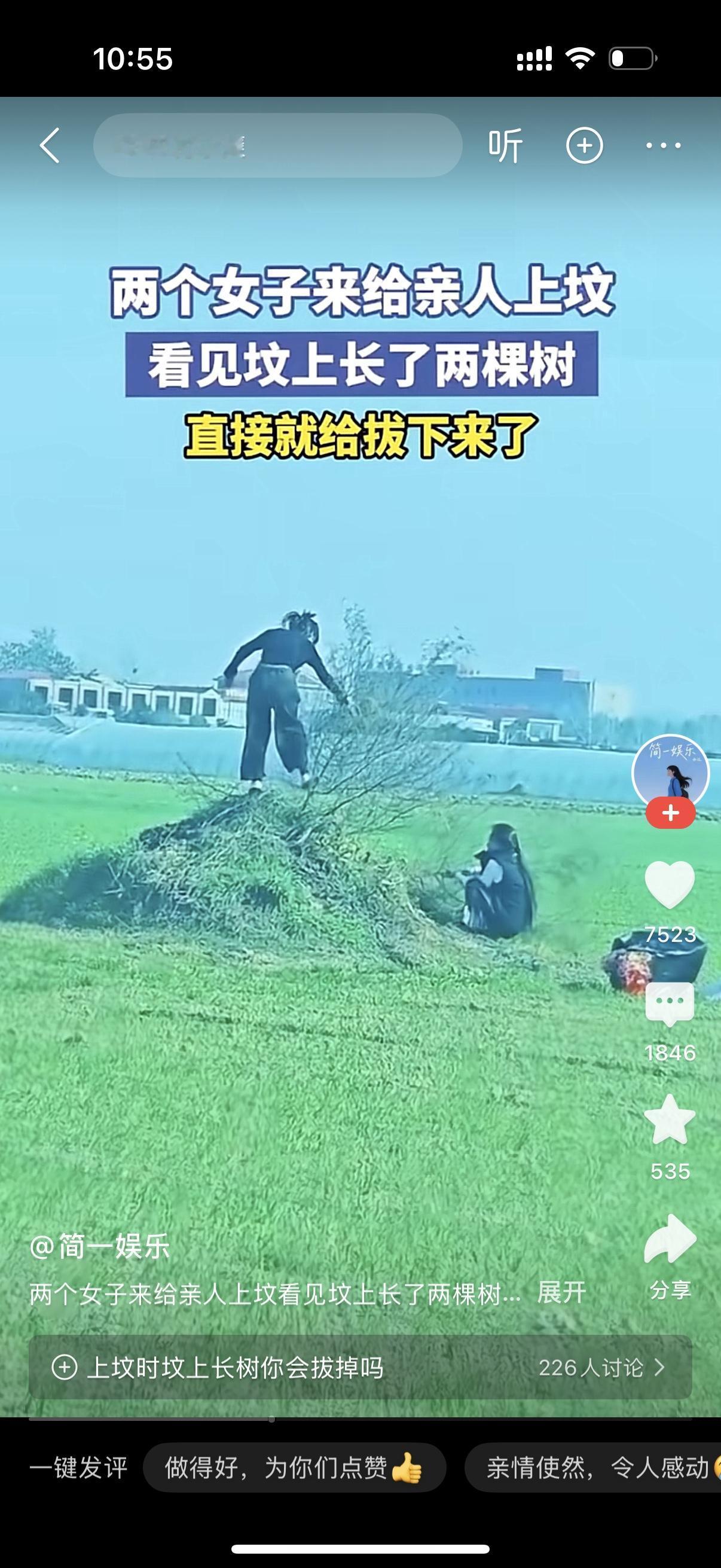两个女人来给亲人上坟,看见坟墓上长了两棵树。俩傻女使出浑身解数去拔树,一个在那拔,一个在那拖。忙活了半天,终于把🌲拔掉了。她们不知道坟上长🌲是好事吗?费那个劲还破坏风水,真是人少不懂事,无知者无畏。草可以除,树不能动,这是老祖宗留下的规矩。