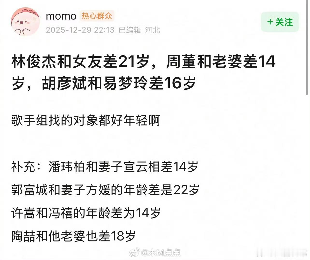 林俊杰官宣女友 谁还在乎现在在播什么…林俊杰第一次官宣恋情,两个人差了20来岁~林俊杰 七七 早就被拍到了,粉丝还闹脱粉来着,粉丝觉得他应该喜欢那种有内涵的女生,而不是小21岁的网红来着!是之前被粉丝反对的那位吧?林俊杰和七七差21岁,周杰伦和昆凌差14岁,胡彦斌和易梦玲差16岁,潘玮柏和妻子宣云差14岁,郭富城和妻子方媛差22岁,许嵩和冯禧差14岁,陶喆和他老婆也差18岁……歌手组找的对象都好年轻。林俊杰官宣恋情,众星祝福林俊杰,林俊杰女友 00后