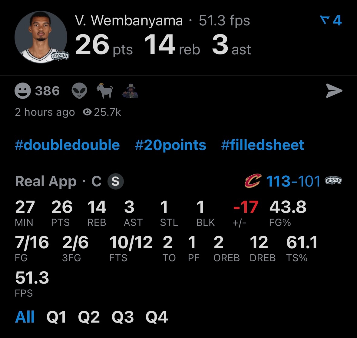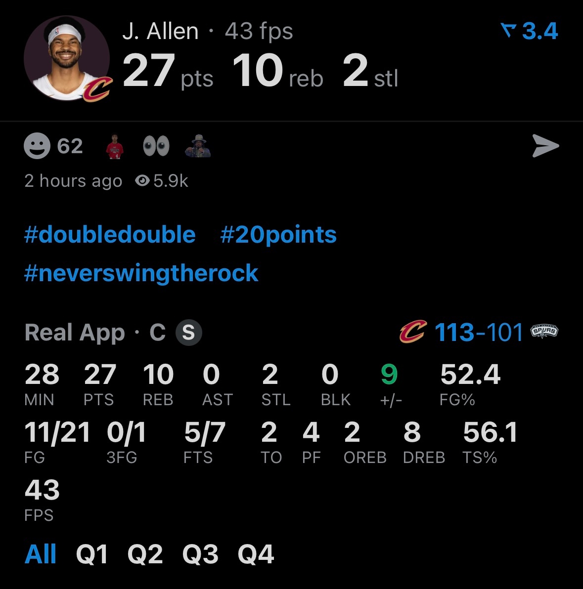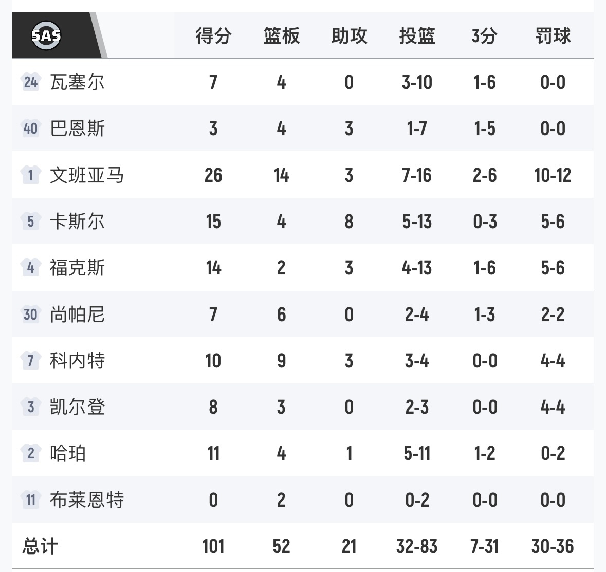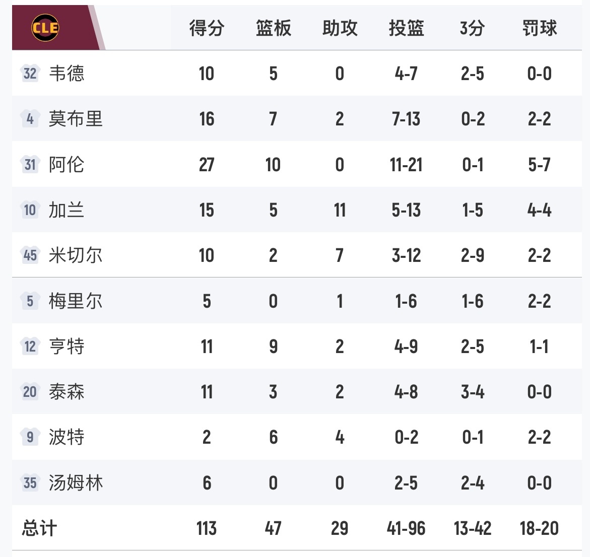 骑士113-101送马刺两连败,阿伦27分10板2抢断,文班26分14板3助攻。