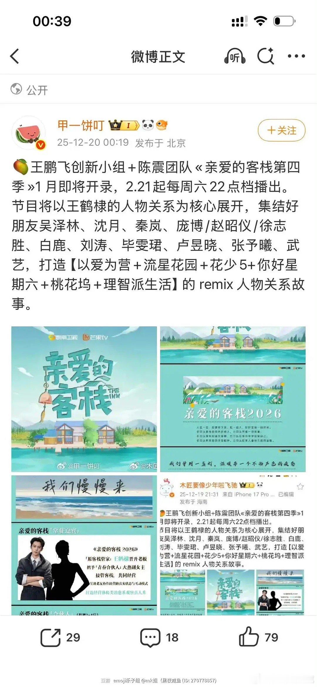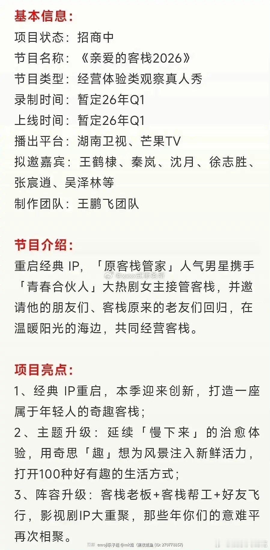 《亲爱的客栈》开录先导片了,芒果又给王鹤棣组了个综艺熟人局节目以王鹤棣的人物关系为核心展开……河堤牛啊