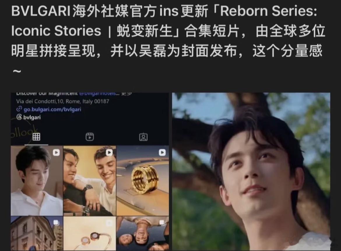 吴磊的商业影响力无需多言,宝格丽ig更新多国男星广告片混剪,而且这波吴磊是中国