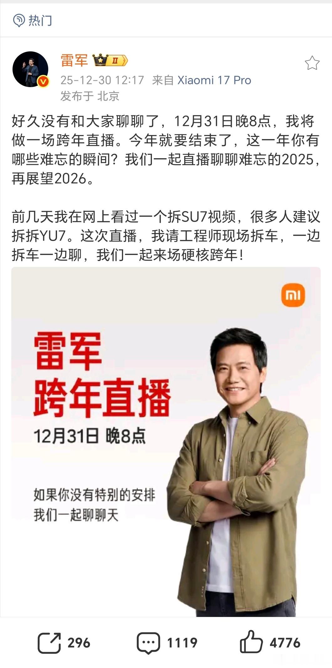 跨年夜看什么?要我说一起看雷总直播拆车啊!这可不是普通拆解,而是一次面对大众质疑的拆解,告诉你小米汽车为什么这么设计。比起看晚会,这堂免费的汽车公开课更有看头。转发给你身边开小米或想买小米的朋友,一起来看真材实料。黑子们也别闲着,现场拆开验证,比评论区打口水仗痛快多了。12月31日,看看小米的车到底有多好。雷军预告跨年直播雷军跨年直播拆车