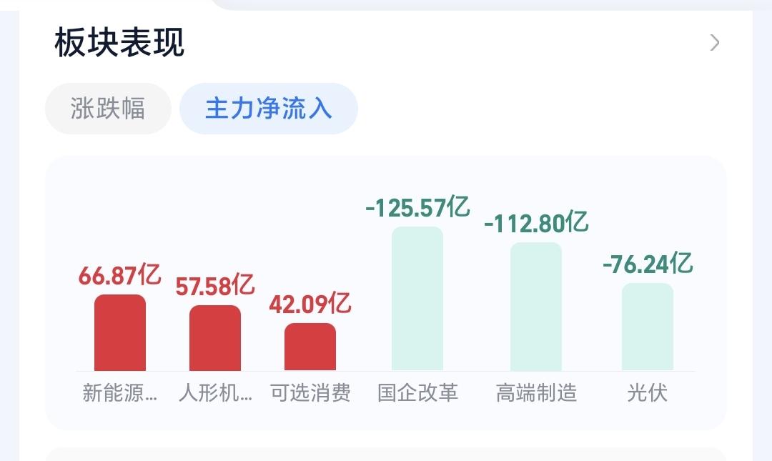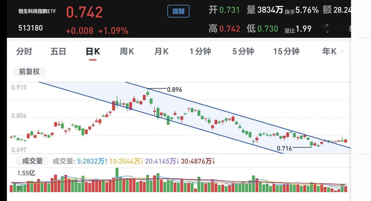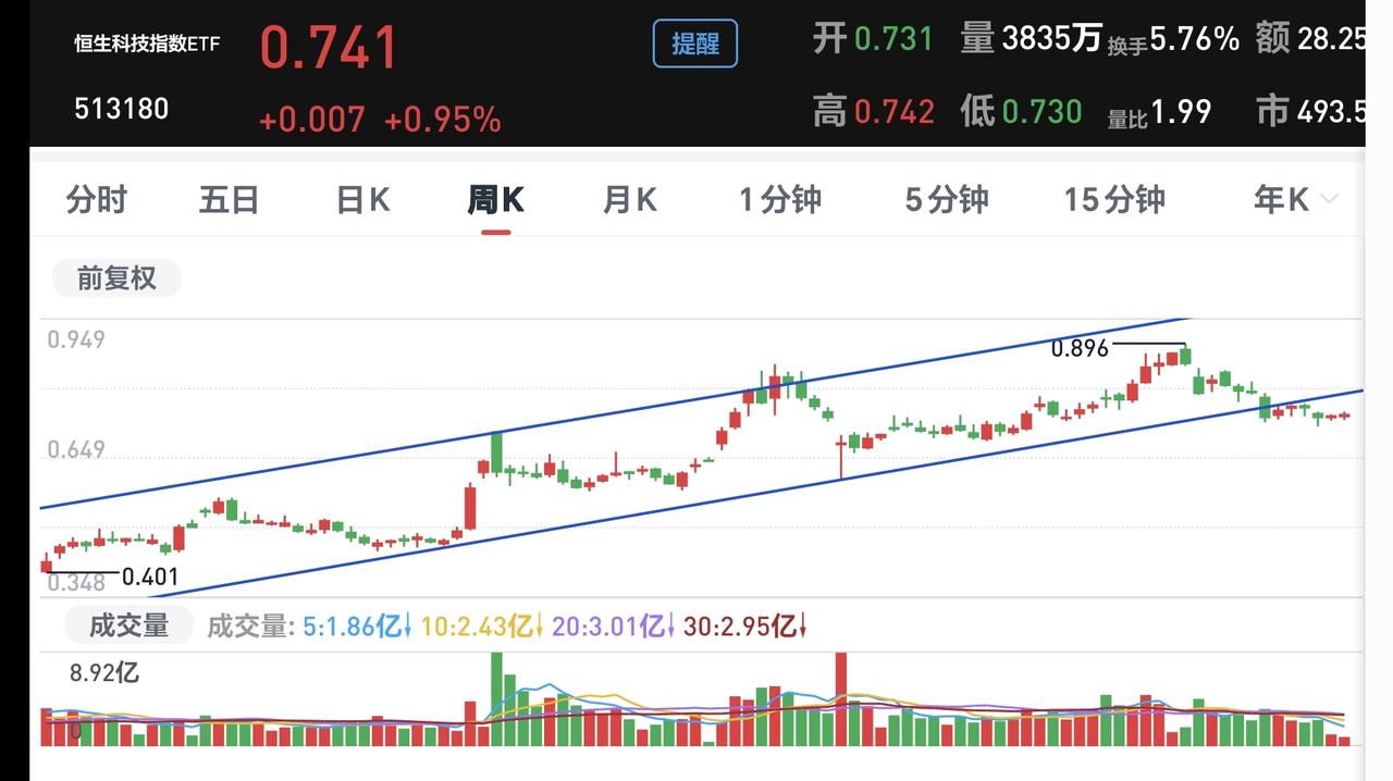 基金:恒生科技板块大涨,可不可以进场 下午开盘以后小幅度震荡,三大指数都已经翻红,创业板指上涨了0.50%,盘中点位3238点,上证指数上涨了0.10%,盘中点位3969点。 整个股票市场,上涨2200家,下跌3058家,涨停61家,跌停16家,上涨家数少于下跌家数。 持有的基金中,盘中估值上涨幅度最大的三个板块是:新能源汽车板块,芯片半导体板块,大科技混合,估值下跌幅度最大的三个板块是:医疗板块,军工板块,白酒板块,估值整体上涨了549元。 整个基金市场,上涨14563家,下跌4328家,上涨幅度超过5%的57家,下跌幅度超过5%的2家。 图9是今天基金的上涨排行榜,图10是今天基金的下跌排行榜,图11是ETF上涨幅度排行榜,图12是今天基金的加仓榜,图13是今天基金的减仓榜。 1:下午还是黄色线在蓝色线下方,两条线之间的敞口并不是很大,这样的情况之下,大幅度冲高以后也是会有回落,因为黄色线在下不支持市场有大幅度的上涨。 2:现在两市累计成交16318亿,相比于昨天缩量了1%,这说明下午开盘以后是放量的,但放量并没有让指数有明显的上涨幅度,这说明这个地方的抛压是比较重的。 3:我们来看一下下面的截图14,这是主力资金进出板块的情况,主力资金净流入最多的三个板块是:新能源板块,人形机器人板块,可选消费板块,主力资金净流出最多的三个板块是:国企板块,高端制造板块,光伏板块。 4:我们来看一下下面的截图15,这是板块上涨幅度排行榜,现在上涨幅度排名前三位的是:机器人板块,恒生科技板块,化工板块,其他板块的上涨幅度也看截图。 5:我们来看一下下面的截图16,这是恒生科技板块日K线图,从图中可以看出,我画了两条倾斜向下的斜线,这是恒生科技板块日线级别下跌通道。前段时间上涨突破了这个下跌通道的上轨,也就是说,恒生科技板块日线级别下跌趋势已经被改变。 6:我们来看一下下面的截图17,这是恒生科技板块周K线图,从图中可以看出,我画了两条倾斜向上的斜线,这是恒生科技板块周线级别上涨通道,前段时间跌破了这个上涨通道的下轨,也就是说,恒生科技板块周线级别上涨趋势已经被改变。 恒生科技板块日线级别下跌趋势已经被改变,周线级别上涨趋势也已经被改变,也就是说,恒生科技板块日线级别有可能会形成上涨趋势,周线级别有可能会形成下跌趋势,小方向向好,大方向向坏,这样的情况之下,进场需要谨慎。 今天究竟应该怎么办?我会在评论区留言。 我每天都会分享我的观点,我的观点只代表我个人的看法,不能作为你操作的依据,据此操作后果自负。