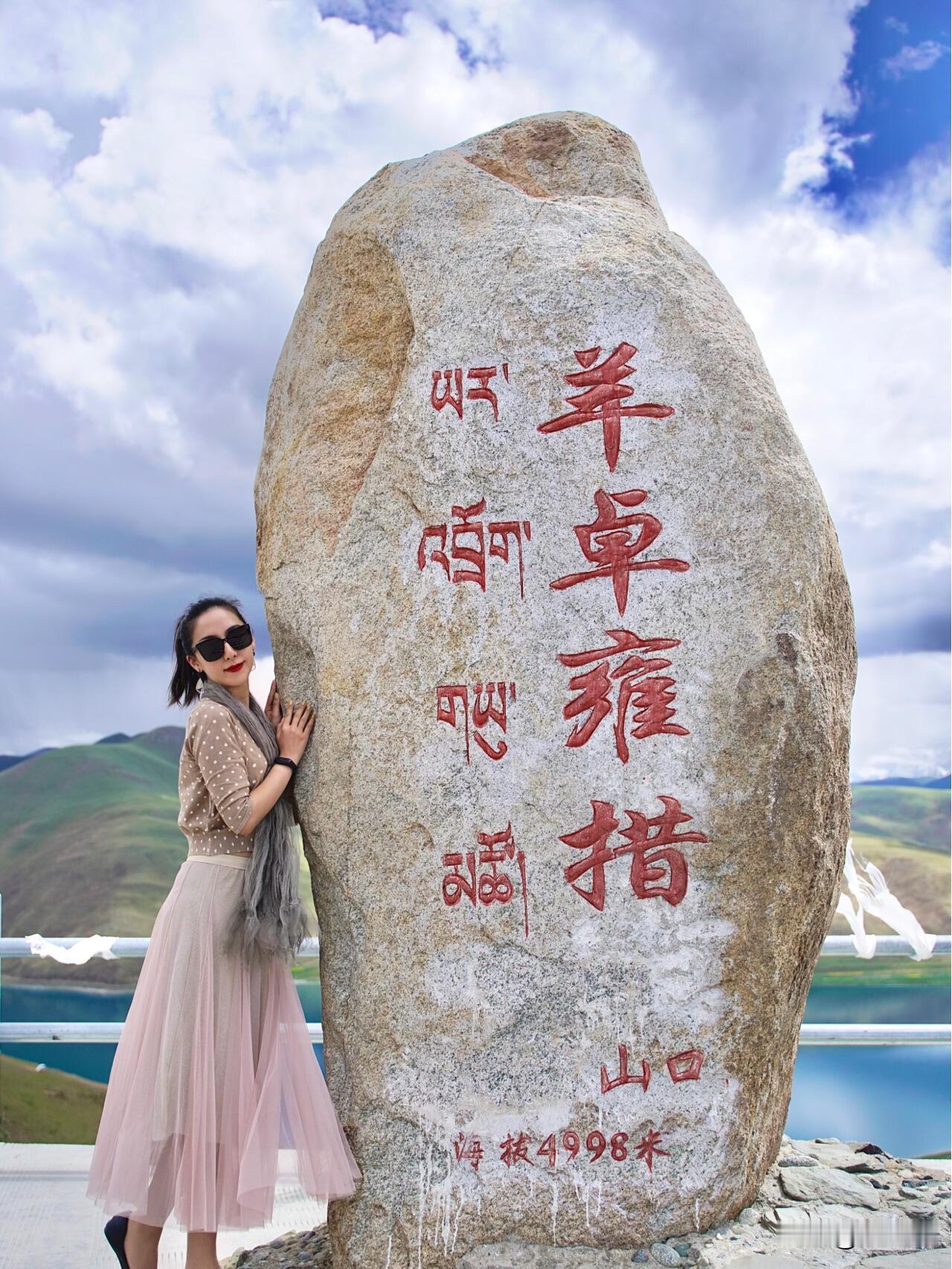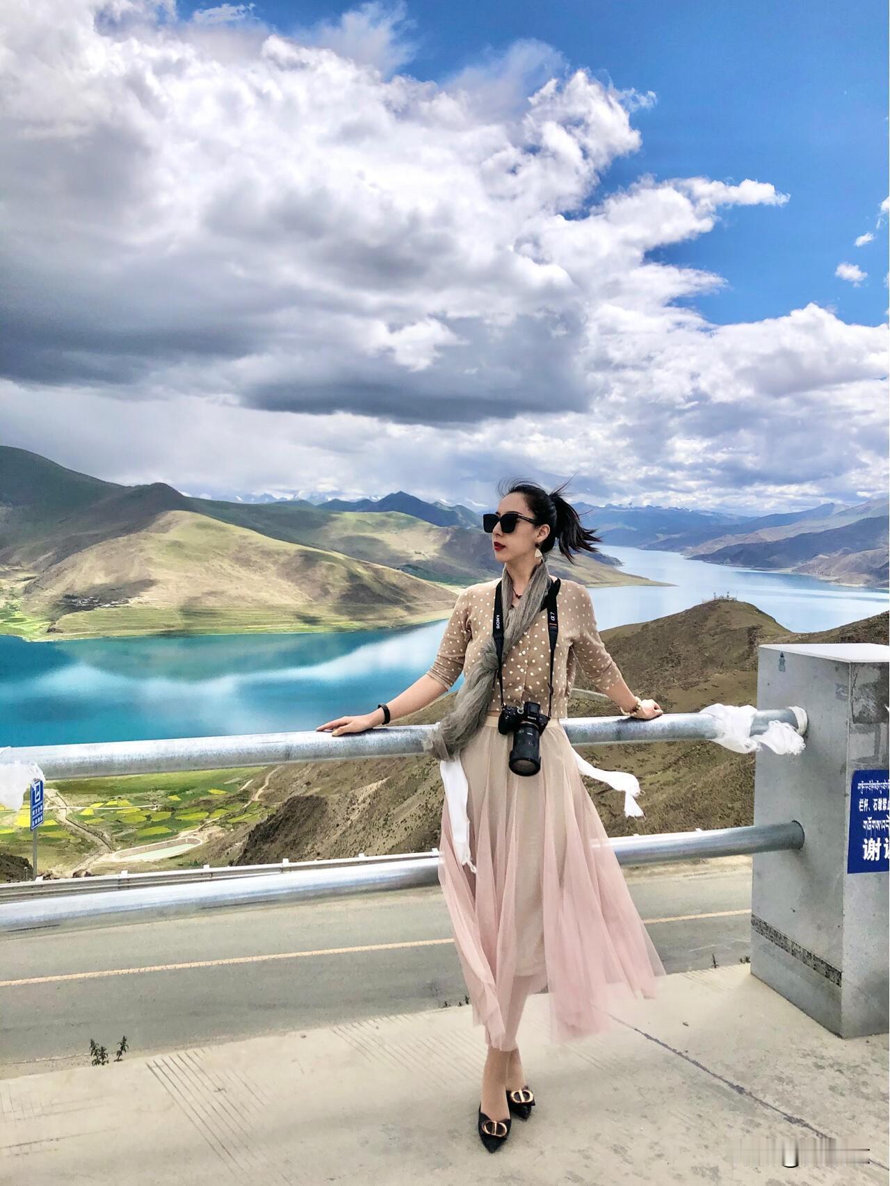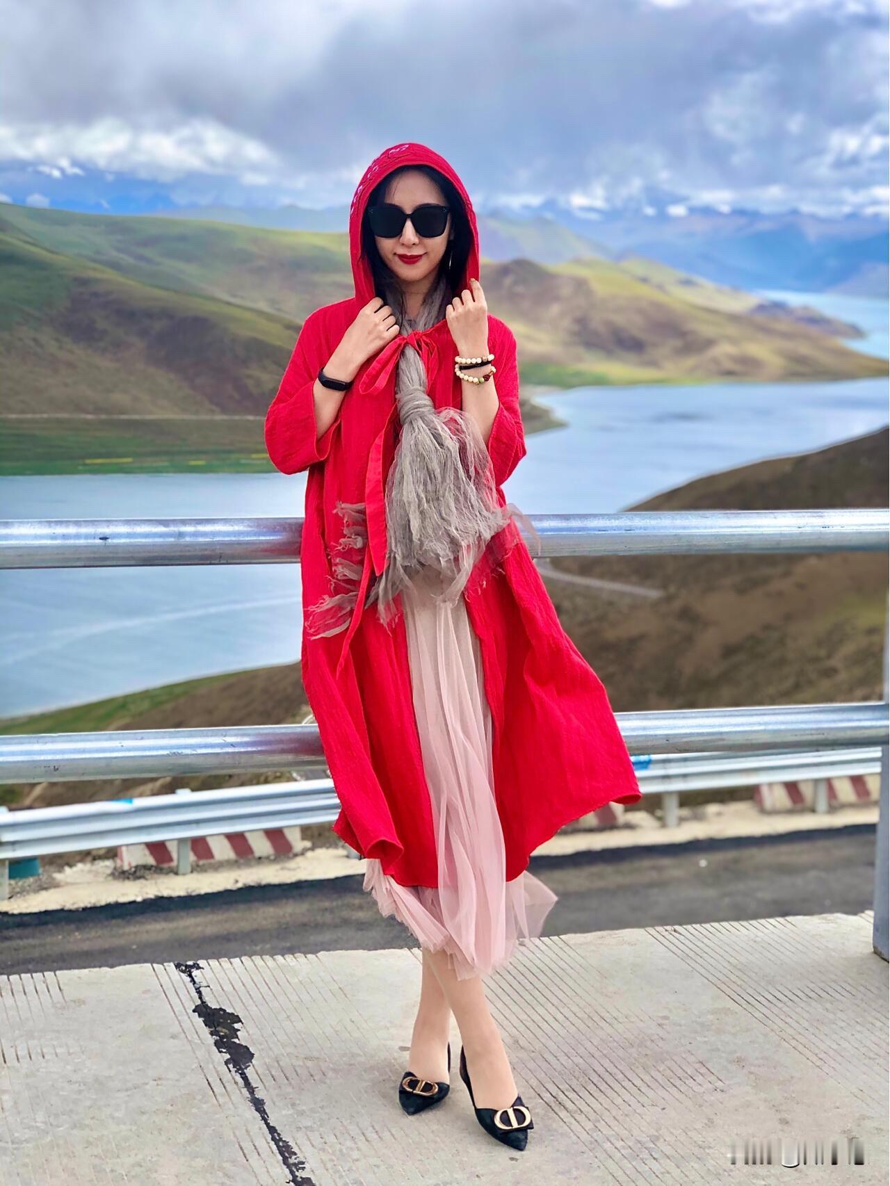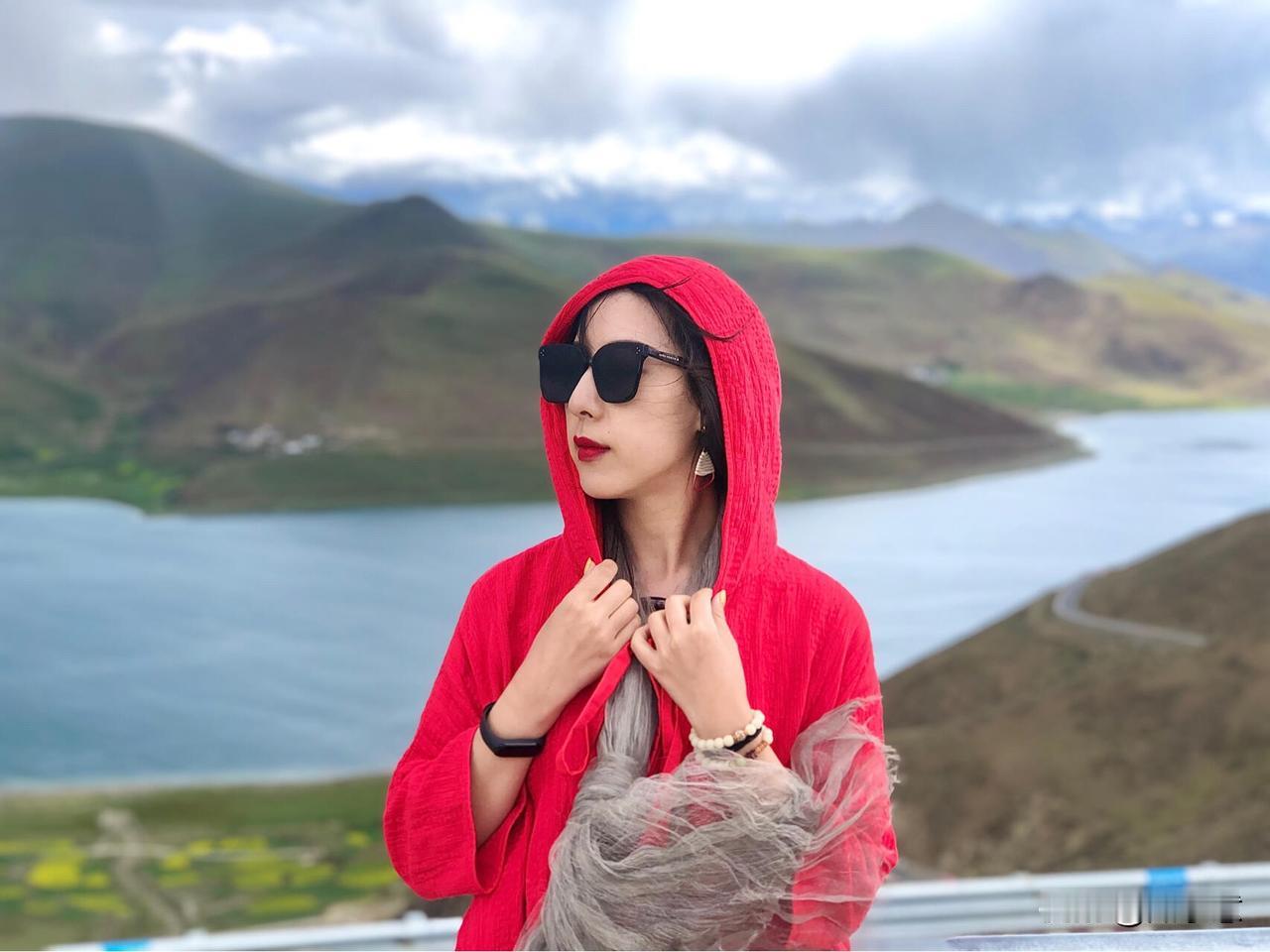 羊湖打卡||开车沿盘山公路爬升经过108个弯道,到达4998米羊卓雍措观景台,没来前在网上看图片最多的就是羊湖,一片娇羞~ 穿着红色斗篷的我,总觉得像吃小羊的狼外婆👵🤔