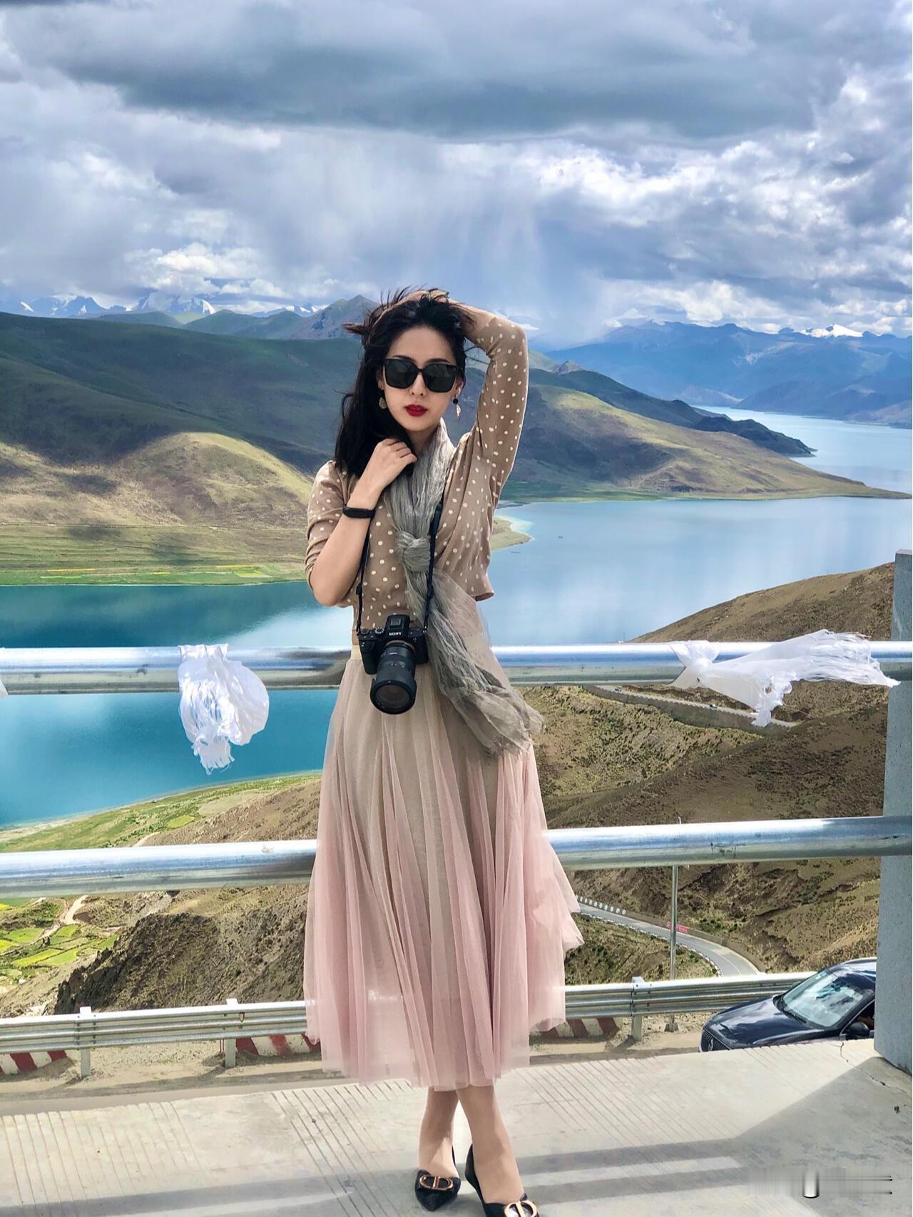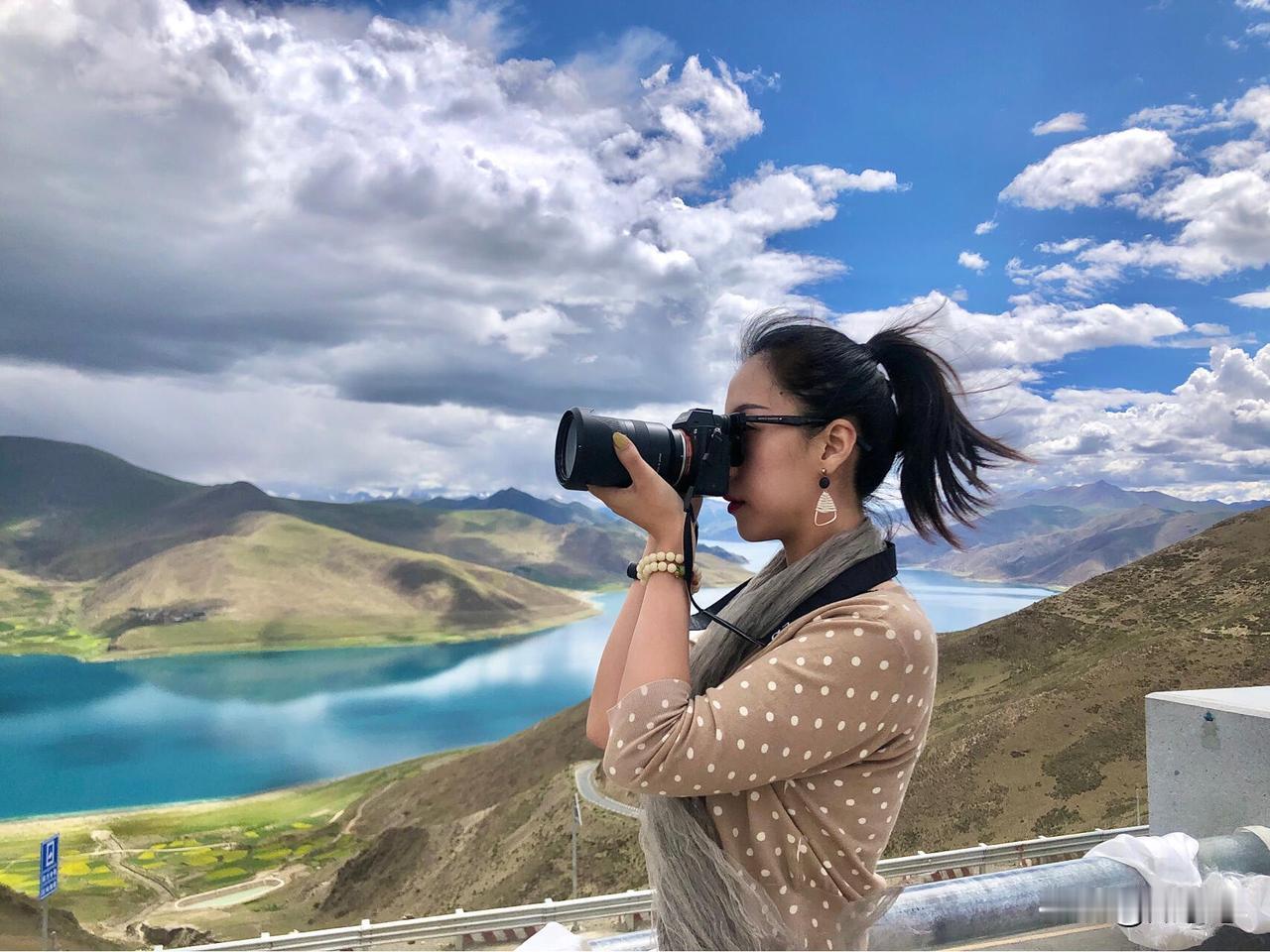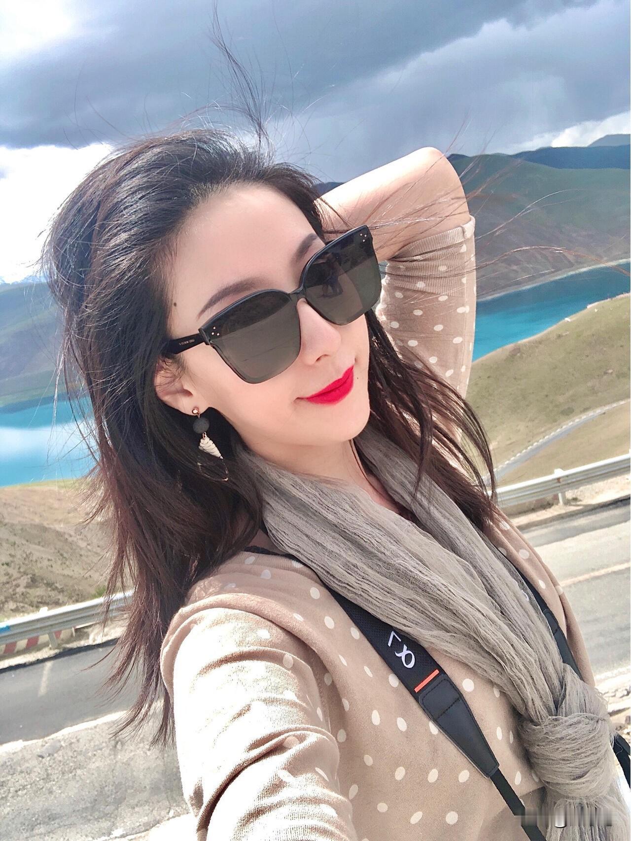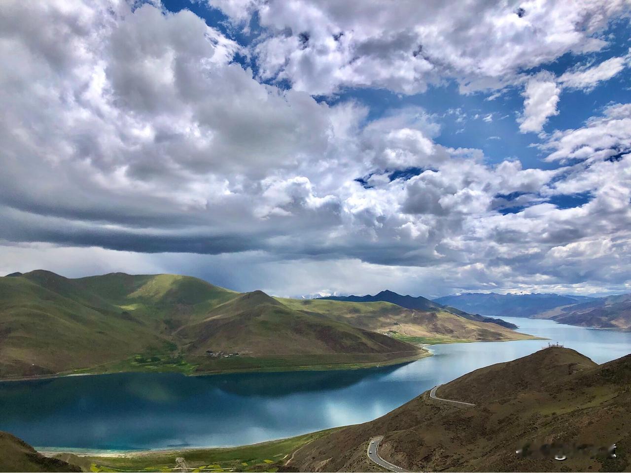 羊湖打卡||开车沿盘山公路爬升经过108个弯道,到达4998米羊卓雍措观景台,没来前在网上看图片最多的就是羊湖,一片娇羞~ 穿着红色斗篷的我,总觉得像吃小羊的狼外婆👵🤔