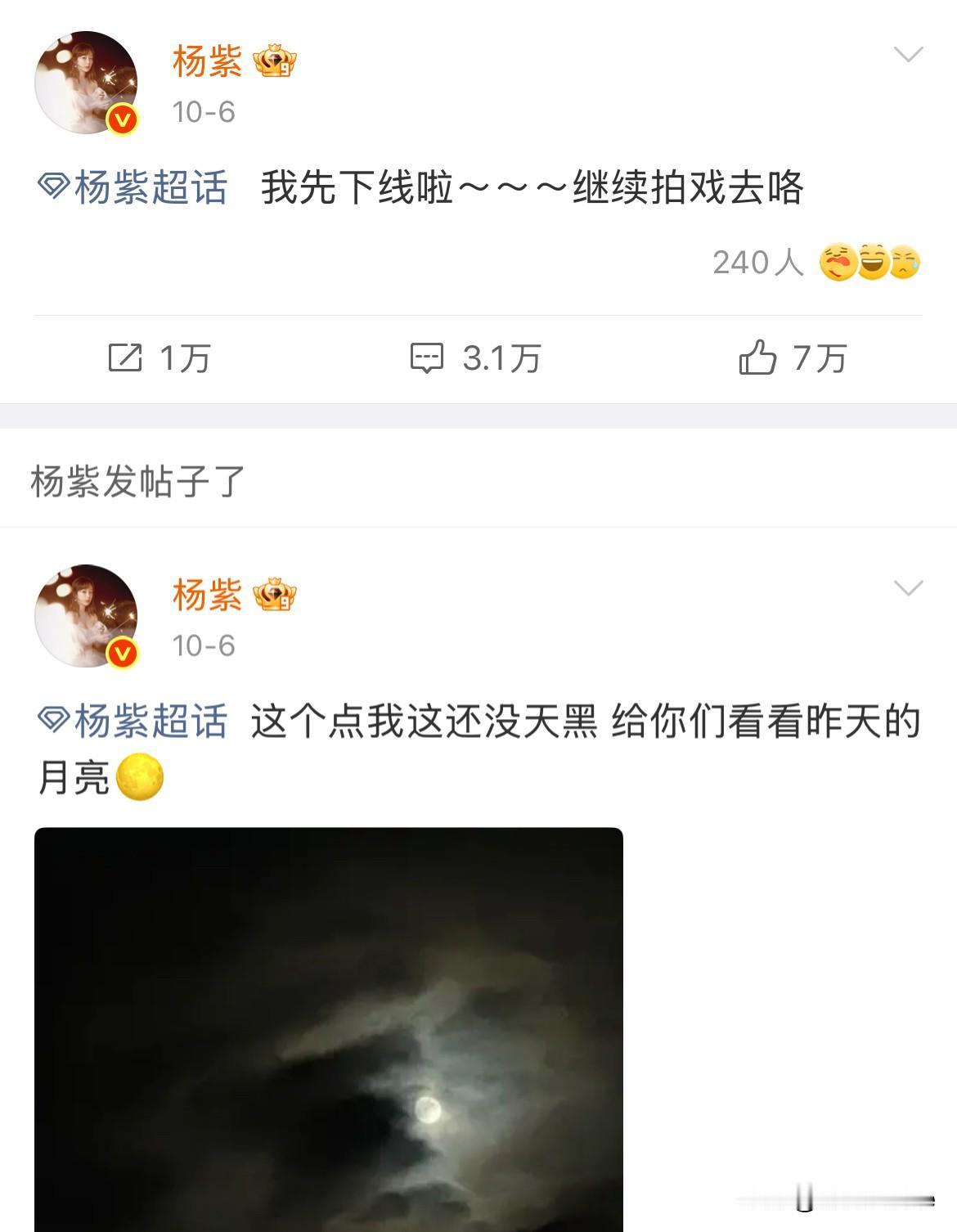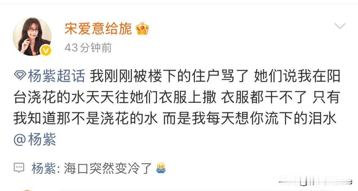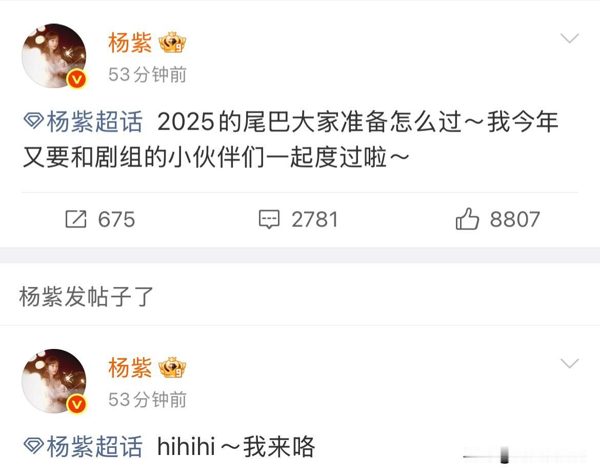 12月30日,杨紫年末拍戏间隙空降与粉丝互动,才发现紫米们原来一直吃的这么好! 杨紫在线询问粉丝年末动态,分享自己年末将在剧组跟小伙伴们一同度过,还翻牌回复了好几个粉丝的留言,土味情话猝不及防,杨紫回复更是搞笑,直言海口突然变冷了~ 翻了翻发现跟粉丝单聊的杨紫与营业杨紫大有不同,更亲密,熟悉,分享的内容更日常,她是真的有把粉丝当朋友去看待分享生活! 虽然遗憾杨紫跨年没有节目,但很期待杨紫跨年演绎得董竹君!