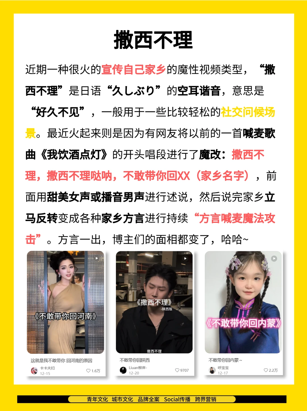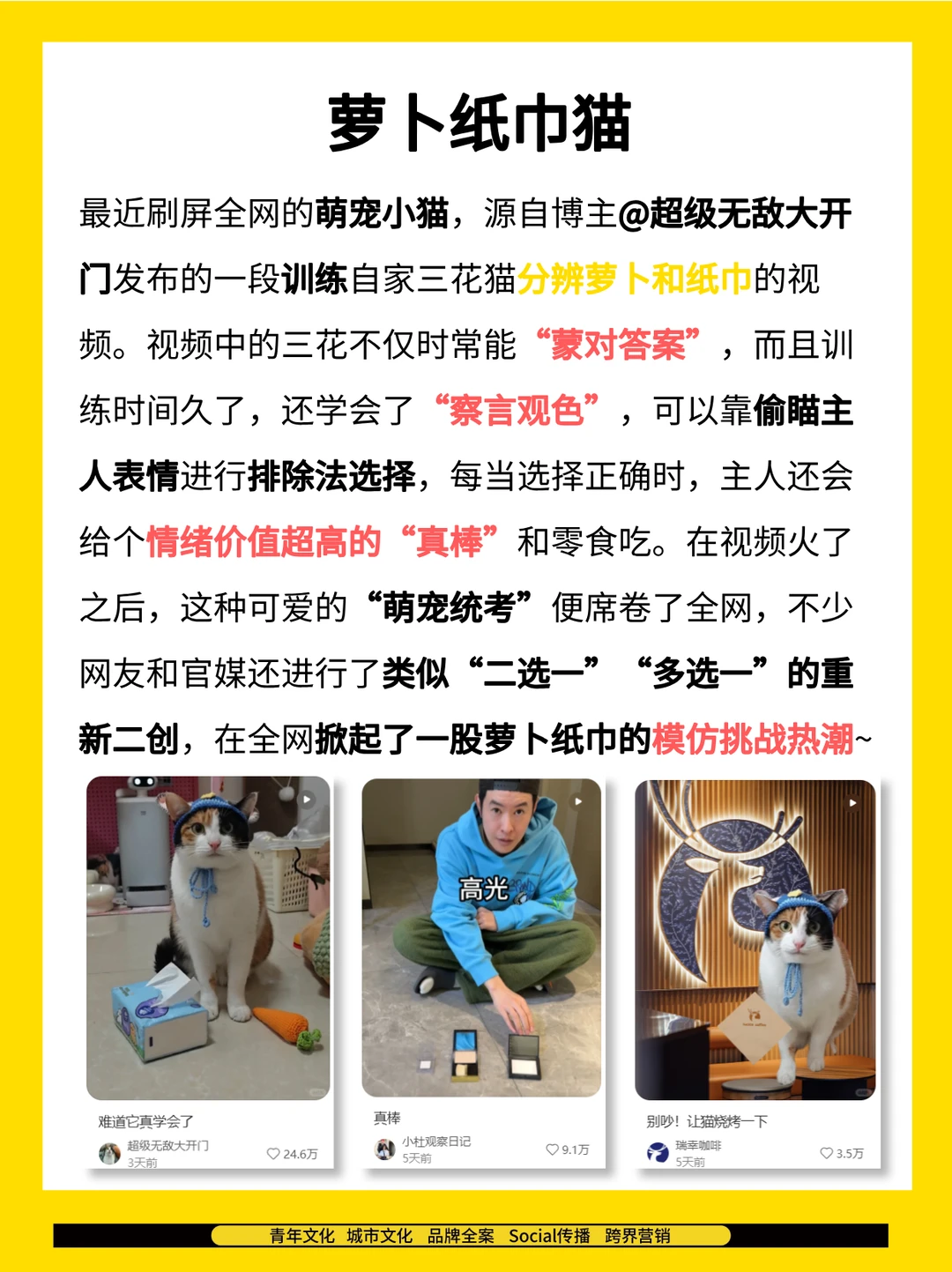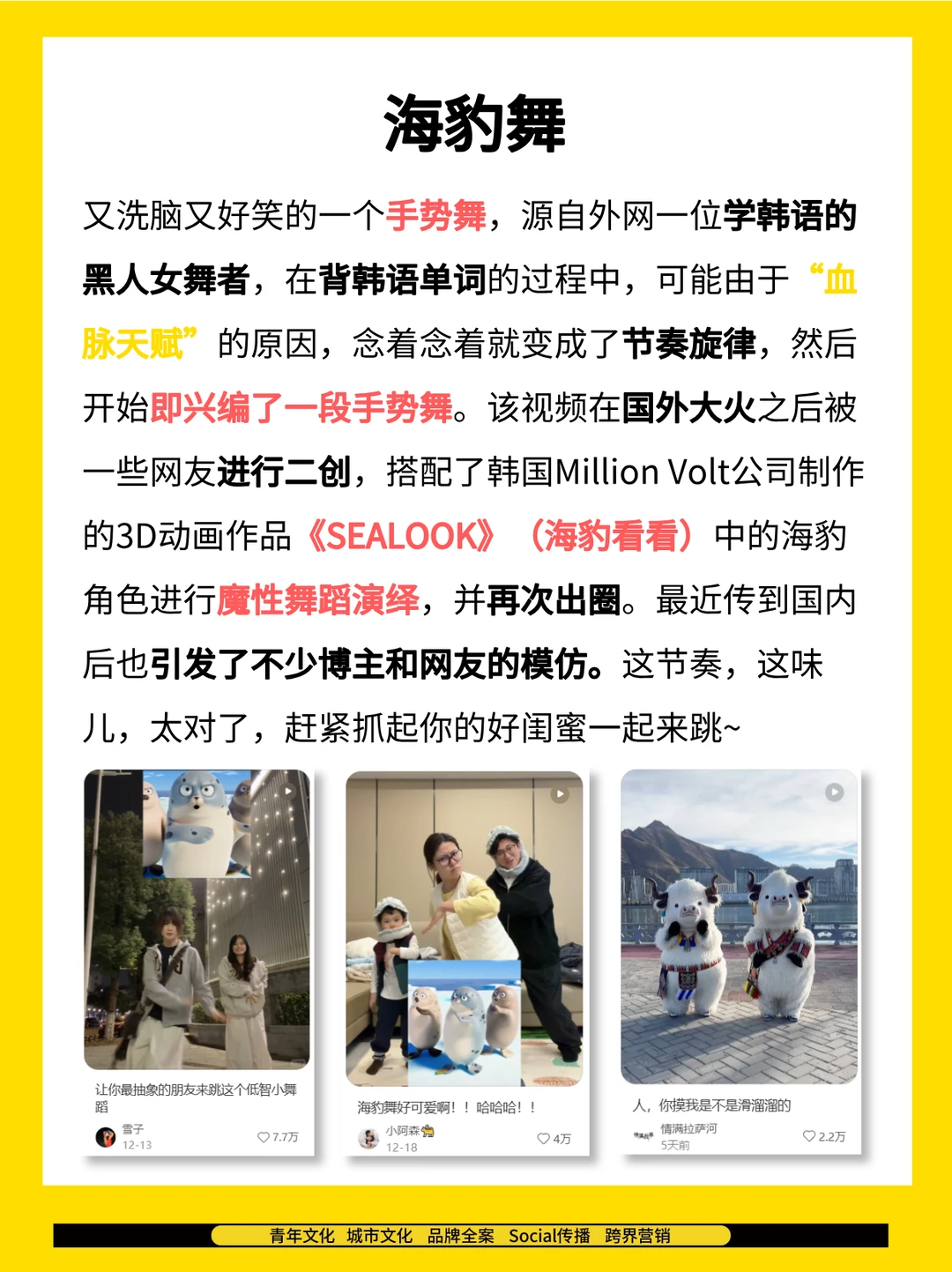 🔎年轻人最近在关注什么? 热词热梗指南,带你走进年轻人的世界! 🔥年底全国统考集合,看看谁的「萝卜纸巾猫」考不过; 🔥撒西不理,撒西不理哒呐,「不敢带你回广东」,怕你遇见双马尾; 🔥艾特你的闺蜜一起来跳这个抽象的「海豹舞」; *图源网络 每周关注快活Lab工作室,后面会持续更新更多营销案例、行业研究、青年洞察等相关内容干货哦!