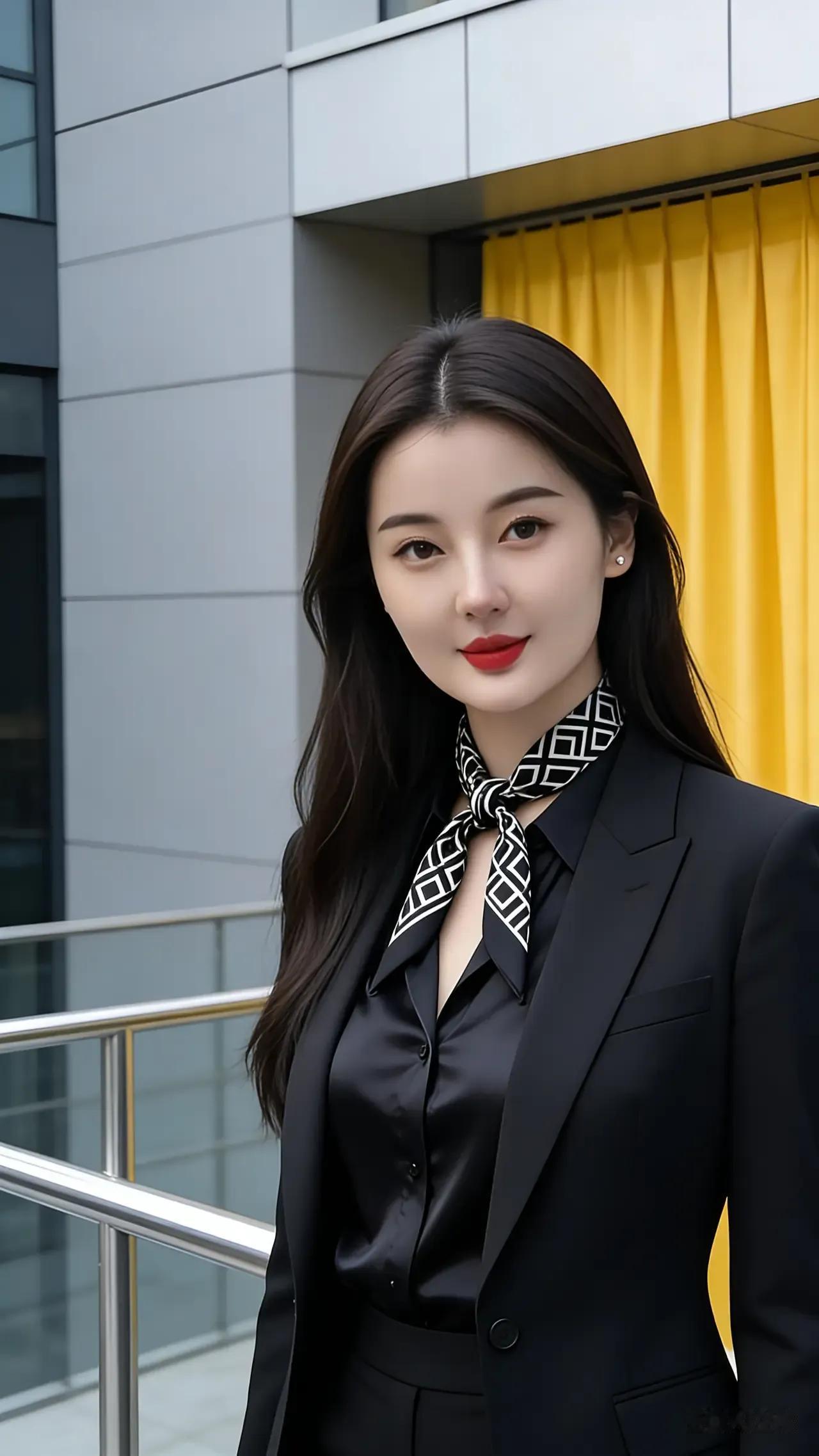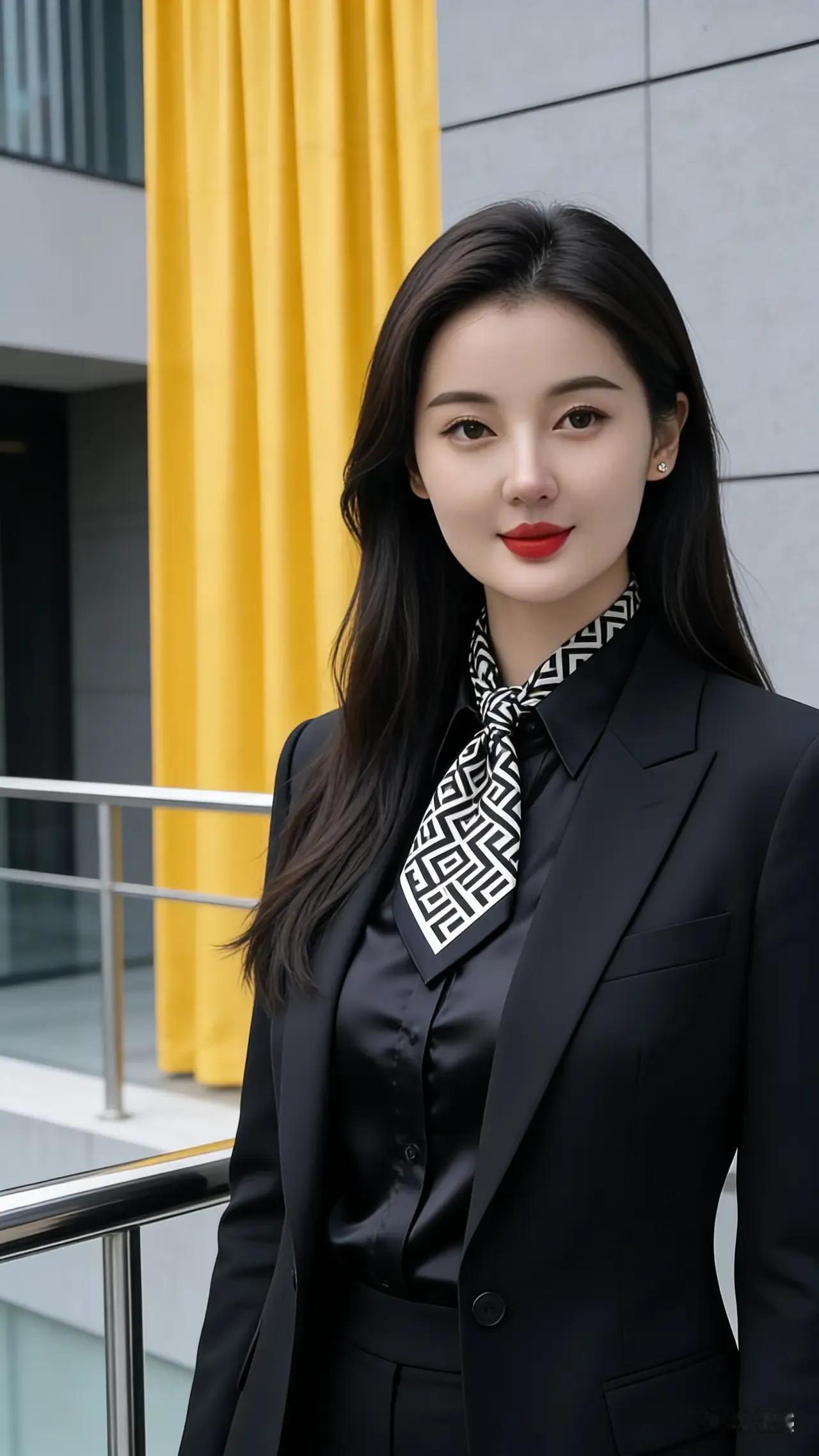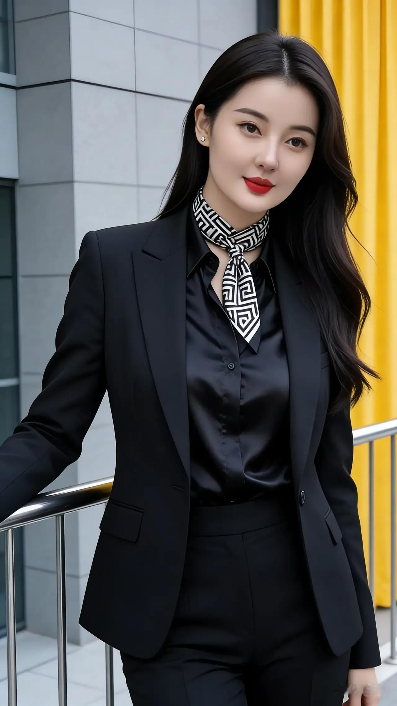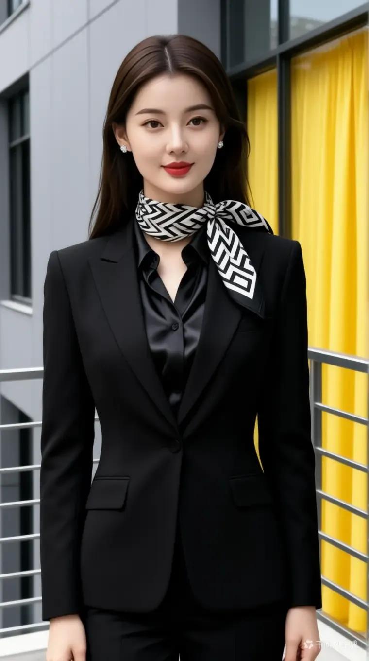 优雅黑西服搭配几何围巾,职场女性的时尚穿搭。