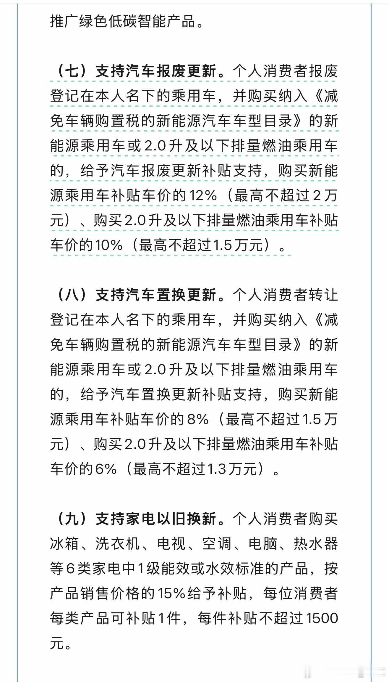 国家发展改革委、财政部印发的《关于2026年实施大规模设备更新和消费品以旧换新政策的通知》12月30日对外发布,明确2026年“两新”政策的支持范围、补贴标准和工作要求。2026年“两新”政策主要做了3个方面优化。划重点,汽车置换还是有的,购买新能源乘用车补贴车价的8%,最高不超过1.5万元,购买2.0升及以下排量燃油乘用车补贴车价的6%最高不超过1.3万元。这给明年的汽车销售市场一个定心丸。个人消费者报废登记在本人名下的乘用车,并购买纳入《减免车辆购置税的新能源汽车车型目录》的新能源乘用车或2.0升及以下排量燃油乘用车的,给予汽车报废更新补贴支持,购买新能源乘用车补贴车价的12%(最高不超过2万元)、购买2.0升及以下排量燃油乘用车补贴车价的10%(最高不超过1.5万元)。支持汽车置换更新。个人消费者转让登记在本人名下的乘用车,并购买纳入《减免车辆购置税的新能源汽车车型目录》的新能源乘用车或2.0升及以下排量燃油乘用车的,给予汽车置换更新补贴支持,购买新能源乘用车补贴车价的8%(最高不超过1.5万元)、购买2.0升及以下排量燃油乘用车补贴车价的6%(最高不超过1.3万元)
