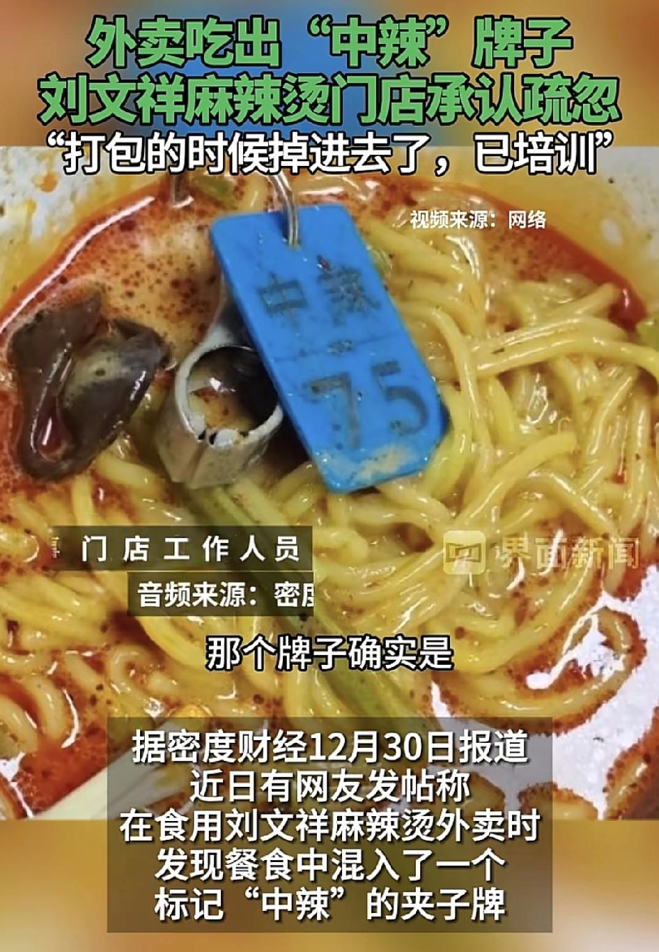 有网友称自己点刘文祥麻辣烫时发现,产品里面夹着一个标志着中辣的牌子,跟店员反映,他们核实过后,确实是店员在打包的时候不小心掉进去的,这确实是店员的疏忽,已经给顾客做免单的处理,并且免费给顾客在送一份外卖订单。刘文祥麻辣烫仅次于杨国福麻辣烫和张亮麻辣烫。