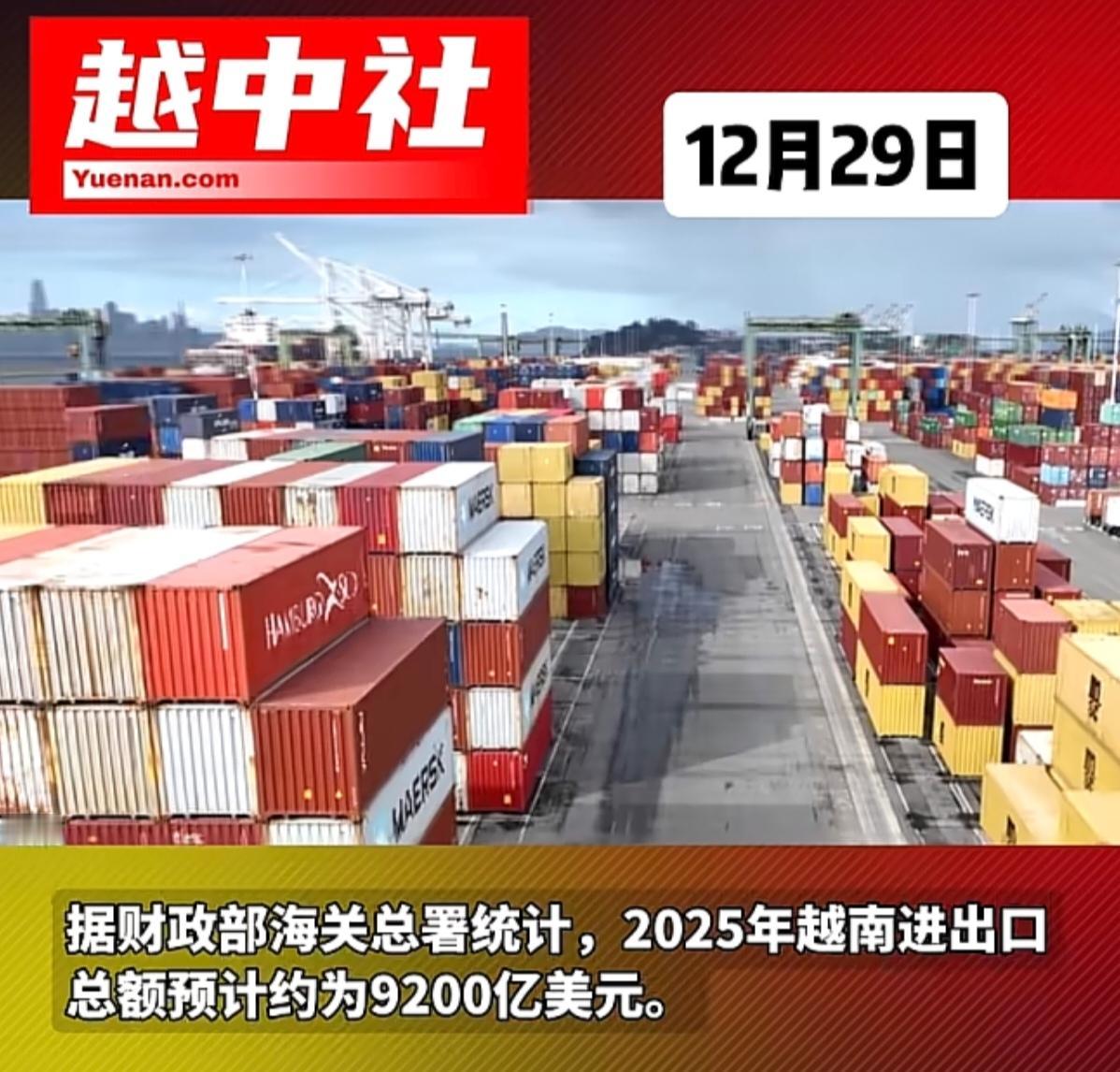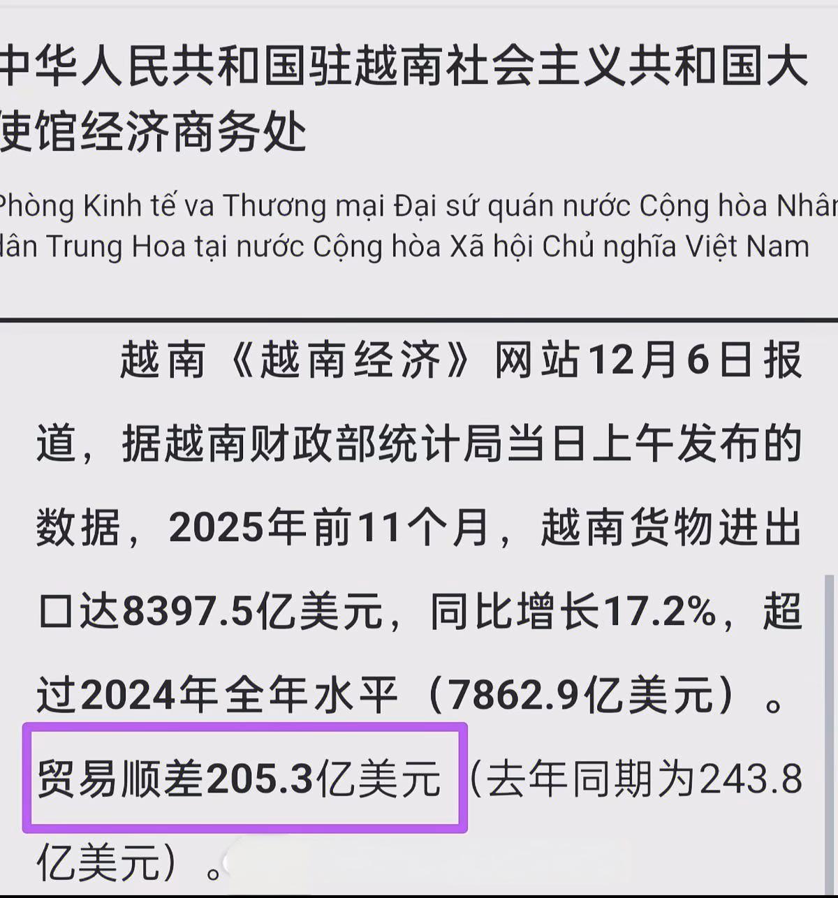 越南很兴奋啊,12月29日就在播报2025年越南进出口总额预计约为9200亿美元。 其中,从中国进口1830亿美元,对美国出口1850亿美元。这组数字高度吻合,锤实中国货物从越南中转至美国的说法。 越南顺差212亿美元,外资企业顺差482亿美元,越南国内企业-270亿美元。 从中可以看出,越南赚了个劳务费,工人挣到了钱。