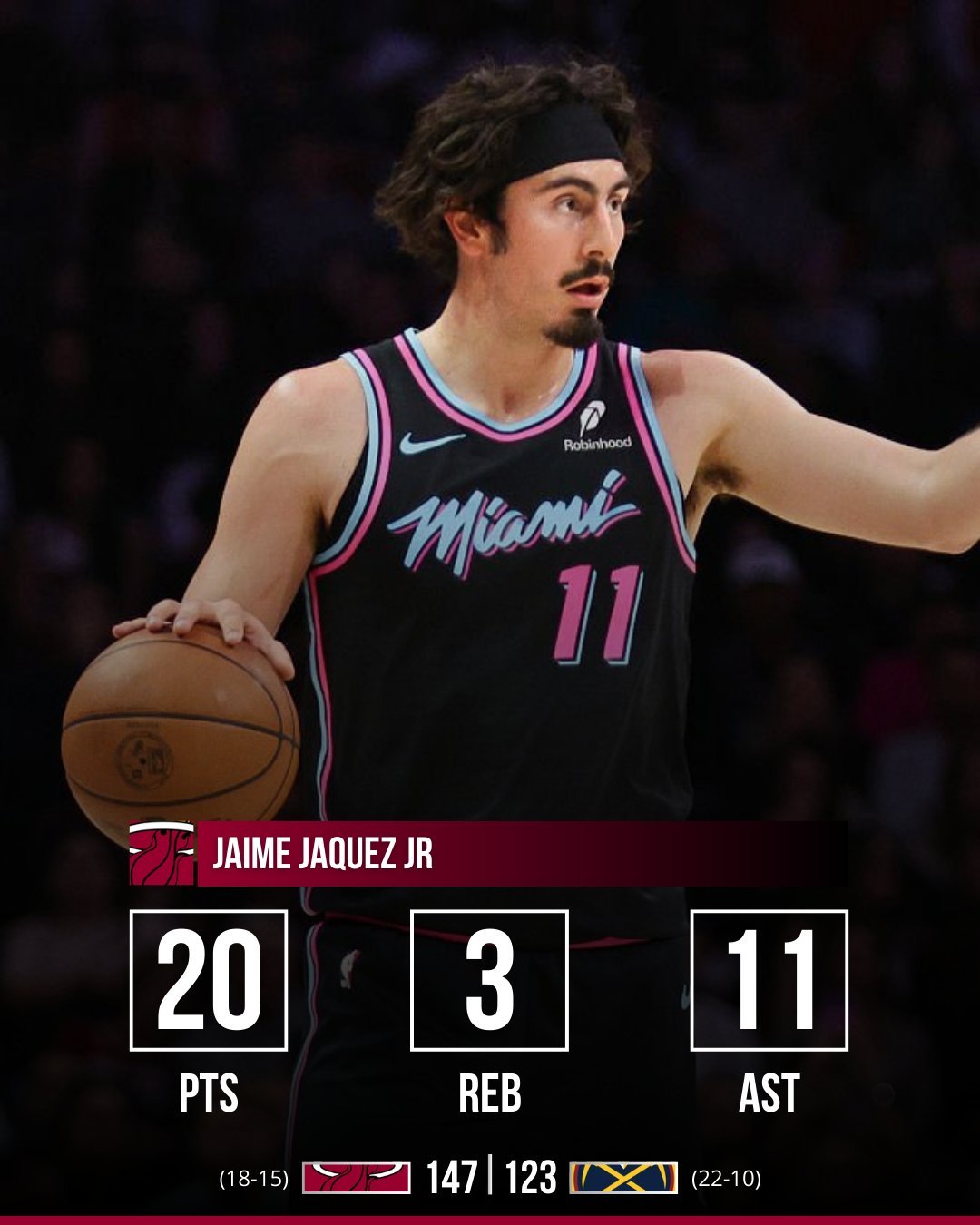 热火147-123 大胜掘金。 • 小海梅·哈克斯:20 分 + 11 次助攻 • 鲍科比:25 分 • 约维奇:22 分 + 5 次助攻