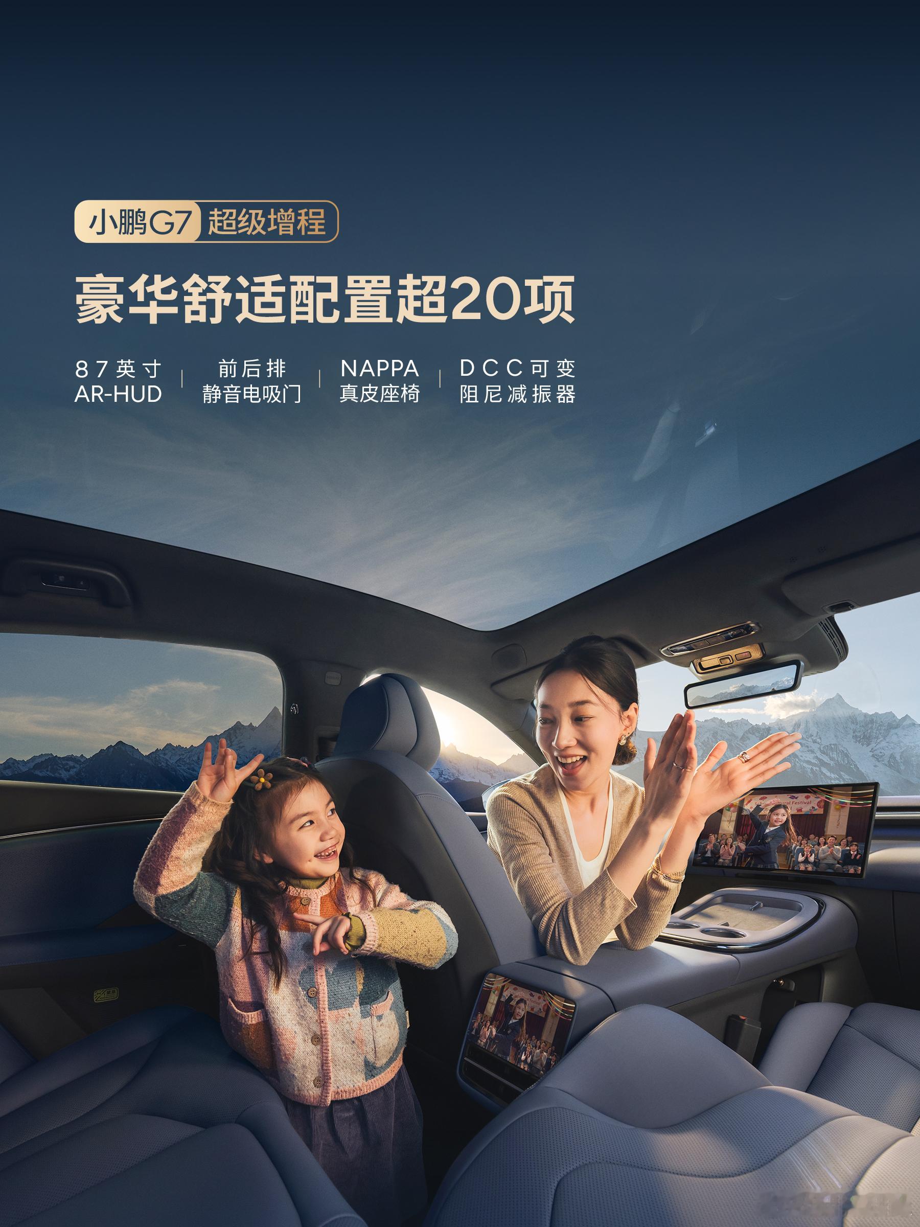 G7这次新增了全新外观颜色,星暮紫。此外还有车友们最看重的副驾专属零重力座椅。我每次开X9接送娃时,都会到后排零重力座椅躺着按摩放松一下,这个配置确实很能给人以实实在在的获得感、幸福感。跟P7+一样,G7也升级了一体式贯穿灯、20英寸运动轮毂、Power X专属尾标等等。我日常一般在小鹏超充站的480kw桩充电10分钟左右,就够一周的行程,5C大电池增程确实是当下的最优解,相信更多人体验了超级增程后,会被小鹏圈粉。1704公里超长续航SUV小鹏G7来了小鹏G7超级增程大v聊车