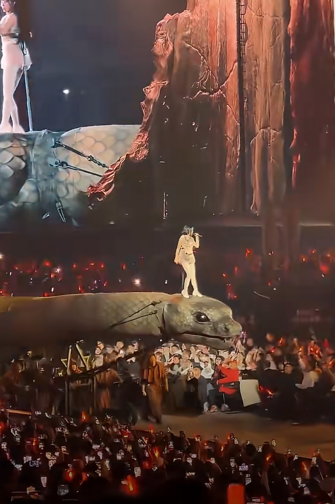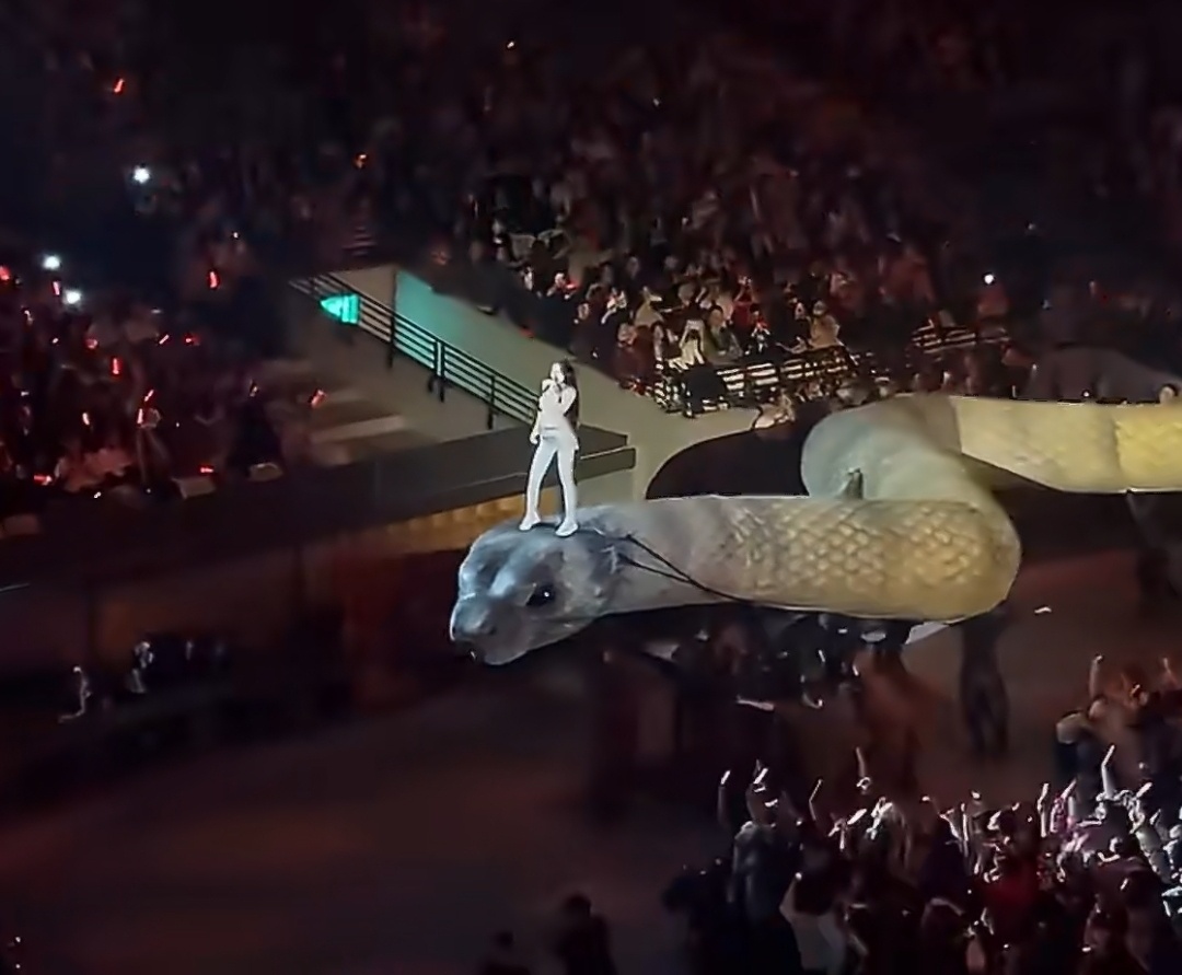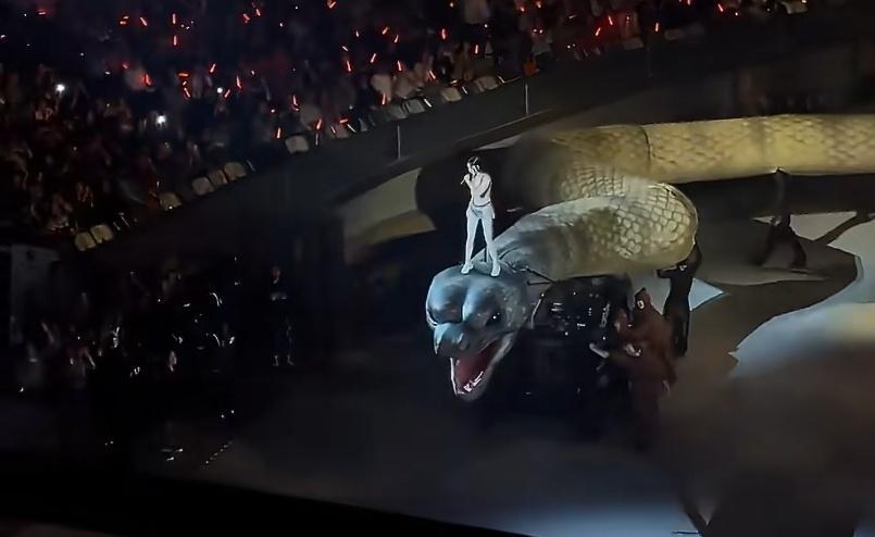 蔡依林踩蛇出场蔡依林演唱会到底是怎么设计的?让大美女踩着一个那么大的巨蛇,绕着会场跑了一圈。而且那个道具蛇做的太逼真了,虽然底下有工作人员扶着在走,但是扭动起来还是特别吓人。然后蔡依林站在蛇脑袋上,一边扭动一边唱歌。给人的感觉就是有点诡异。后面在舞台上舞蹈动作也是神神叨叨,穿的衣服好像也跟蛇的骨头有关。能想出这么个创意的人,肯定也是属蛇的吧?