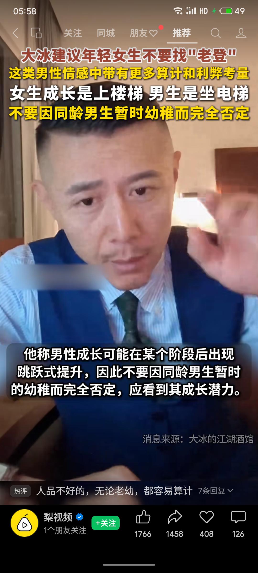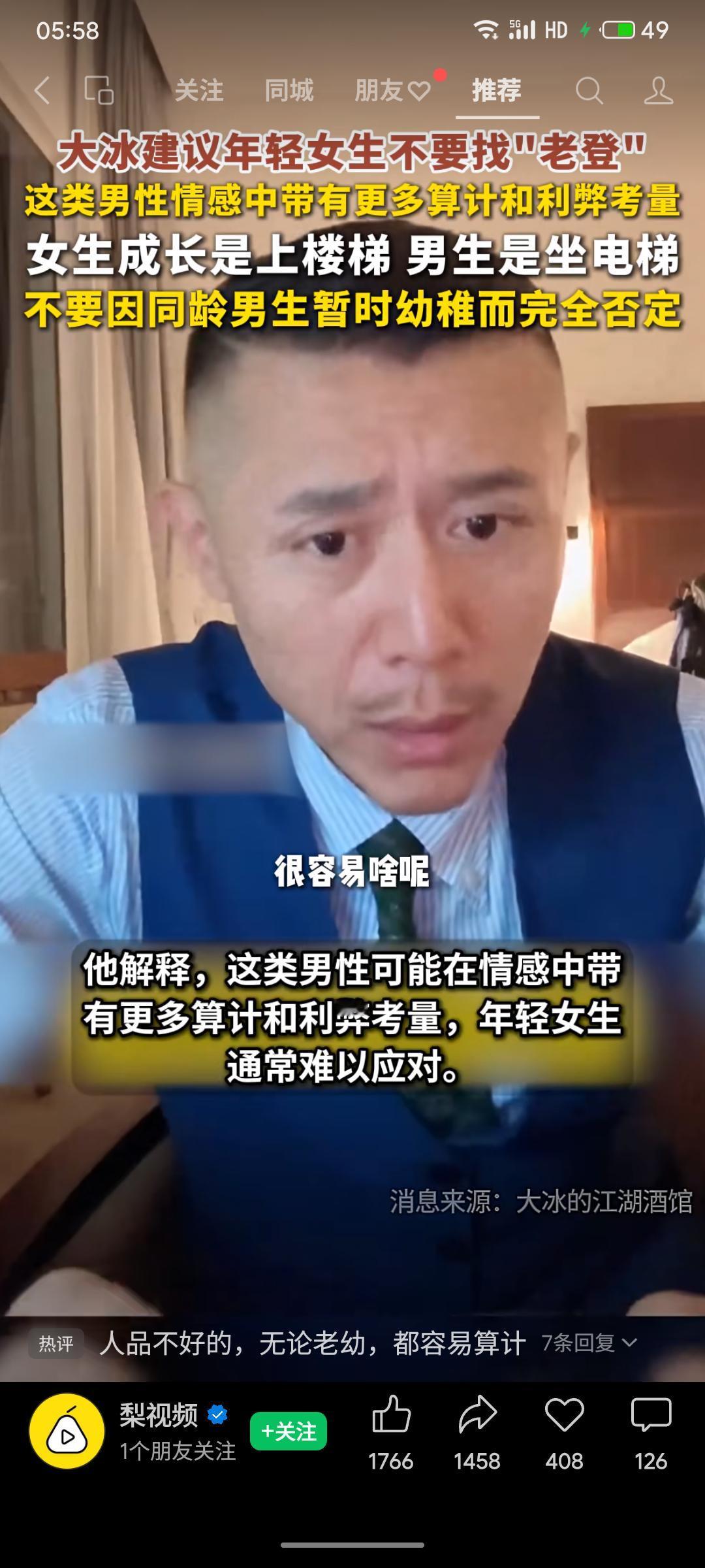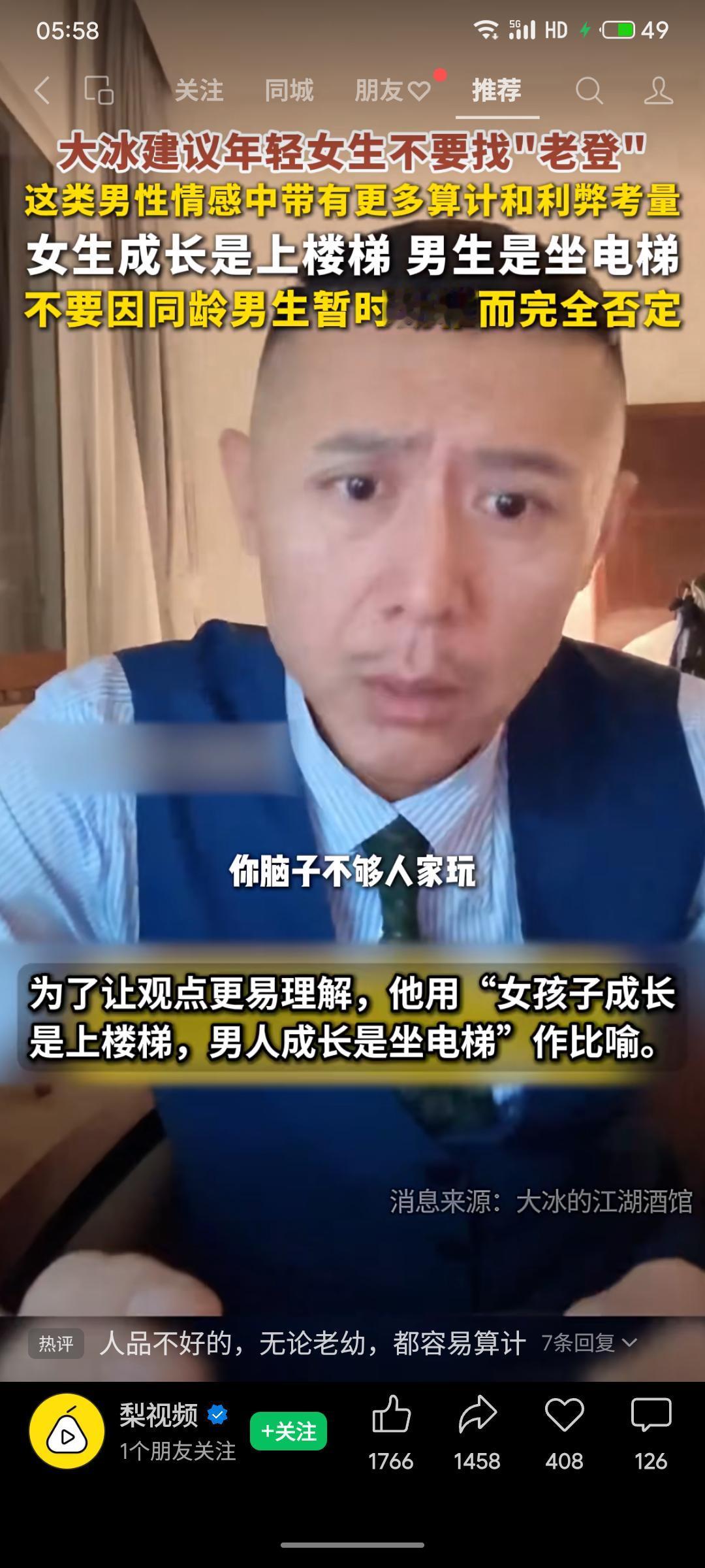 作家大冰建议年轻女生避免选择年长男性(“老登”),认为这类男性在情感中可能更具算计。他以“女生成长是上楼梯,男生是坐电梯”作喻,指出男性成长可能存在跳跃,因此不应因同龄男生暂时幼稚而否定其潜力。