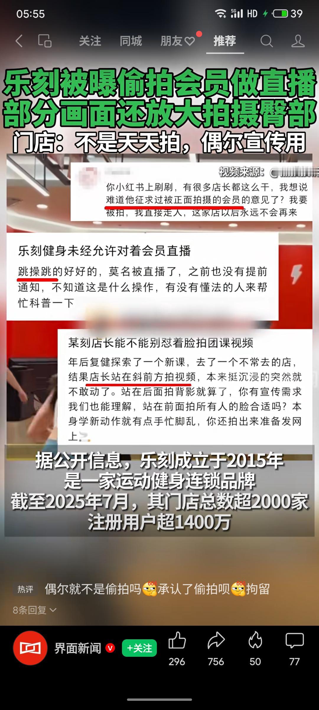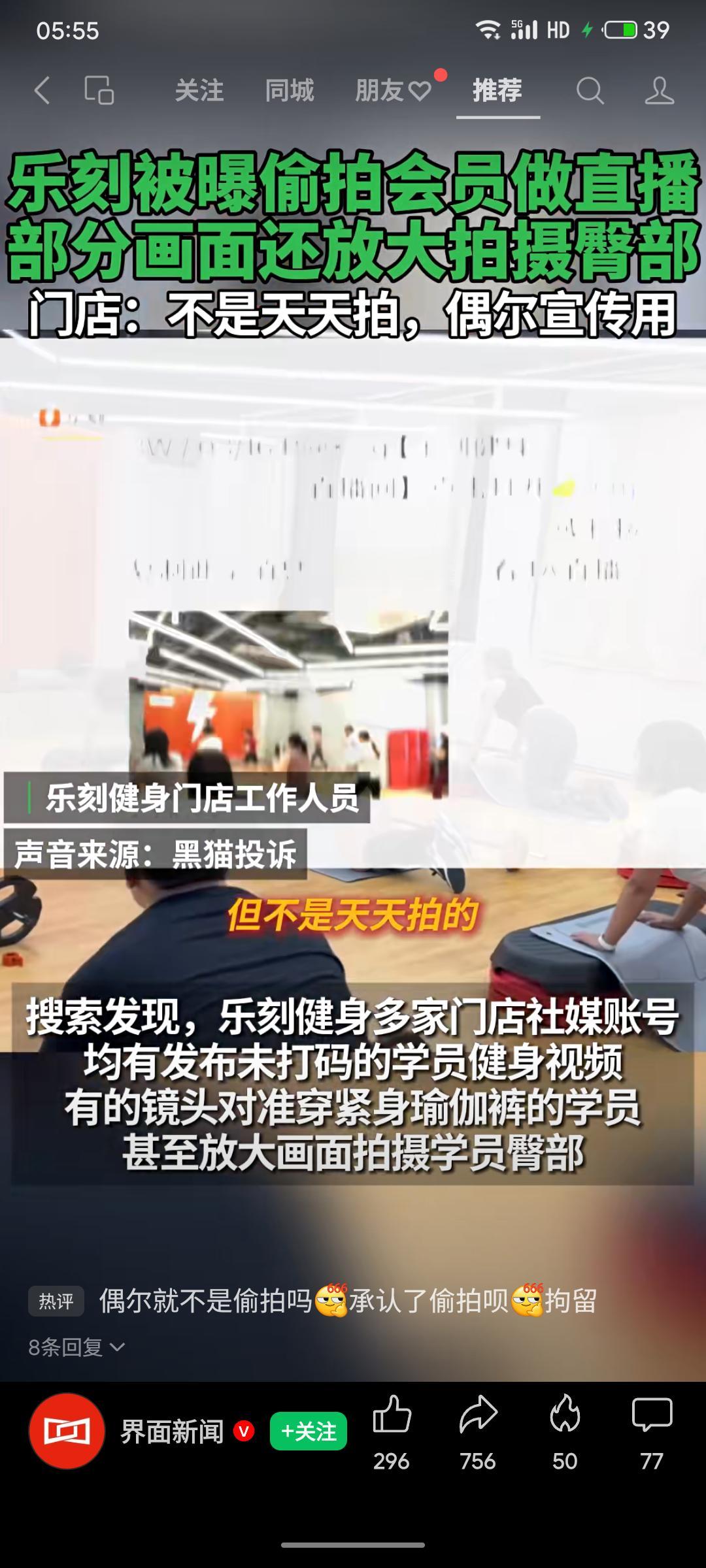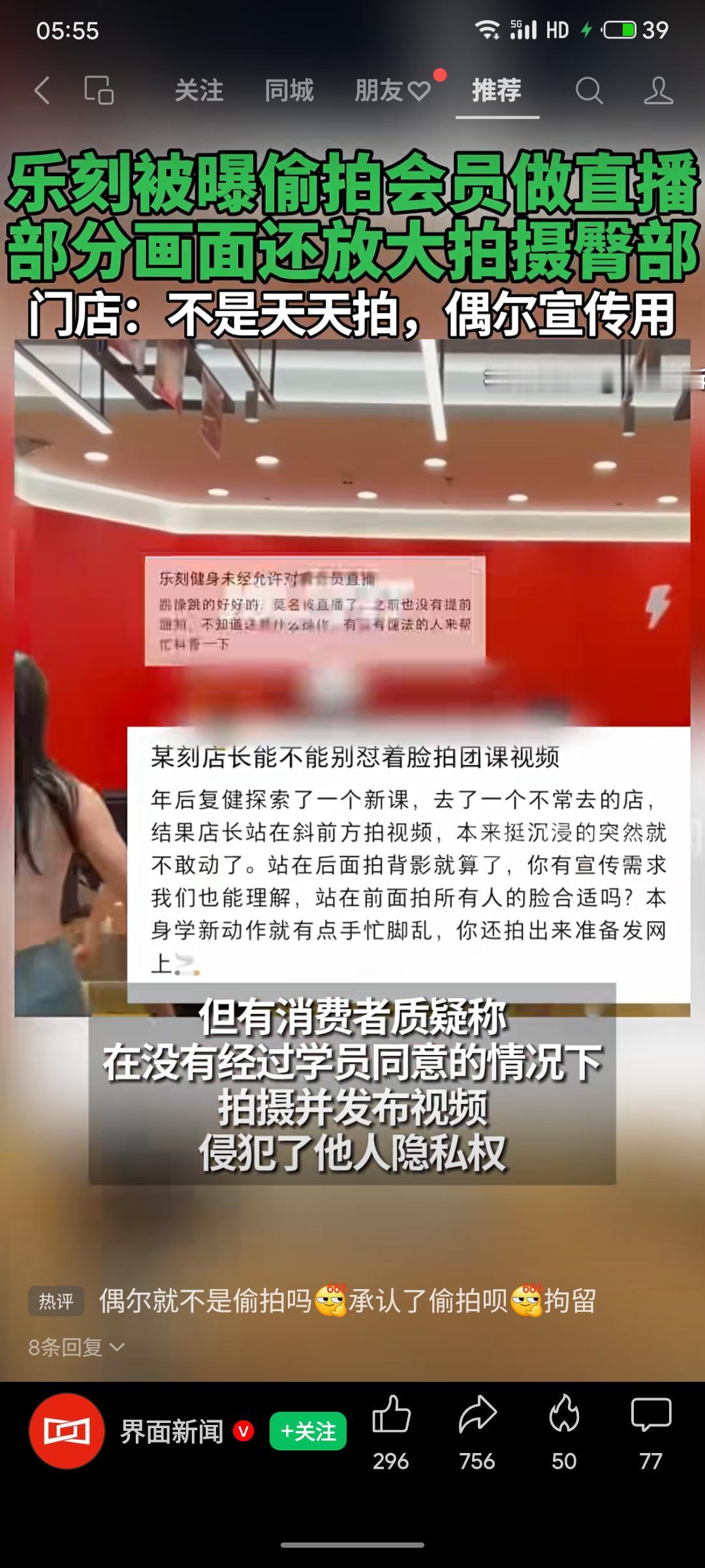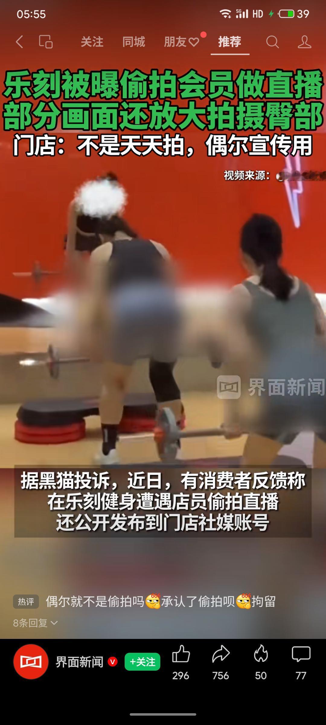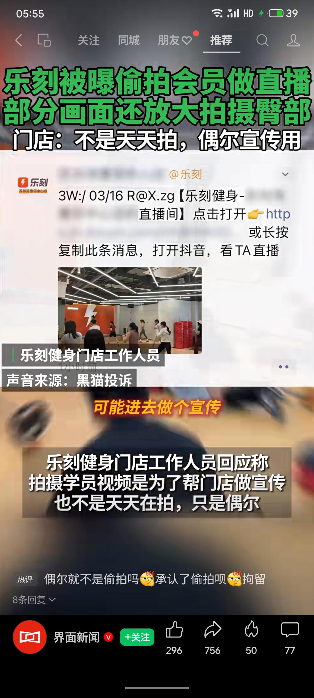 乐刻健身被投诉在未获允许的情况下偷拍并直播会员锻炼画面,部分镜头甚至特写臀部。门店辩称仅为“偶尔宣传”。此举涉嫌严重侵犯会员隐私权,其“非天天拍”的回应更显对法律与消费者权益的漠视。