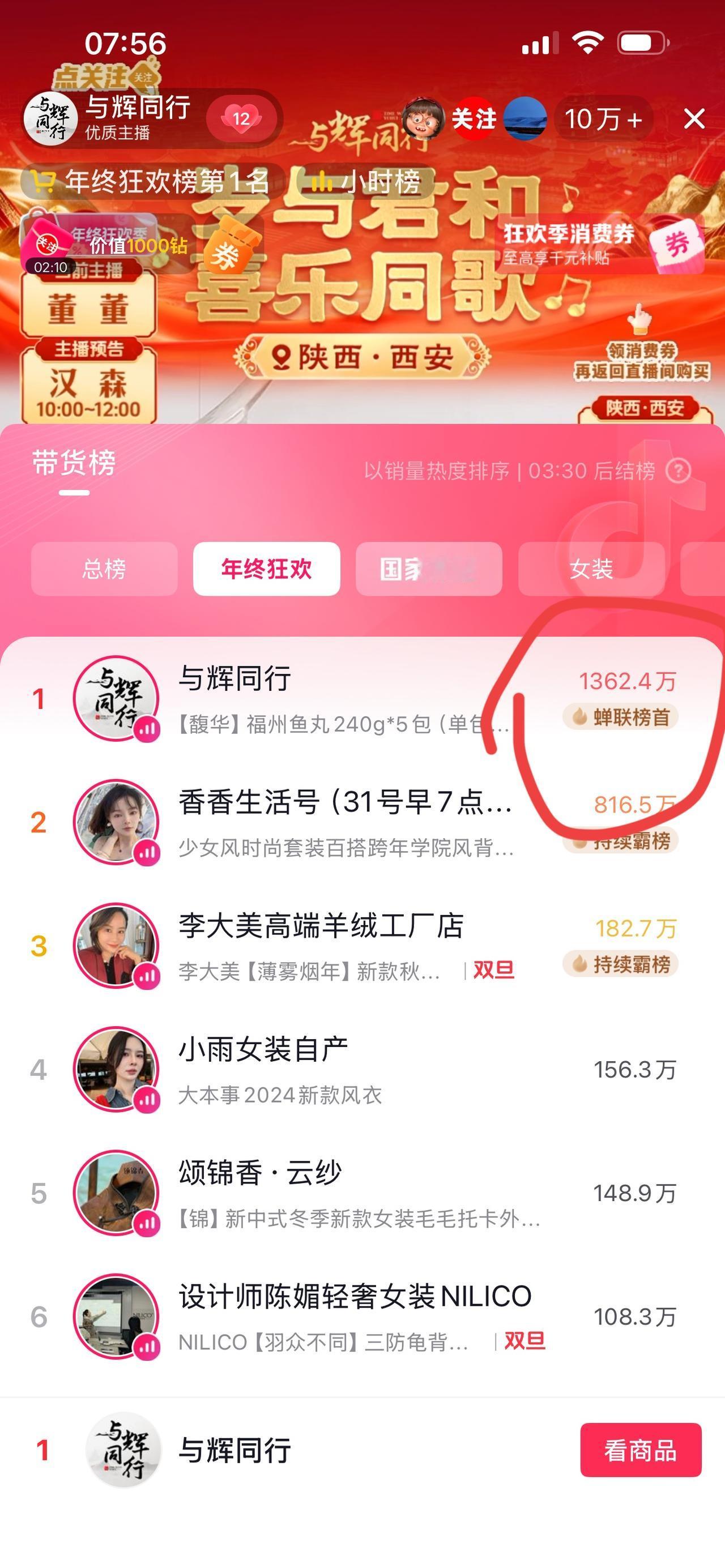 我要拉黑与辉同行![流泪][流泪] 你们的定制吐司就不能一次多备点货吗? 我今天准时蹲守直播间, 信心百倍的笃定能抢到。 因为董董昨天说今天15单, 而且还限购了, 就是一个账号只能买一单。 所以我想着吧, 按照昨天早上的十几万人的人气, 我今天无论如何也能抢到一单。 结果吧, 抖音系统又崩盘了, 我点开链接就显示网络错误, 又是抢了个“大鸡蛋”。 最后董董说我们单量增加了, 但是直播间人太多, 43万人在线抢15万单吐司, 难怪系统又崩了。 我在公屏上说: 董老三,从此以后我和你势不两立, 宇辉上播以后的我天天蛐蛐。[大笑][大笑] 定制虾仁没抢到, 买了一单别的牌子虾滑做平替。 既然来了不能空手走, 好歹买点啥安慰一下我这受伤的老心脏, 不然我更是意难平。 今天是在西安直播, 晚上九点悦享会开始。 昨天直播数据依然不是很好, 又没能过亿。 大哥跑了9500万步, 交了六万个新朋友。 2025的列车即将到站, 这个月大哥威武, 累计跑了37亿步。 小兰妹妹跑了1700万步, 交了新朋友2万。 这个月小妹妹也很优秀, 累计跑了4.4亿步。 晚上九点跨年悦享会直播, 千万不要错过。 董宇辉
