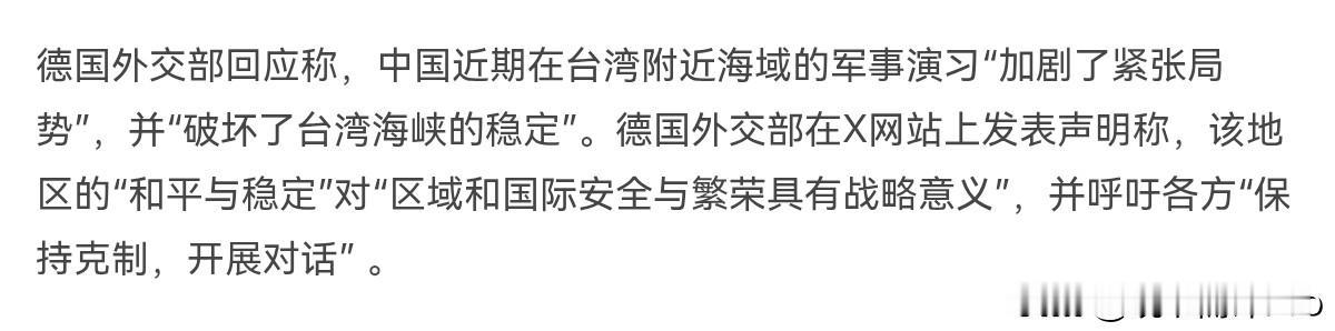 对于我们的对台军演,德国进行回应了!12月31日,德国外交部回应称,中国近期在台湾附近海域的军事演习“加剧了紧张局势”,并“破坏了台湾海峡的稳定”。该地区的和平与稳定对区域和国际安全与繁荣具有战略意义,并呼吁各方保持克制,开展对话。 很显然,德国方面的意思很清楚,那就是德国对我们的军演行动表示反对,并认为这导致了台海局势的不稳定。不过,我们倒是奇怪的是,我们在自己家门口进行军演,且演习区域基本上位于我们管辖的海域,这与德国何干?美国在南海举行军演,日本在日本海军演,德国也会出来说三道四吗? 德国动不动就声称加剧了紧张局势,破坏稳定,美国的对台军事,高市早苗的挑衅言论,难道不是加剧紧张局势,破坏稳定吗?德国为什么不公开进行反对?别人可以挑衅我们,我们却要对此听之任之,德国是这种逻辑吗?这当然是不可能的。德国与其假惺惺的表态希望台海和平,不如真心实意的支持我们和平统一。发表一些别有用心的声明,本质上就是要在台湾问题上做文章,对于这一点,我们没有接受的道理。