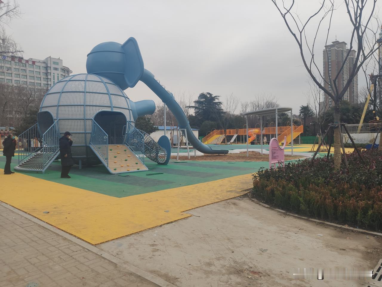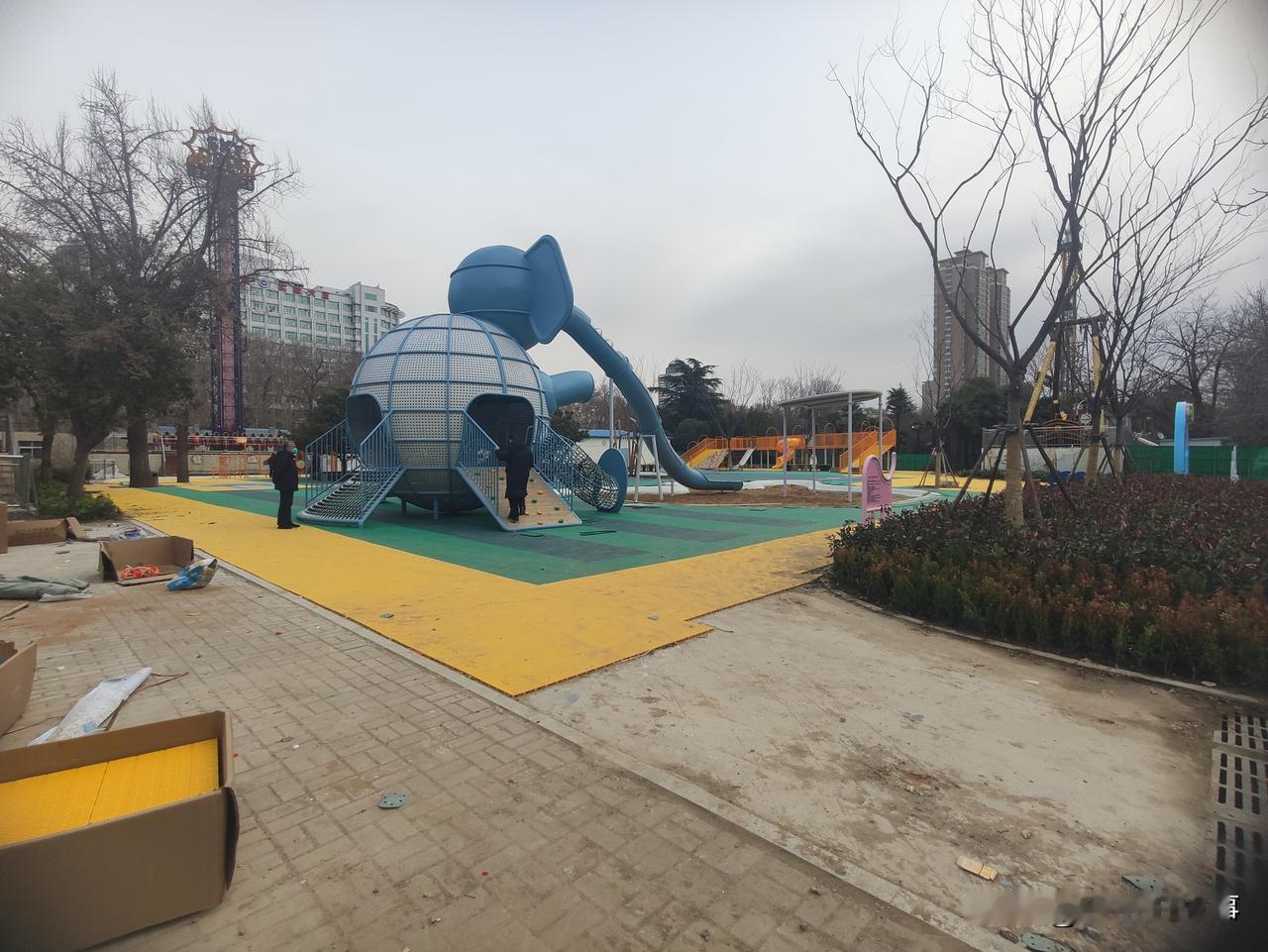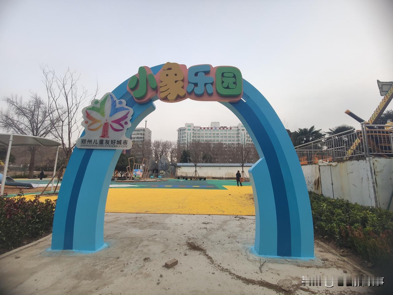 郑州市人民公园里又有一处新景观——小象乐园,将对游人开放,里边有针对儿童修建的各种娱乐器材,届时可供儿童玩耍,今天上午在现场看到,里边各种儿童娱乐设施一应俱全,就连洗手盆和休息凳都一应具备,主体设施已经修建完成,施工人员正在对地面塑胶进行铺设和扫尾工作进行布置。未来的大门口:“小象乐园”的下面:“郑州儿童友好城市”几个字倍显温馨。