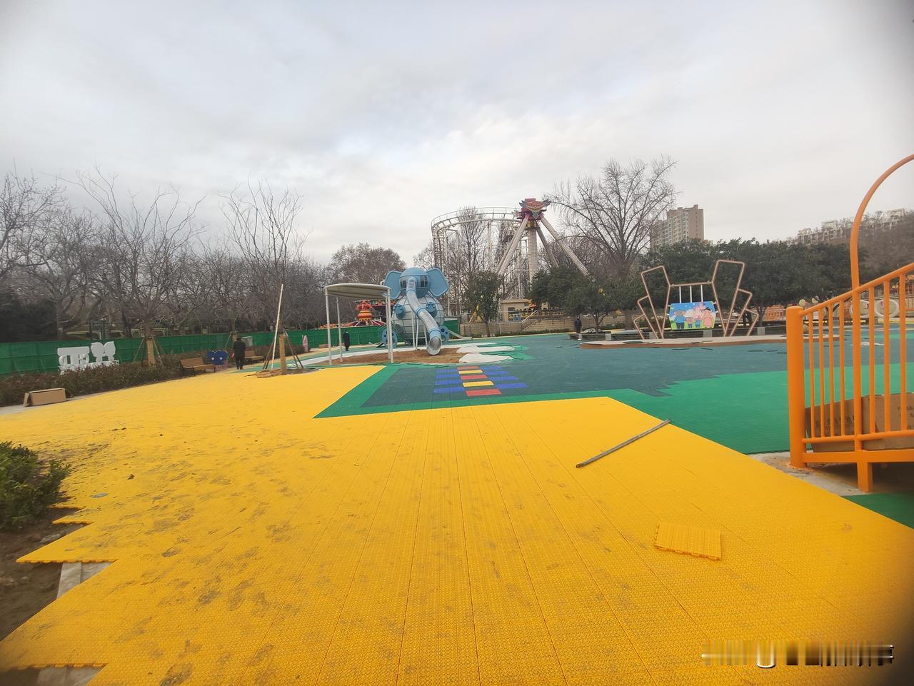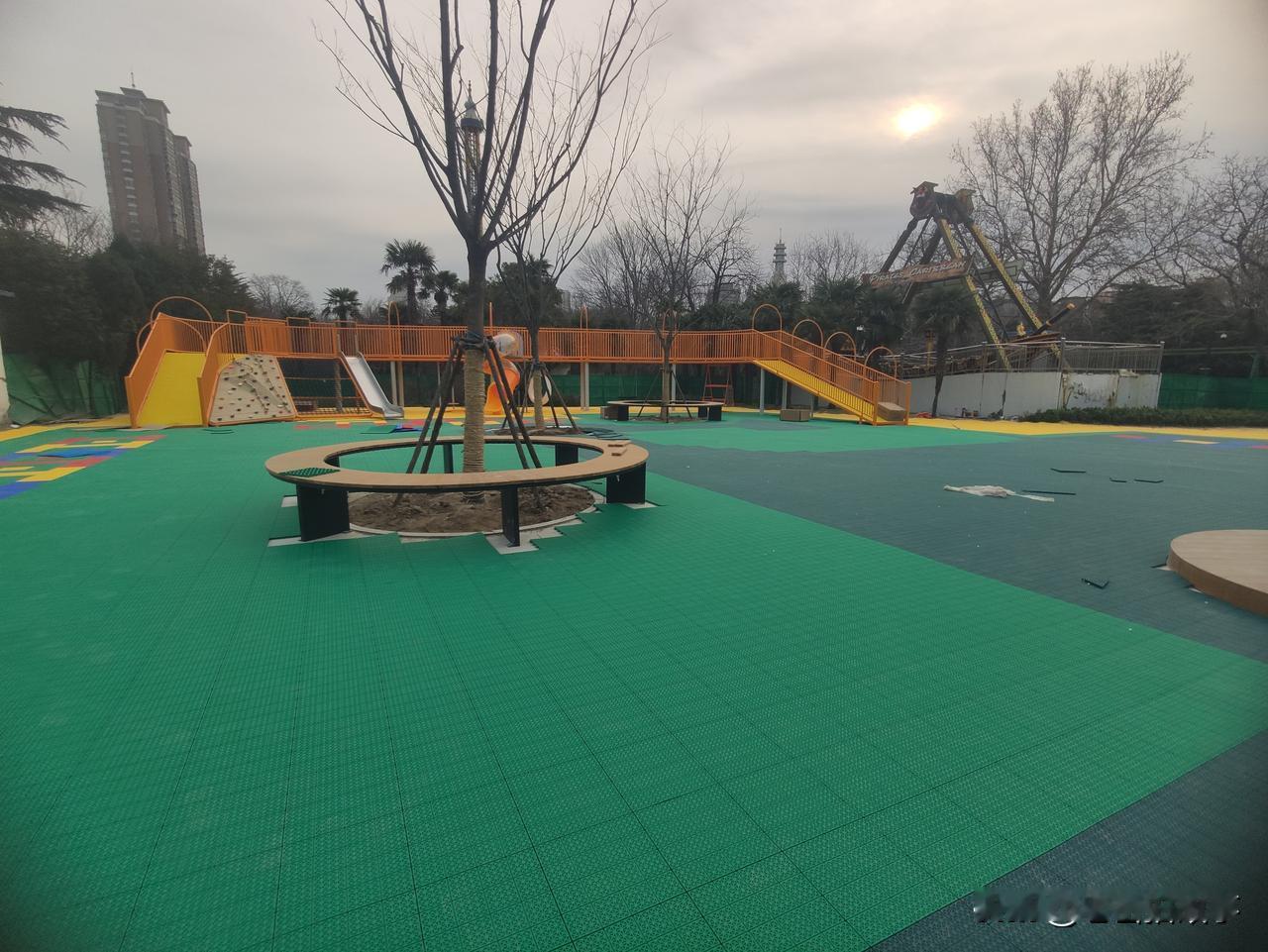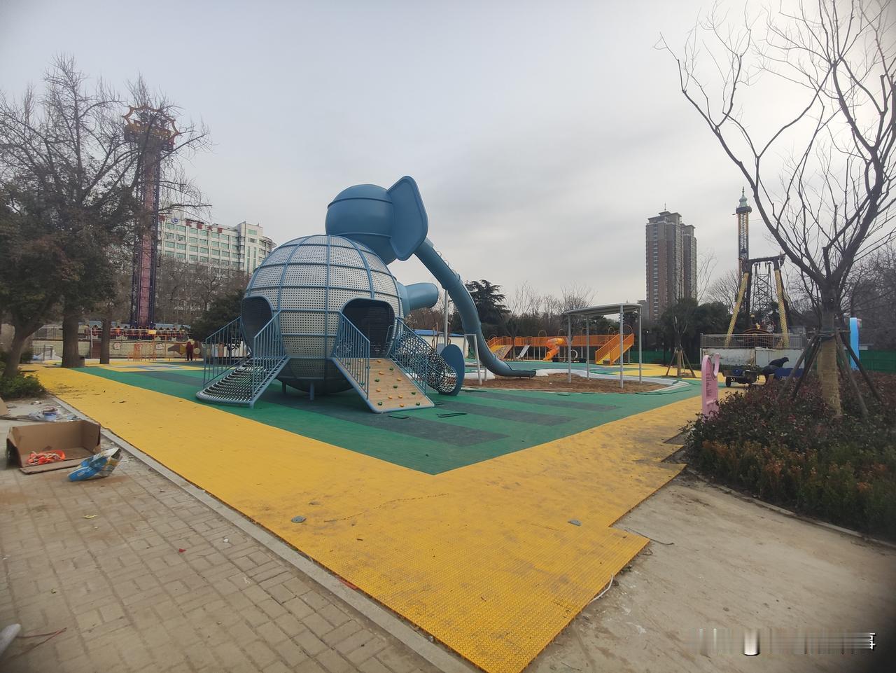 郑州市人民公园里又有一处新景观——小象乐园,将对游人开放,里边有针对儿童修建的各种娱乐器材,届时可供儿童玩耍,今天上午在现场看到,里边各种儿童娱乐设施一应俱全,就连洗手盆和休息凳都一应具备,主体设施已经修建完成,施工人员正在对地面塑胶进行铺设和扫尾工作进行布置。未来的大门口:“小象乐园”的下面:“郑州儿童友好城市”几个字倍显温馨。