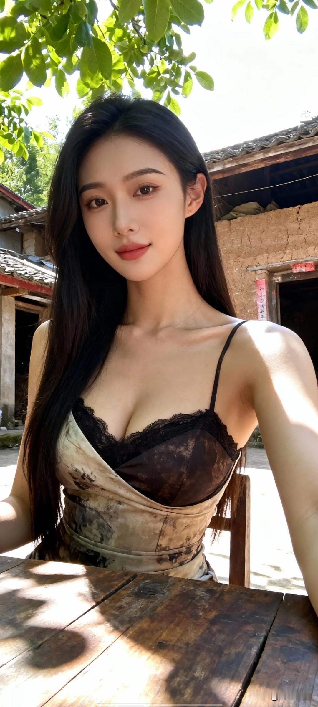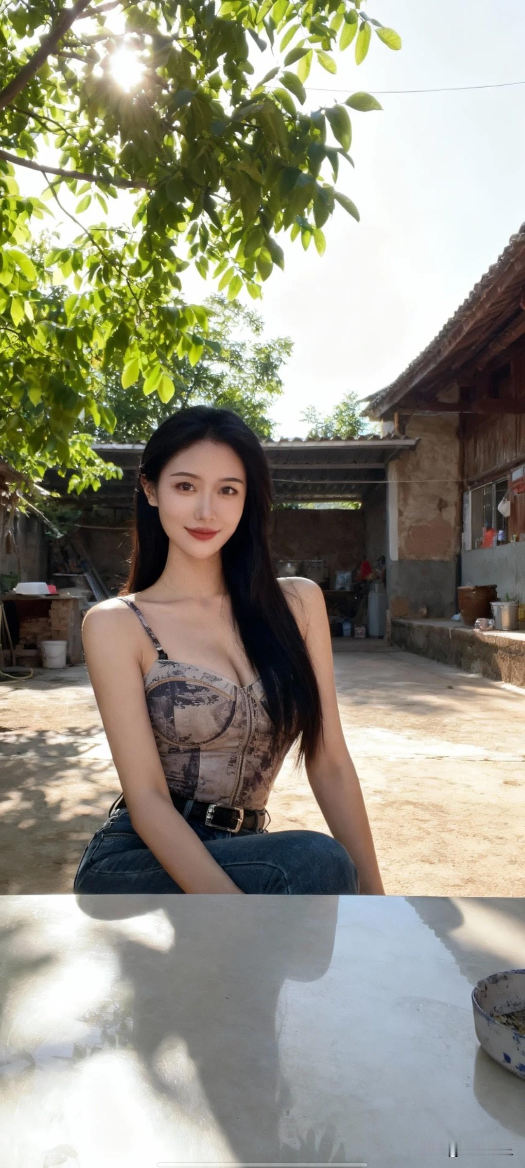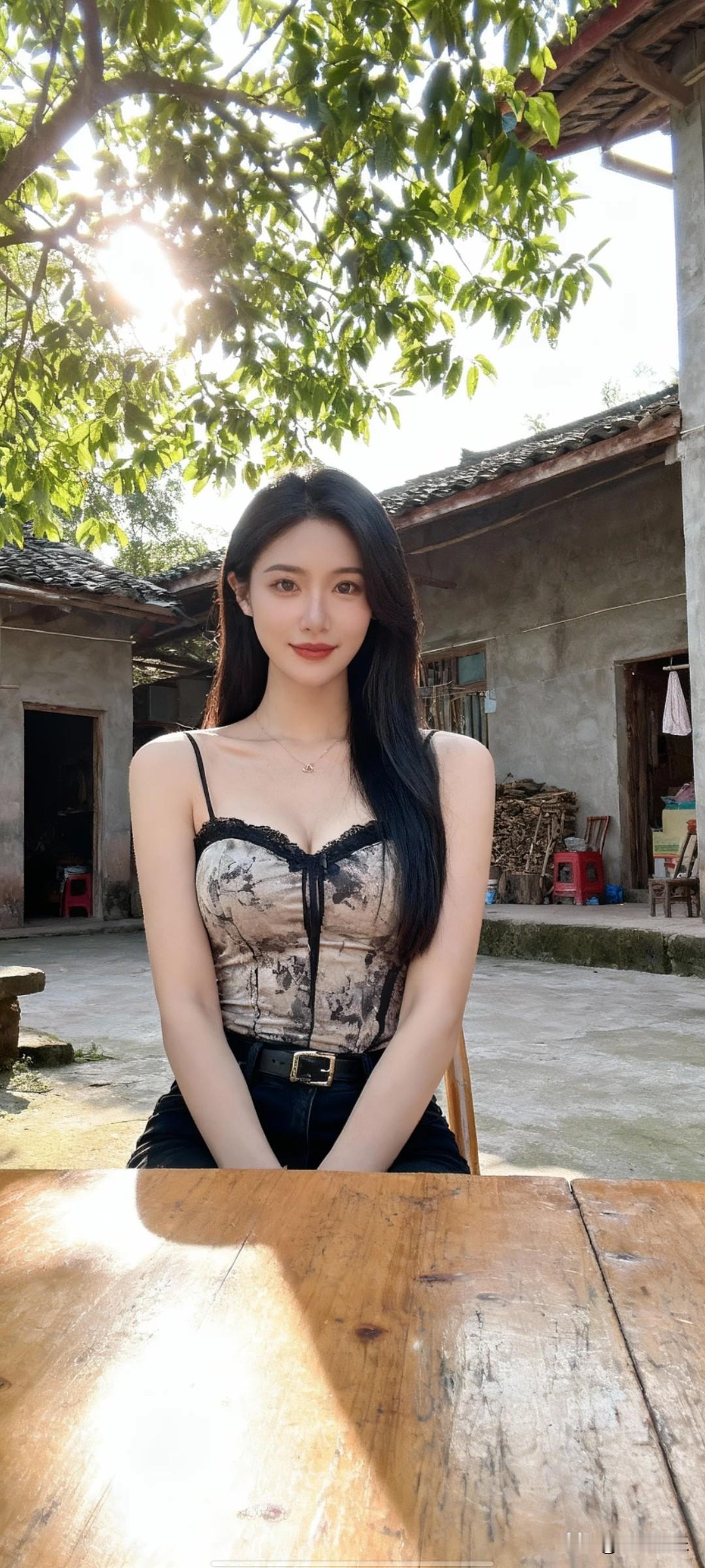 日常生活快照,非特定构图与打光,随手一拍的感觉。第一人称视角,中国女性,穿着时尚,身材完美,高个子,乡村小院内,坐在桌前。