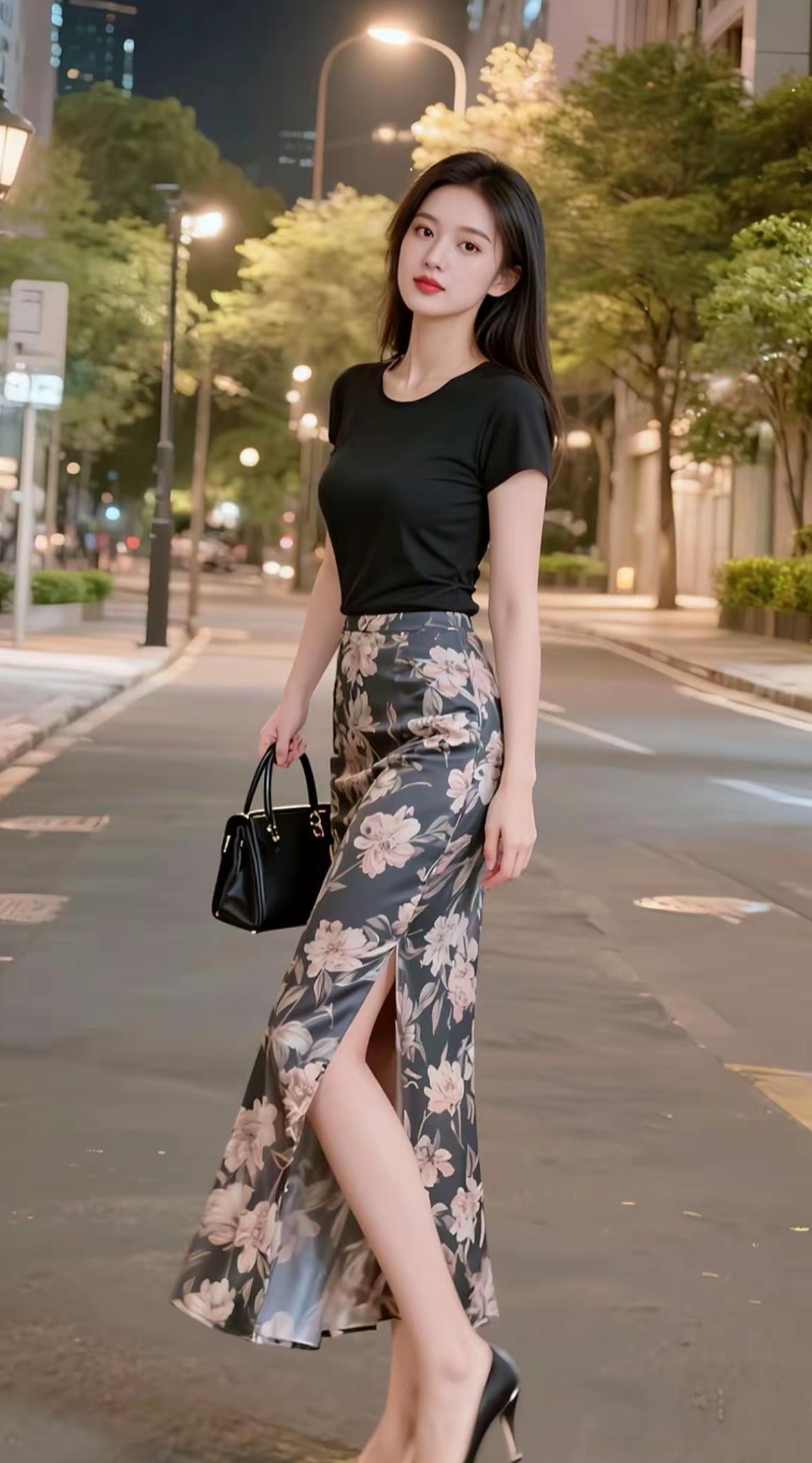 夜晚的街拍,黑T恤搭配印花长裙,优雅迷人!