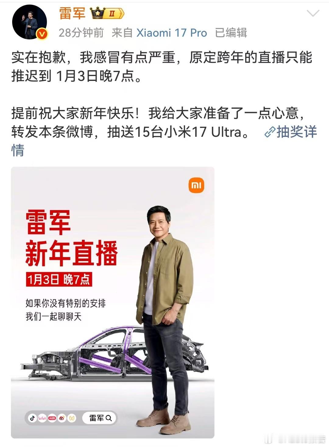 雷军跨年直播推迟12月31日,发文:实在抱歉,我感冒有点严重,原定跨年的直播只能推迟到 1月3日晚7点。 提前祝大家新年快乐!汽场全开雷军感冒严重推迟直播雷军跨年直播拆车雷军直播