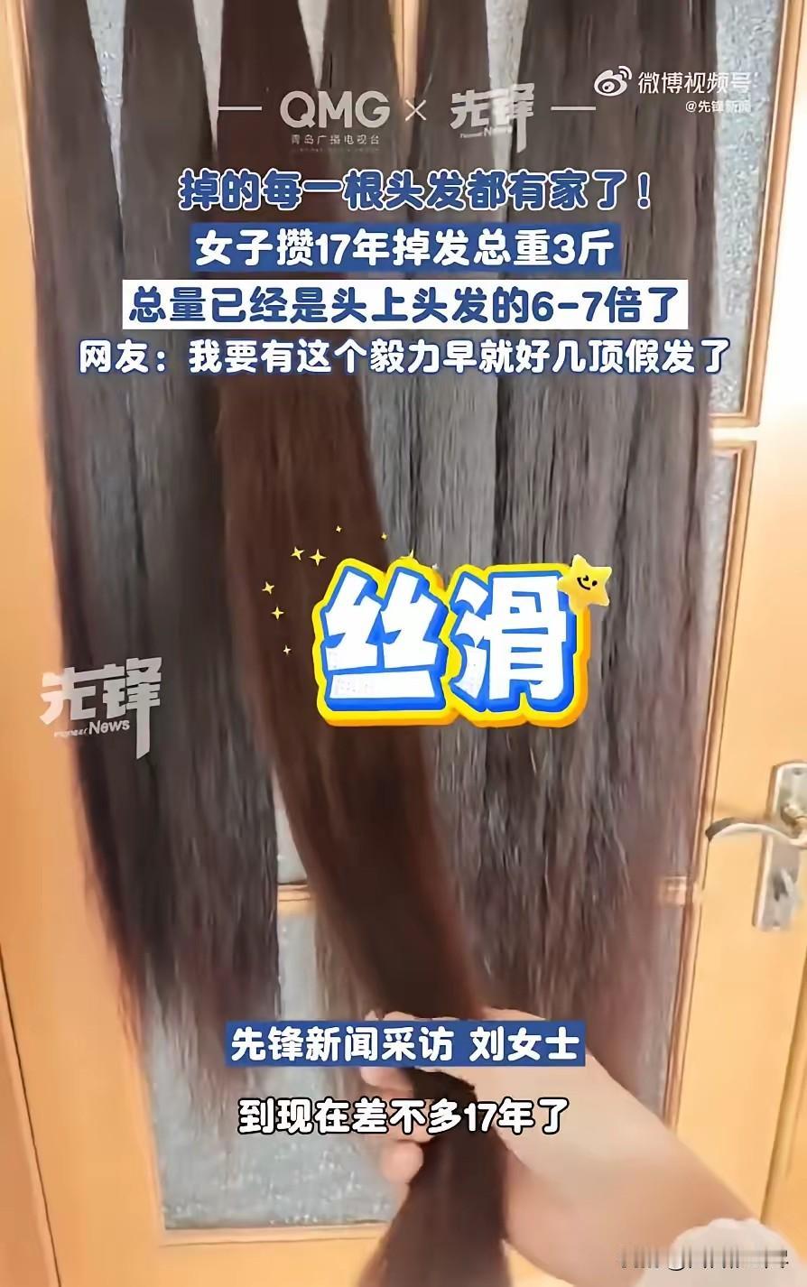 这下赚大了!辽宁大连,一女子有个特殊的爱好,就是把自己的掉下来的头发收集起来,而这一收集就是17年,现在攒下来的头发已经达到了3斤重。网友:这要卖了就值钱了! 女子打小就对自己的头发格外在意,每次梳头洗头掉落的发丝,别人都是随手丢进垃圾桶,她却舍不得,总觉得这是自己身上的东西,扔了可惜,慢慢就养成了收集掉落头发的习惯,这一坚持就没停下过。 刚开始收集时没多想,就是单纯不舍得丢弃,每次掉落的头发都小心翼翼捋顺,用皮筋扎成小束,整齐放进专门准备的盒子里,日子久了就成了改不掉的习惯,不管是在家梳头掉落,还是出门在外打理头发落下的发丝,都会妥善收好带回家,从没有遗漏过一次。 平日里梳头,她会提前在梳子下垫张纸巾,梳完把掉落的头发仔细捡起来捋整齐;洗头时更是格外留意,洗完后俯身把地漏上的发丝一根根拾起,用清水冲干净,擦干水分后再扎束收纳; 就连偶尔去理发店修剪头发,剪下的碎发也会特意叮嘱理发师留存好,自己带回家统一存放,半点都不浪费。 这一收集就是17年,从青涩年纪到为人处世沉稳,身边的很多习惯都变了,唯独收集掉落头发的爱好始终没变,家里装头发的盒子换了一个又一个,从最初小小的首饰盒,换到后来的收纳箱,每一个都装得满满当当,摆放得整整齐齐。 她收纳头发的方式格外细致,会按年份分好类,每一束头发都标注好大致日期,还会根据长短、发质分开整理,长时间下来,每一束头发都依旧顺滑,没有出现发霉变质的情况,看得出来平日里打理得十分用心。 前阵子收拾家里,她想着清点一下这么多年攒下的头发,便把所有收纳的头发都倒出来,找来秤仔细称重,当秤上的数字显示足足3斤重时,连她自己都吓了一跳,没想到17年的坚持,竟然能攒下这么多头发,看着眼前分门别类摆放的发丝,满满的都是成就感。 这些头发攒在一起,细细长长的一束束堆叠着,铺开后更是十分壮观,长度大多保持在齐腰以上,发质乌黑发亮,看得出来女子平日里对头发养护得格外用心,即便掉落的发丝,也依旧保持着不错的状态。 身边亲友得知她17年攒了3斤头发,都觉得十分新奇,有人觉得这爱好太特别,常人根本坚持不下来,有人调侃这么多头发留着占地方,不如趁早卖掉换钱,还有人好奇这么多年收集下来,会不会觉得麻烦,她却觉得这是一种别样的纪念,记录着自己17年来的时光变迁。 随着这事儿被分享到网上,网友们瞬间热议起来,不少人直呼这可真是宝藏,要知道优质长发在市场上本就抢手,这么多年攒下的3斤头发,品相还这么好,真要是出手肯定能卖个好价钱,妥妥的一笔意外之财。 女子坦言这么多年从没想过要卖掉这些头发,对她而言,这3斤头发不只是简单的发丝,更是17年时光的见证,每一束头发都承载着不同阶段的回忆,比起卖掉换钱,她更想继续好好珍藏,往后也会继续坚持这个习惯,把这份特别的爱好延续下去。 平日里不管工作多忙,她都会抽出时间打理这些头发,定期拿出来通风晾晒,检查是否有受潮情况,细心程度堪比对待珍贵物品,这份坚持和用心,也让身边人越发理解她这个看似特别的爱好。 如今这3斤头发依旧被她妥善收纳在家中,成为家里一道特别的风景,17年的坚持,不仅攒下了沉甸甸的发丝,更攒下了一份独属于自己的温暖回忆,这样特别的爱好,也让更多人体会到坚持带来的满满成就感。 对此,你们有什么看法,欢迎评论留言~