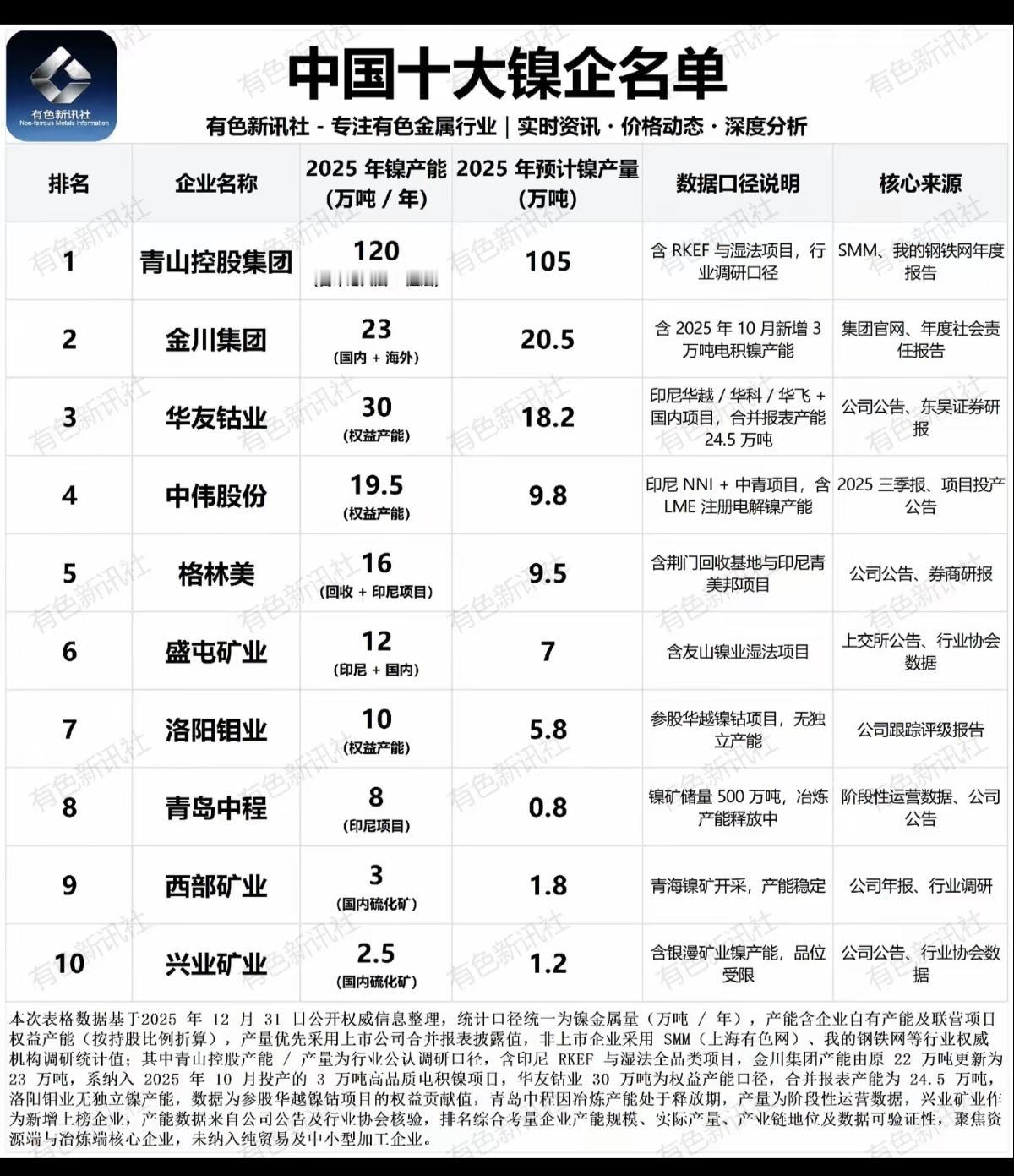 中国十大镍企名单! 伴随着印尼对镍矿资源减产,镍矿资源涨价预期明显。 现整理中国十大镍企名单,供参考。