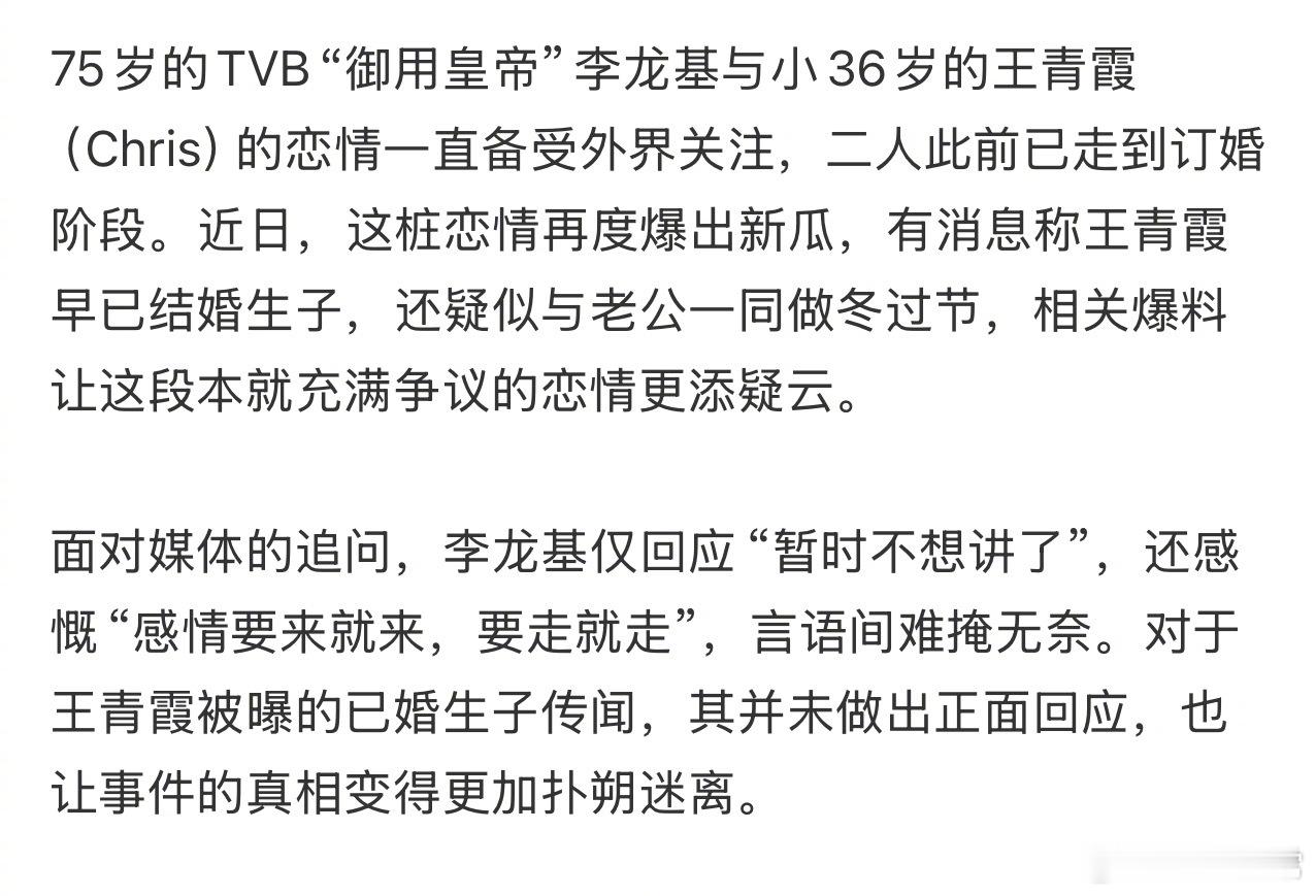 75岁香港艺人李龙基与小36岁女友王青霞分手。李龙基表示才知道自己是第三者,因为“冬至这么重要的日子都不跟我过,没办法隐瞒啦,所以她正式提出分手。”