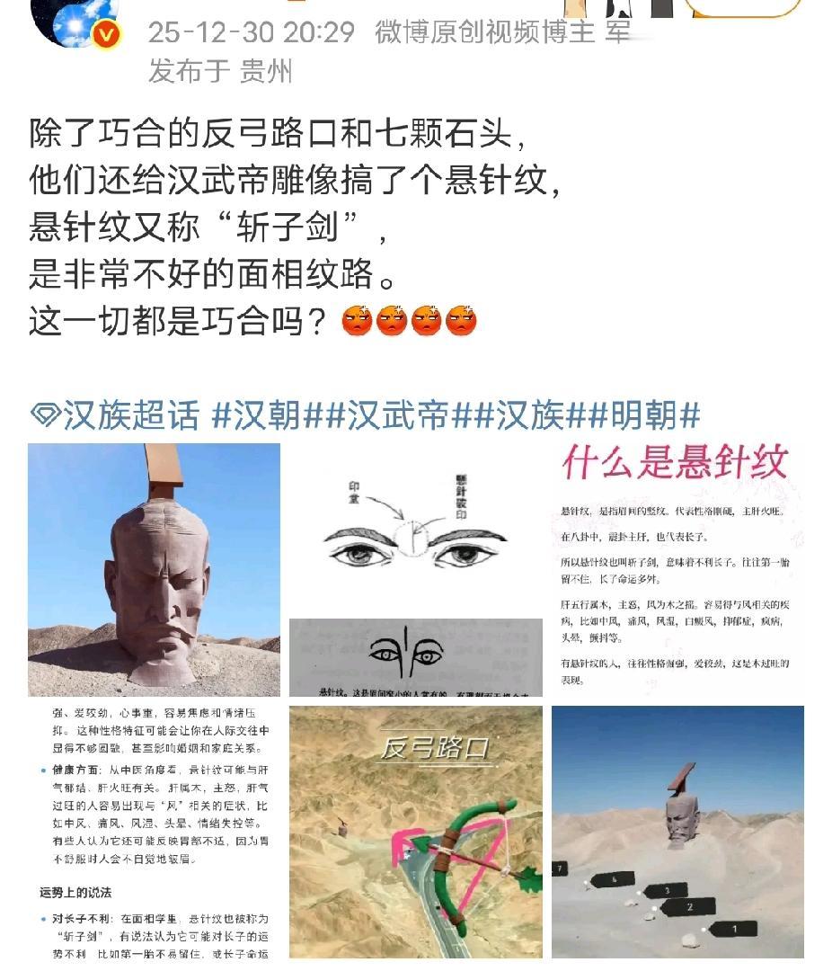 位于甘肃瓜州2020年落成的《汉武雄风》汉武帝雕像,近来又引起热议! 有网友从风水角度解读, 悬针纹(斩子剑),是寓意不吉的面相纹路,在传统面相学中被视作“斩子剑”,有不利长子、性格过刚等说法。 反弓路口,在风水学中被称为“反弓煞”,被解读为气场直冲、运势外漏的凶局。 七颗石头:雕塑前摆放的七块石头被认为是“七星锁魂阵”,结合雕塑的“独头”造型,被质疑有“锁魂”“斩龙脉”的恶意设计。 这到底是纯属巧合,还是过度解读?还真不知道不明白,有哪位高人评论区解读一下!
