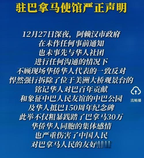 巴拿马火速修纪念碑,求中国放过?中方要求很明确:需严惩当事方   巴拿马阿赖汉市政府未经华人同意,暴力拆除中巴公园纪念碑,背后是得到了美国的旨意?我国驻巴拿马使馆抗议声刚落,巴拿马政府为何慌了神,下令立即在原址修复华人抵巴纪念碑?   巴拿马阿赖汉市政府这回算是彻底把自己架在火上烤,本以为拆除个石碑是个小事,谁能想到直接惊动了万里之外的中国,这事儿闹得实在有点太大。   咱们先把眼光投到现场,那座承载着华人奋斗史的“中巴公园纪念碑”,在推土机的轰鸣声中变成了一地废墟,当地政府给出的理由居然是“违章建筑”,这个借口听起来简直荒唐至极。   要说这背后没有点猫腻,谁都不会信,毕竟阿赖汉市一直以来跟美国那边眉来眼去,在这个敏感的时间节点动手,很难不让人联想是不是有人在后面递了话,想试探一下咱们国家的底线。   事情发生后,中国驻巴拿马使馆的反应那是相当迅速,一纸抗议声明直接送到了巴拿马外交部门面上,措辞之严厉在近年来的外交辞令中都属少见。   声明里讲得明明白白,这种拆毁纪念碑的行为,不仅伤害了中国人民的感情,更是对历史的不尊重,要求必须严肃处理当事方,并且要把纪念碑在原址修好。   咱们国家把话说到这个份上,已经算是把窗户纸捅破了,这根本不是修修补补的问题,而是原则问题。   巴拿马政府这下子是真慌了神,要知道现在的中国可是巴拿马第二大贸易伙伴,两国之间的经济往来那是相当密切,要是真因为一块石碑把关系搞僵了,这笔账他们算得过来。   就在中方抗议的话音刚落,巴拿马高层立马坐不住了,紧急下令要求阿赖汉市政府停止一切相关行为,并且承诺会尽快在原址修复纪念碑。这种前倨后恭的态度,说白了就是怕了,怕丢了中国的投资,怕断了跟中国的生意。   很多人可能不理解,为啥一块石头能让两个国家之间起这么大的波澜,其实这块纪念碑代表的是一百多年来无数华人在巴拿马的血汗史。   当年巴拿马修建铁路、开凿运河,多少华人同胞拿着微薄的薪水,干着最苦最累的活,甚至把命都留在了那里,这块碑就是对他们贡献的认可。   阿赖汉市政府想拆就拆,往小了说是办事不力,往大了说就是没把华人放在眼里,甚至可以说是一种种族歧视的变相体现。   现在巴拿马政府虽然答应了修复,但咱们的要求可不止这么简单,中方明确表示要“严惩当事方”,这句话的分量可不轻。   这意味着光把碑立起来是不够的,那些当初拍板决定拆除、那些动手推倒石碑的官员,必须得付出代价,必须要给中国、给在巴华人一个明确的交代。如果只是做做表面文章,换个地方立个碑,那咱们这一关肯定是过不去的。   再往深了想,这事儿也暴露出有些国家骨子里的那种傲慢,总觉得自己背后有靠山,就能随意践踏别人的感情,随意抹杀历史。   他们显然是打错了算盘,如今的中国早就不是一百多年前那个任人宰割的旧社会了,我们在海外的利益和尊严,谁要是敢动一下,必然要付出沉重的代价。巴拿马这次要是处理不好,不仅仅是外交上的难堪,在经济合作上恐怕也要重新掂量掂量。   现在全世界的目光都盯着巴拿马政府接下来的动作,看他们到底怎么个“严惩”法,看他们怎么把这块碑原封不动地立回去。   这不仅仅是一次简单的修复工程,更是一次关于诚意和尊重的考试,如果巴拿马政府还想继续搭上中国发展的快车,想继续享受中国市场的红利,那就得拿出实实在在的行动来,别想用几句不痛不痒的道歉就糊弄过去。   在这个世界上,尊重永远是相互的,你敬我一尺,我敬你一丈,但你要是想骑在头上拉屎,那绝对不行。这次巴拿马火速修碑的举动,恰恰证明了中方立场的有效性和坚定性,也让那些想跟着别人起哄、想搞小动作的国家看清了形势。   咱们中国人在哪里都是硬骨头,谁也别想欺负,这事儿咱们会一直盯着,直到一个满意的结果出现为止。