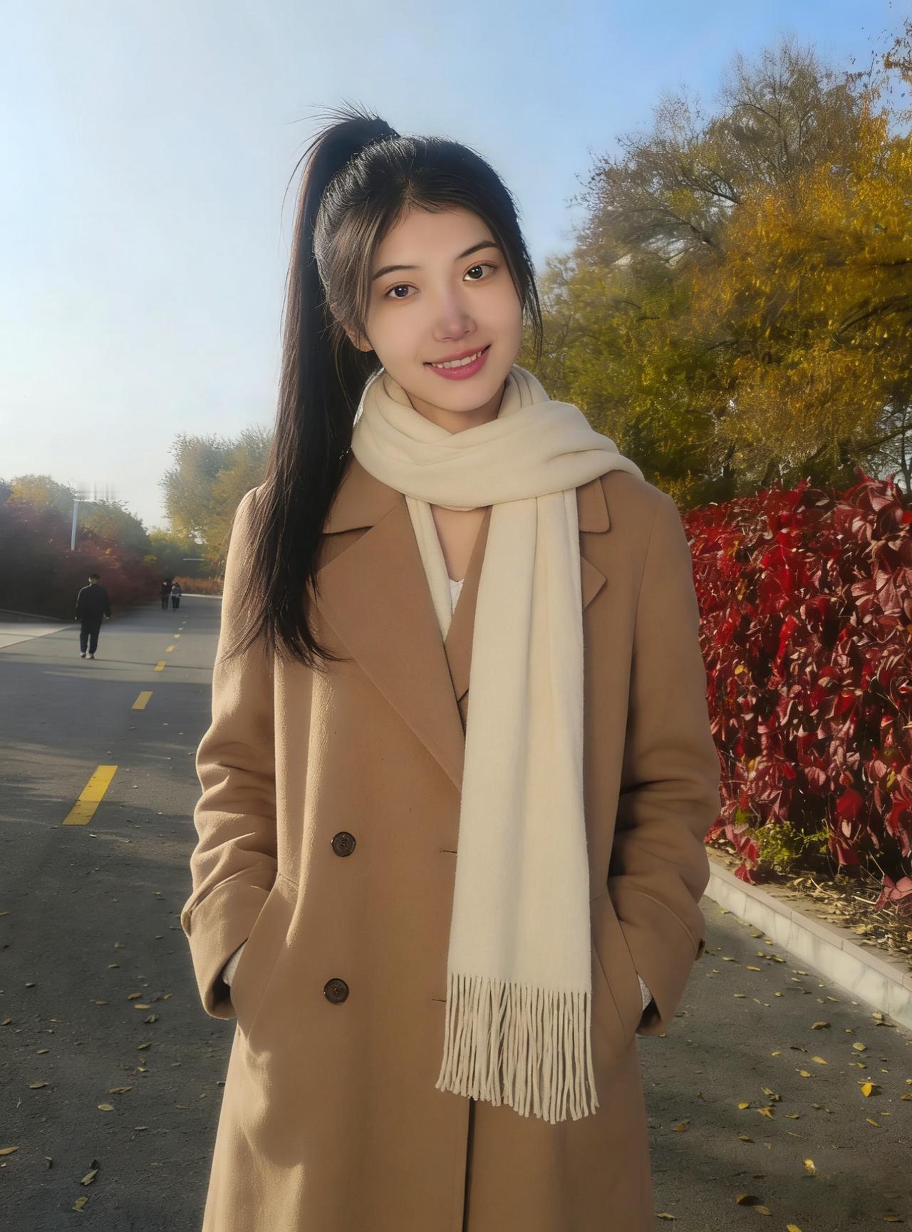 秋阳满地照霜林,佳人凝伫幽思深。 围巾浅映丹枫色,长发轻扬拂远岑。