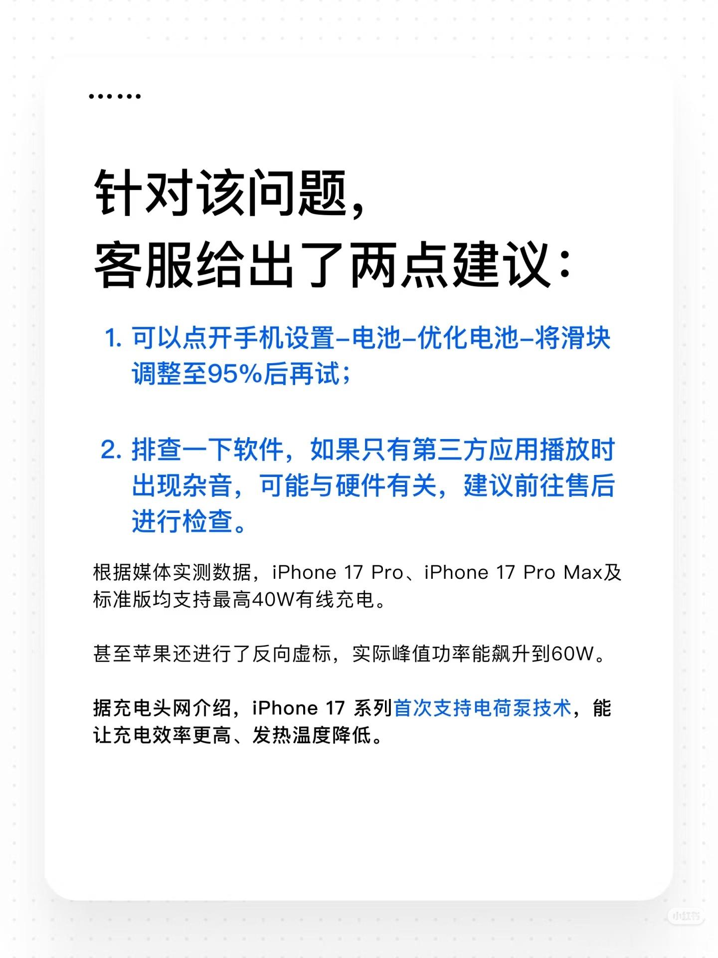苹果回应iPhone17Pro充电嘶嘶声苹果客服回应已经收到类似反馈!建议进入设
