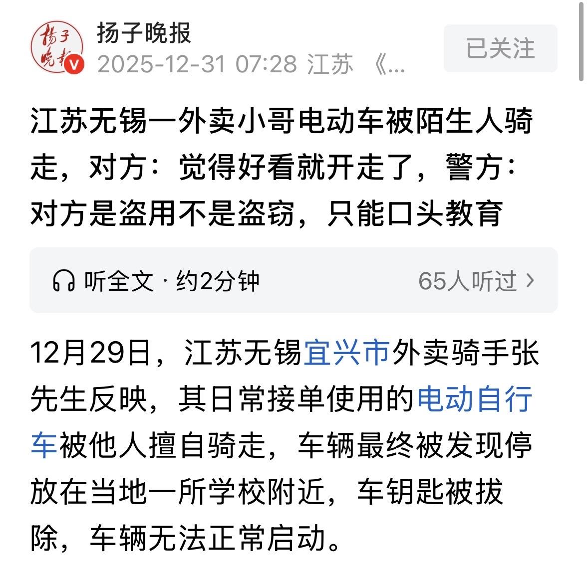“上哪说理去?”江苏无锡,一外卖小哥发现自己的电动车被人擅自骑走,等找到车,又发现车钥匙被拔走,没法开。他报警找到始作俑者,对方只是轻飘飘一句:看车好看,就骑出去溜了一圈。更让男子气愤的是,偷车者竟被认定为盗用,而非盗窃,只能口头教育了事。男子不服,要求对方赔他误工费,却遭到拒绝,男子这下没招了! 大家都知道,干外卖这一行,全靠两条腿一辆车,车就是饭碗。 可12月29号这天,外卖小哥张先生准备接单时,却发现停在路边的电动车不见了。 这车可是他每日奔波街巷的腿脚,没了它,还咋接单跑单?这不耽误他事儿吗! 张先生当时急得不行,赶紧报了警。好在警察效率高,没过多久就把车给找着了。 车是在附近一所学校旁边发现的,但车钥匙被人给拔了,插回去也打不着火,明显是被人动了手脚。 是谁手这么欠?警察一查,是个路人甲。而他这么做的理由简直让人哭笑不得。 他觉得张先生的电动车外观好看,一时手痒痒,就骑上去溜了一圈。 溜完,他把车骑到学校附近,拔了钥匙一扔,自己走了。 在他看来,这就是个恶作剧,他只想“借用”一下,根本没想把车据为己有,也没想卖钱。 但这事对张先生来说,可不是个玩笑。车坏了得修,最要命的是这段时间没法接单,一单几块钱,积少成多,这误工损失谁来补? 张先生告诉那个骑走车的人,既然你把我车弄坏了,还害我跑不了单,得赔钱。 结果对方却一口回绝,说他没有赔钱的义务。 张先生只能把希望寄托在警察身上。但警方的处理结果让他心里更堵得慌。 警察说了,这人虽然手欠,但确实没把车卖了或者抵押,主观上没有偷车卖钱的意图。这就叫“盗用”,不算“盗窃”。 既然不是盗窃,够不上刑事案件,最后也就是把那人批评教育了一顿,放走了。 张先生哪能乐意?他认为,对方把他钥匙拔了,车都打不着火,这就是恶意破坏!这就是偷! 在他看来,不管你卖不卖,你未经允许把别人吃饭的家伙骑走了,还搞坏了,这就是盗窃行为。 可法律讲究证据,讲究主观意图。警方也有警方的难处,没证据证明他想把车拿走卖掉,就只能按治安案件或者一般的侵权来处理。 现在的局面就是:骑走车的人没事了,张先生却要自己掏钱修车,还得自己承担没单子跑的损失。 这事儿换谁身上都得憋屈。张先生现在是铁了心,既然警察这边只能教育,那就去法院见! 他已经打算走民事诉讼的路子,把这个看车好看就骑走的人告上法庭,不仅要修车费,还得把这几天没跑单的误工费一分不少地要回来。 路边的东西,哪怕再好看,那都是别人的,看一眼行,伸手就是祸! 对于张先生来说,维权的路虽然麻烦点,但这口气必须得出,该是自己的血汗钱,一分都不能少。 有人说,如果是这样,那去书店或图书馆顺书、去百货超市顺衣顺鞋等,都是为了自己用,没有进行二次售卖、抵押等处置行为,所以应该为盗用而非盗窃,口头教育就可以了呢? 很多匪夷所思的问题基本都源自于“违法的成本太低”,判得不够严、罚的不够多,变相鼓励铤而走险…… 就因为你盗用别人车辆造成损失,已有不赔损失道理,不违法但违反人情世故违反人性道德,扰乱社会正常运转的恶行,也不能成为不理赔的理由,一旦开了这个头,就等于变相默许和纵容这类危害行为漫延,人人都可放心大胆去干,整个社会都会乱套,往往一个筒单行为,就会让整个社会倒退几年甚至几十 那么,从法律角度怎么看? 《民法典》第1165条第1款规定:行为人因过错侵害他人民事权益造成损害的,应当承担侵权责任。 涉事人员擅自骑走张先生电动自行车的行为,已经构成过错侵权责任。 涉事人员明知电动自行车系他人财产,未经张先生允许擅自骑走,主观上存在明显过错。 其“车辆外观好看”的动机不构成免责理由,反而证明其放任了侵害他人财产权的风险。 拔除车钥匙导致车辆无法使用的行为,进一步加剧了损害后果,构成对财产权的持续侵害。 张先生因车辆被骑走无法正常接单,产生直接经济损失,比如车辆维修费用,和间接经济损失,也就是误工损失。 根据《民法典》第1184条,财产损失应按照损失发生时的市场价格或其他合理方式计算,误工费属于可预见的间接损失,应纳入赔偿范围。 涉事人员的侵权行为与损害结果之间存在直接因果关系,符合侵权责任构成要件。 警方认定“盗用”而非“盗窃”,主要基于刑事法律中“非法占有目的”的认定标准。 但在民事法律框架下,不构成刑事犯罪不免除民事赔偿责任。 张先生可通过民事诉讼主张权利,要求涉事人员赔偿车辆维修费、误工费等实际损失,符合《民法典》第1182条关于侵害财产权益的赔偿范围规定。 对此,你怎么看? 关注@运良说法 学法律知识不迷路