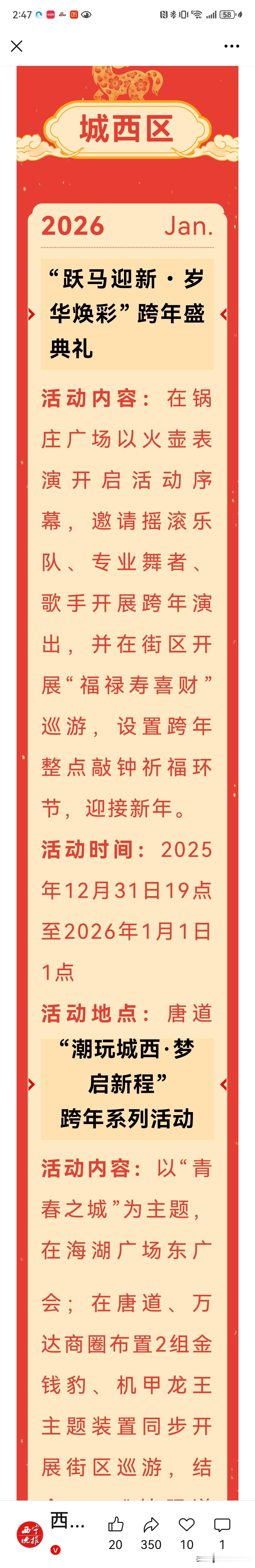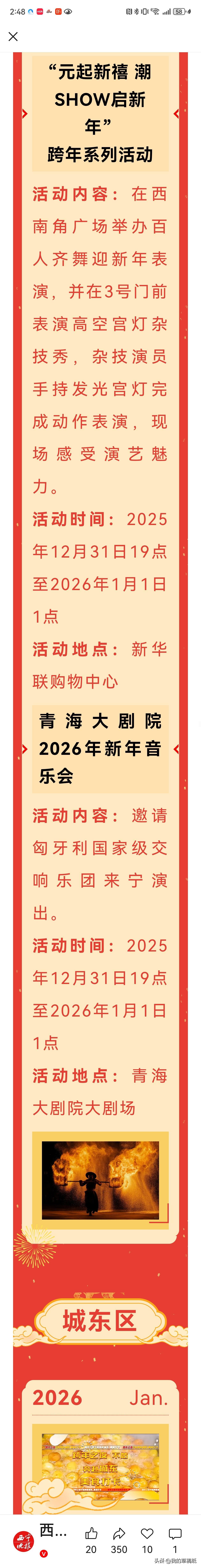 西宁今晚有二十多场跨年活动任你选!全城狂欢六小时! 朋友们,今晚西宁彻底燃起来了!从晚上七点到凌晨一点,全城二十多个地方同时开闹,不管你好哪一口,都能找到乐子! 中心广场最热闹,老传统撞上新潮流!花儿、高跷和电音、无人机同台斗艳。想吃点喝点?莫家街走起!甜醅酿皮管够,还能玩玩打陀螺滚铁环。年轻人想疯一下?吾悦、力盟商圈国潮电音齐飞,零点气球放飞,场面绝对震撼! 今年科技感十足!海湖广场那边,千架无人机在天上“画画”,骏马凤凰亮瞎眼。想祈福又怕污染?中惠万达搞了电子许愿墙和电子孔明灯,心意一样到! 怕冷又想嗨?王府井大象城在真冰上开电音节,冰火两重天!唐道637能敲钟祈福,文鑫机械厂有篝火派对……就连大通、湟源也热闹得很,篝火摇滚、古城狂奔,任你选! 政府预案做足了,安全有保障。今晚的西宁,就是个巨大温暖的跨年派对!别在家猫着了,出来一起倒计时,热热闹闹奔2026! 西宁 西宁跨年活动