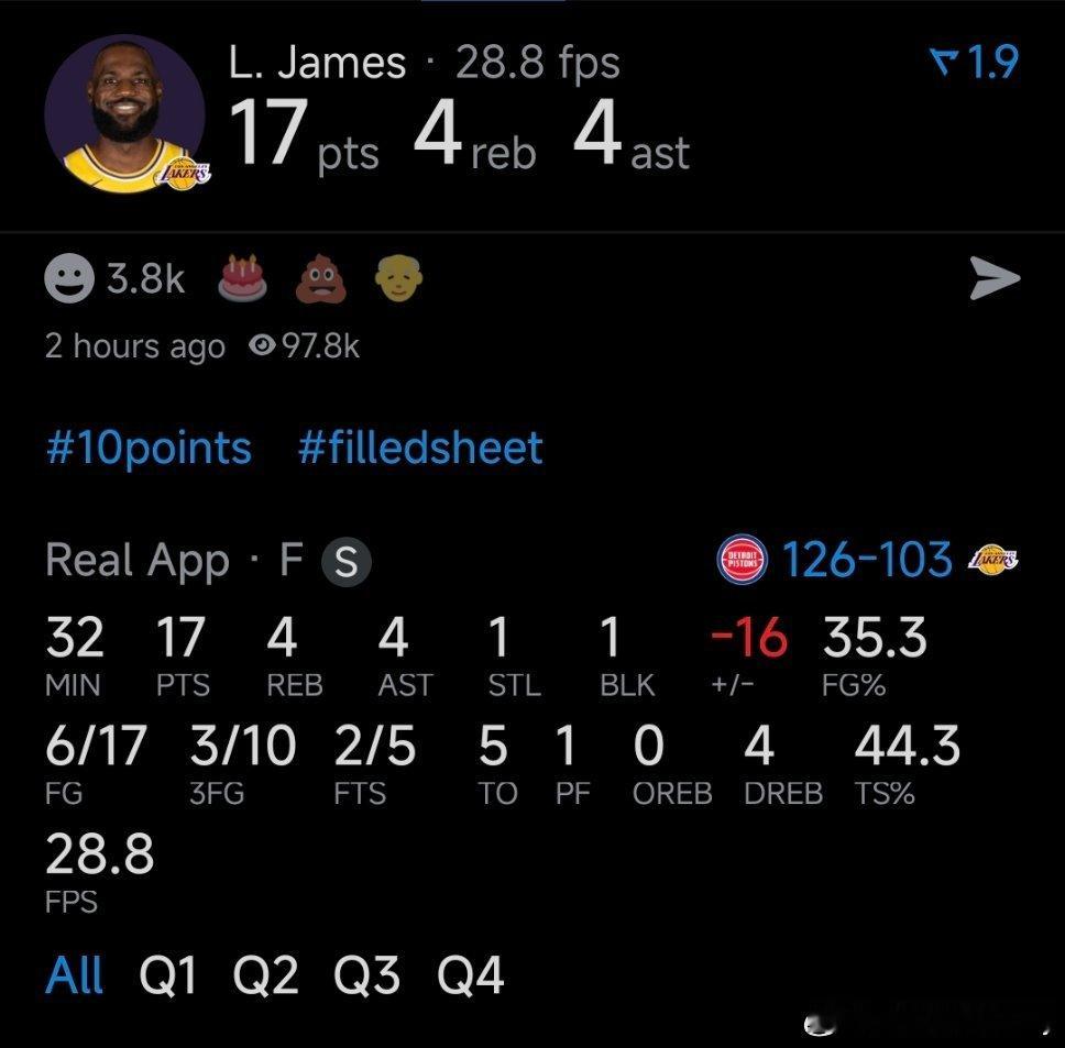 老詹41岁生日快乐,以100分%命中率致敬生日夜。全场17投砍下17分5失误,正负值仅-16。🤔活塞vs湖人詹姆斯41岁生日