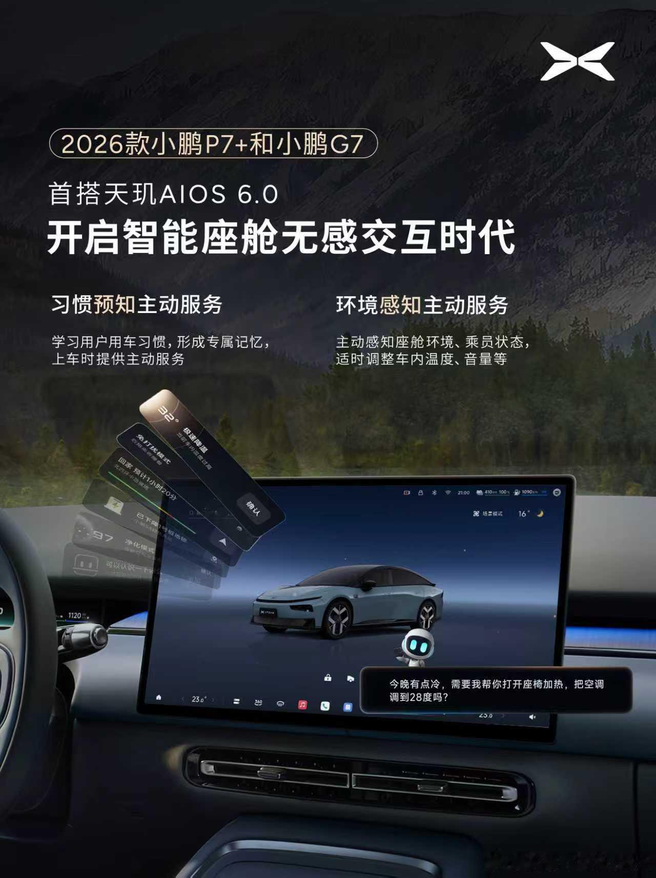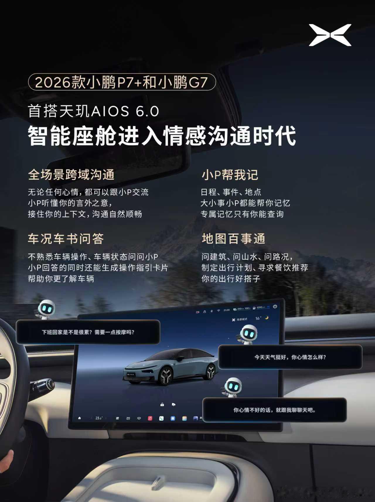接下来小鹏两款新车将首发搭载天玑AIOS 6.0可以重点关注一下,座舱体验这块,小鹏一直做得都不错2026款小鹏P7+和小鹏G7搭载全球最大有效算力750TOPS,是行业首个落地的主动服务座舱,采用行业首个端侧座舱视觉语言大模型。小鹏天玑AIOS 6.0主要特点就是全新界面设计,交互更简洁便利,这个主动服务座舱挺不错的,能够记录用户习惯,无感交互,小P能够实现自由对话,像人一样情感沟通,懂你所需,想你所想。小鹏汽车全球首发主动服务座舱新款小鹏P7+和G7开启智舱无感交互时代
