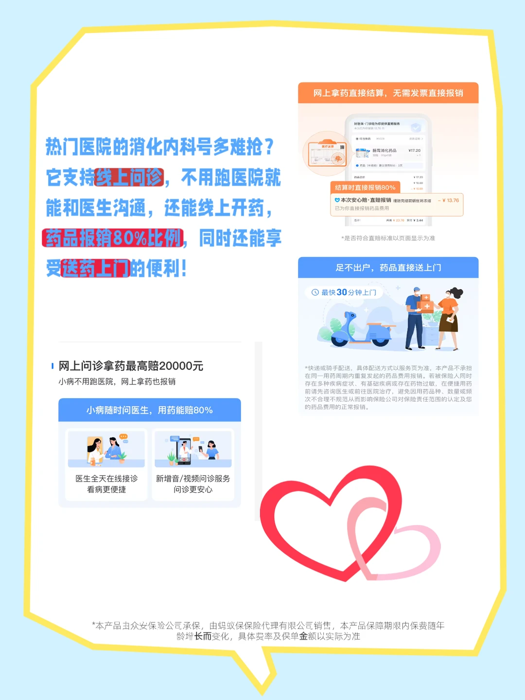 👉不怕没时间去医院: 去趟医院难请假没时间,好不容易去了排队检查一天时间没了,门诊险有线上问诊服务,不用跑医院就能和医生沟通,还能直接线上开药,药品报销80%比例,最快半小时就送到了