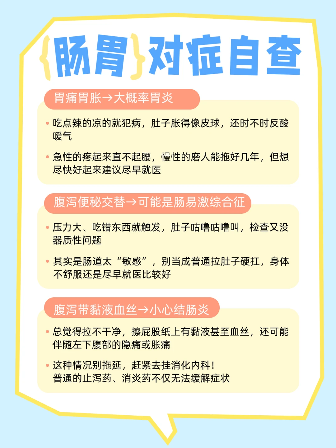 宝子们!肚子不舒服别再瞎吃胃药啦! 胃痛胃胀、反酸烧心、便秘腹泻…这些信号其实是肠胃在喊救命! 赶紧对照图2,进行症状自查,分清情况再对症处理。同时还应该注意护胃养胃(可参考图3) 胃痛胃胀→大概率胃炎 吃点辣的凉的就犯病,肚子胀得像皮球,还时不时反酸嗳气 急性的疼起来直不起腰,慢性的磨人能拖好几年 💥 餐后/空腹疼→警惕胃溃疡/十二指肠溃疡 胃溃疡:吃完半小时准时疼,疼到下次吃饭才缓解 十二指肠溃疡:饿的时候疼到冒冷汗,吃点东西立马舒服 ⚠️ 出现黑便一定要立刻就医! 💥 腹泻便秘交替→可能是肠易激综合征 压力大、吃错东西就触发,肚子咕噜咕噜叫,检查又没器质性问题 其实是肠道太“敏感”,别当成普通拉肚子硬扛 温馨提示:出现以上症状,别自己瞎买药!先去正规医院就诊检查,明确病因再治疗 如果担心医疗费用高,可以提前备好支付宝上的好医保·门诊险,省不少钱不说还非常方便⬇️